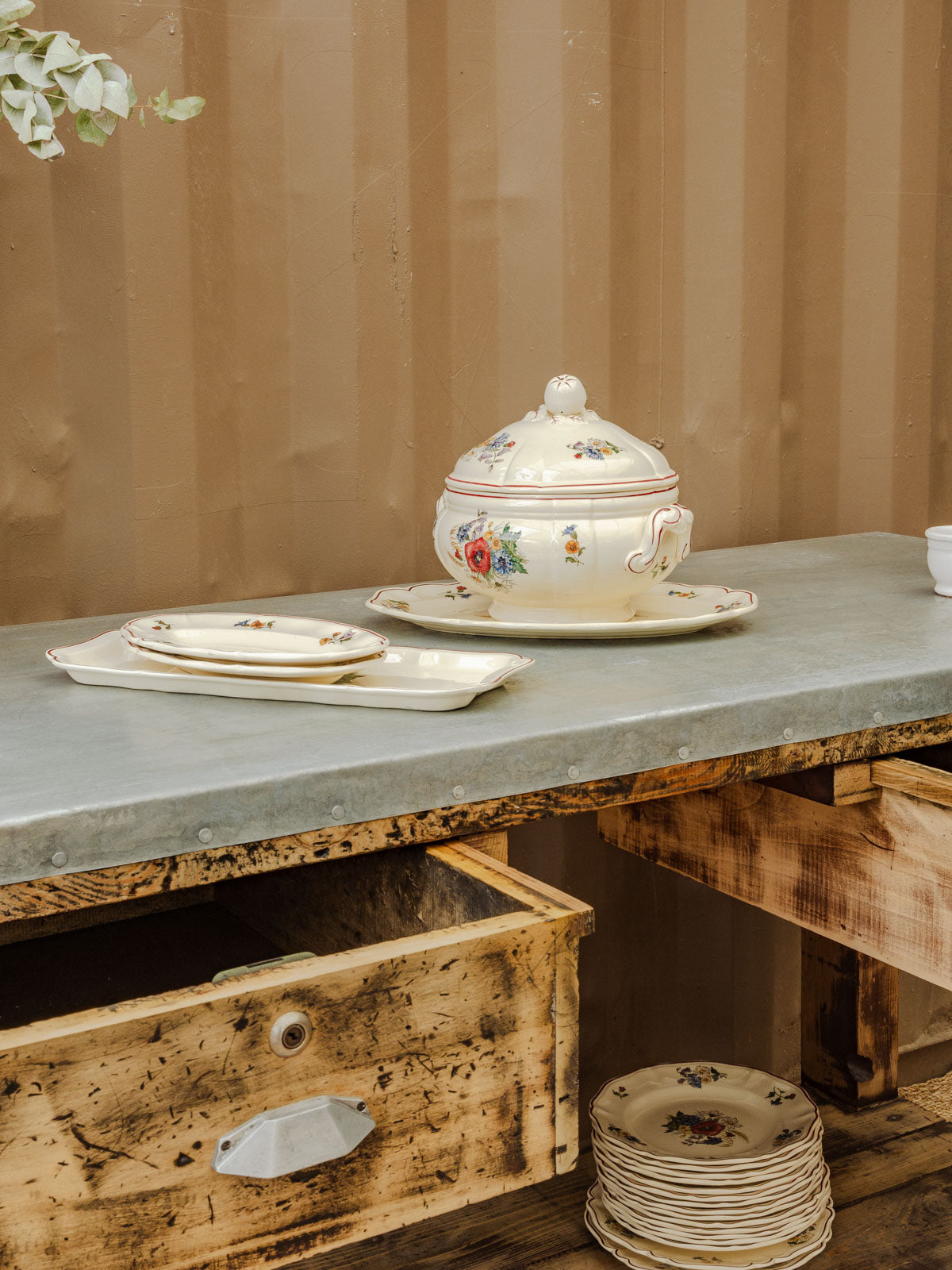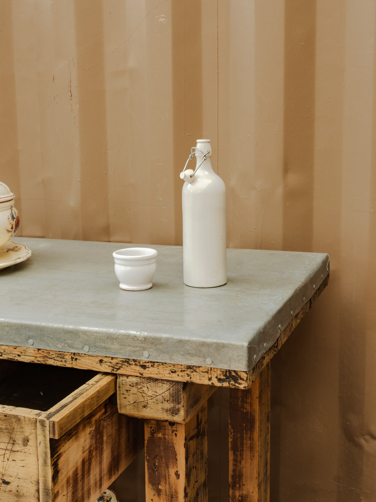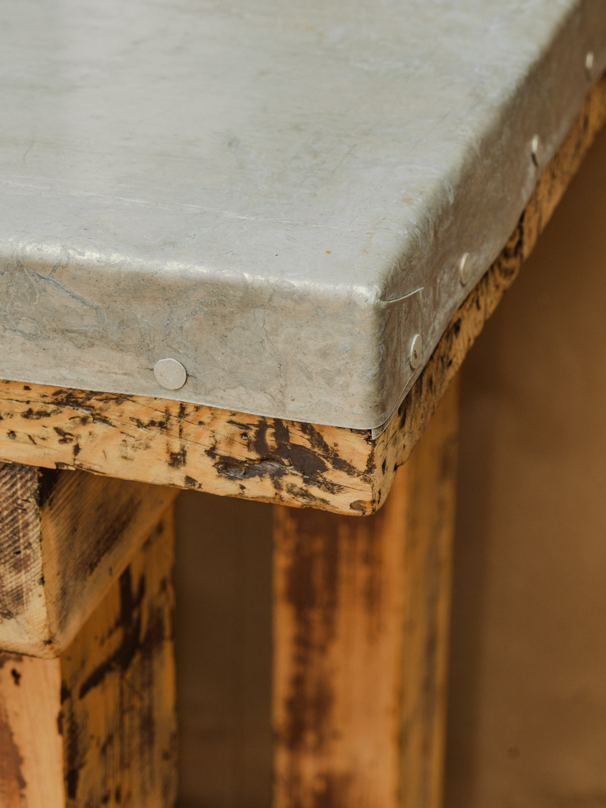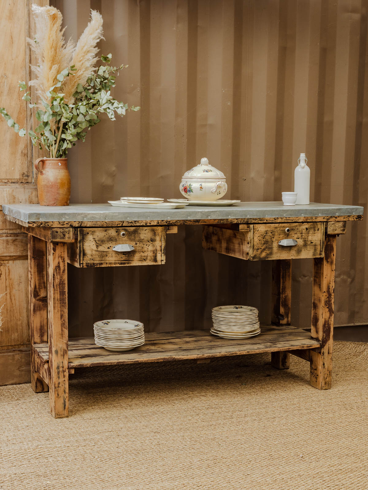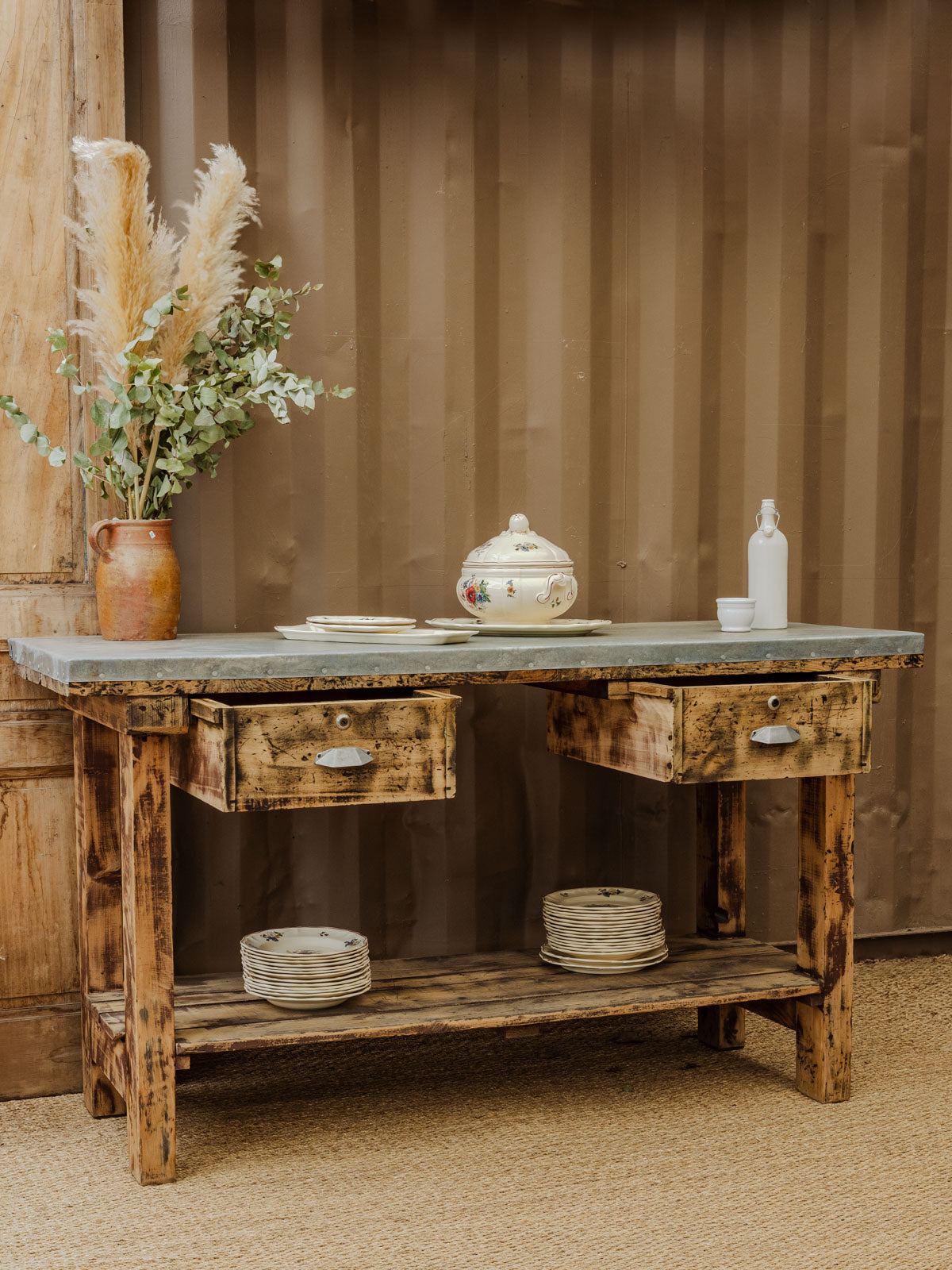 Discover this charming antique workshop cabinet, ideal for adding a touch of authenticity to your home. Its zinc-covered top gives it a timeless character, while its pine frame ensures sturdiness and durability. Featuring two practical drawers and a lower shelf, this versatile piece can also be used as a console table, easily fitting into various decorating styles. A must-have for a space that is both functional and elegant.