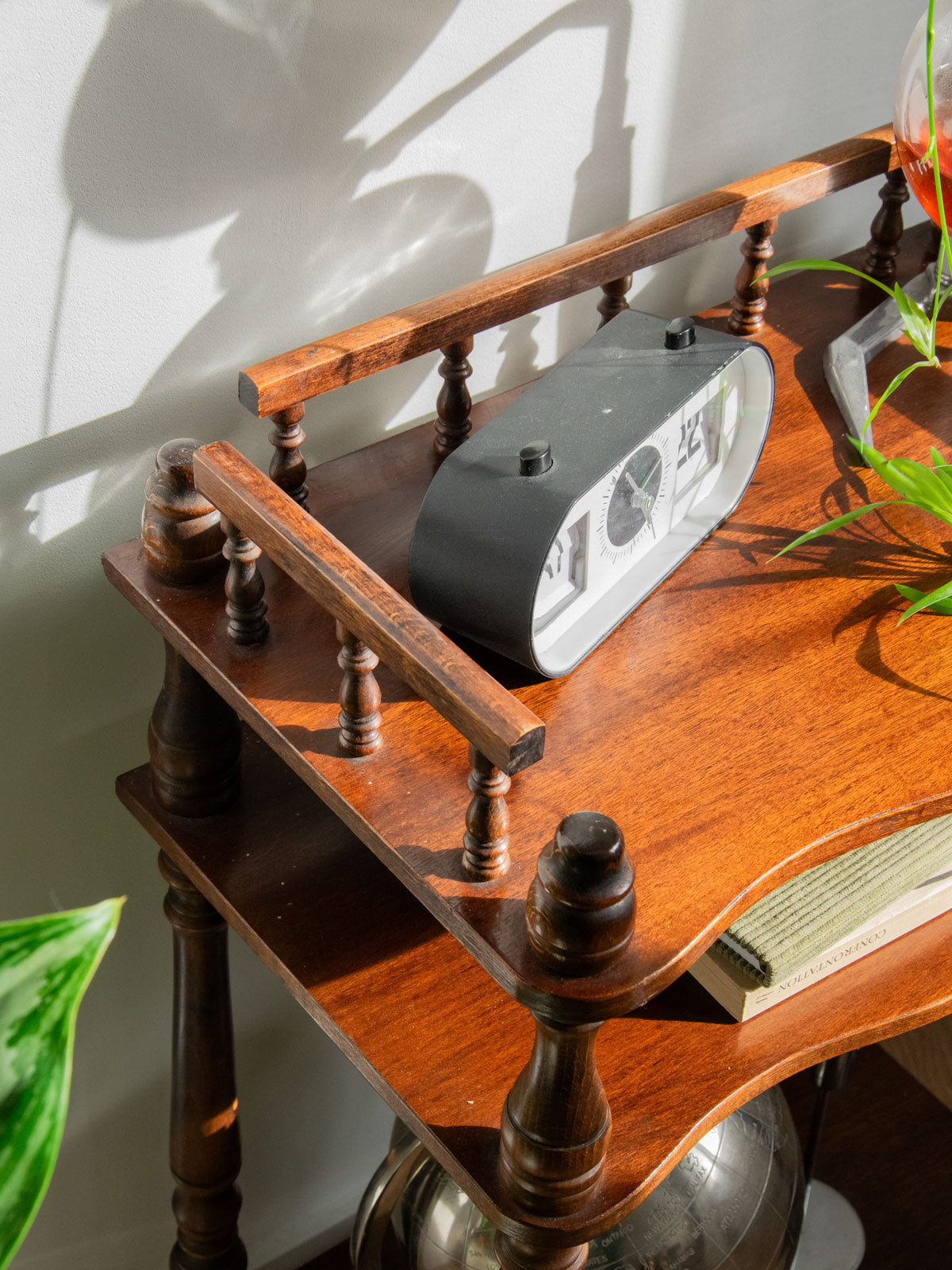 Discover our elegant dark wood side table, enhanced by delicate carvings. With its three curved shelves, it combines aesthetics and functionality, offering the perfect space to display your books, decorative objects, or souvenirs. This piece adds a touch of sophistication to any interior, while allowing you to organize your space in a chic and practical way. Add a touch of elegance to your décor with this magnificent carved wood piece.