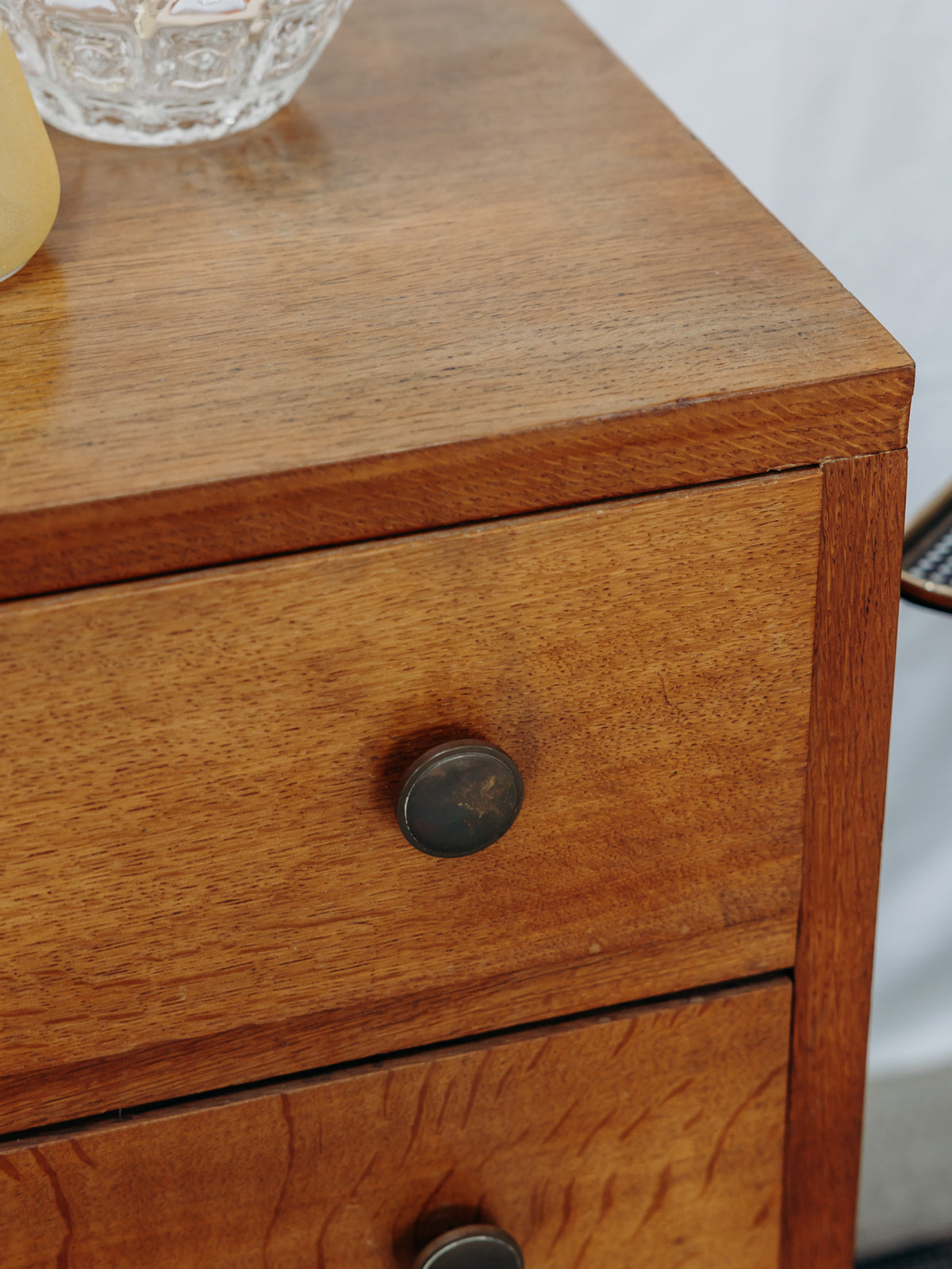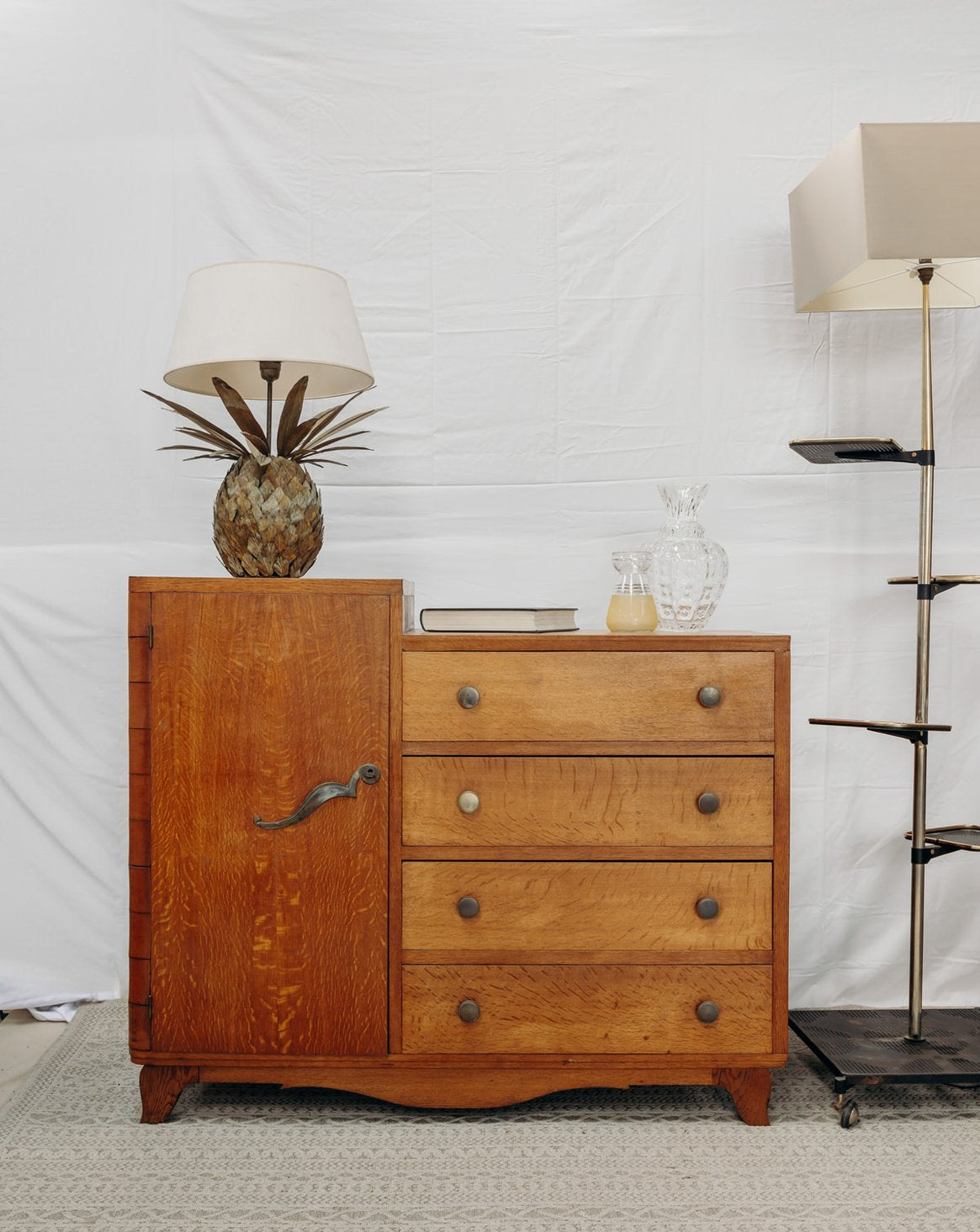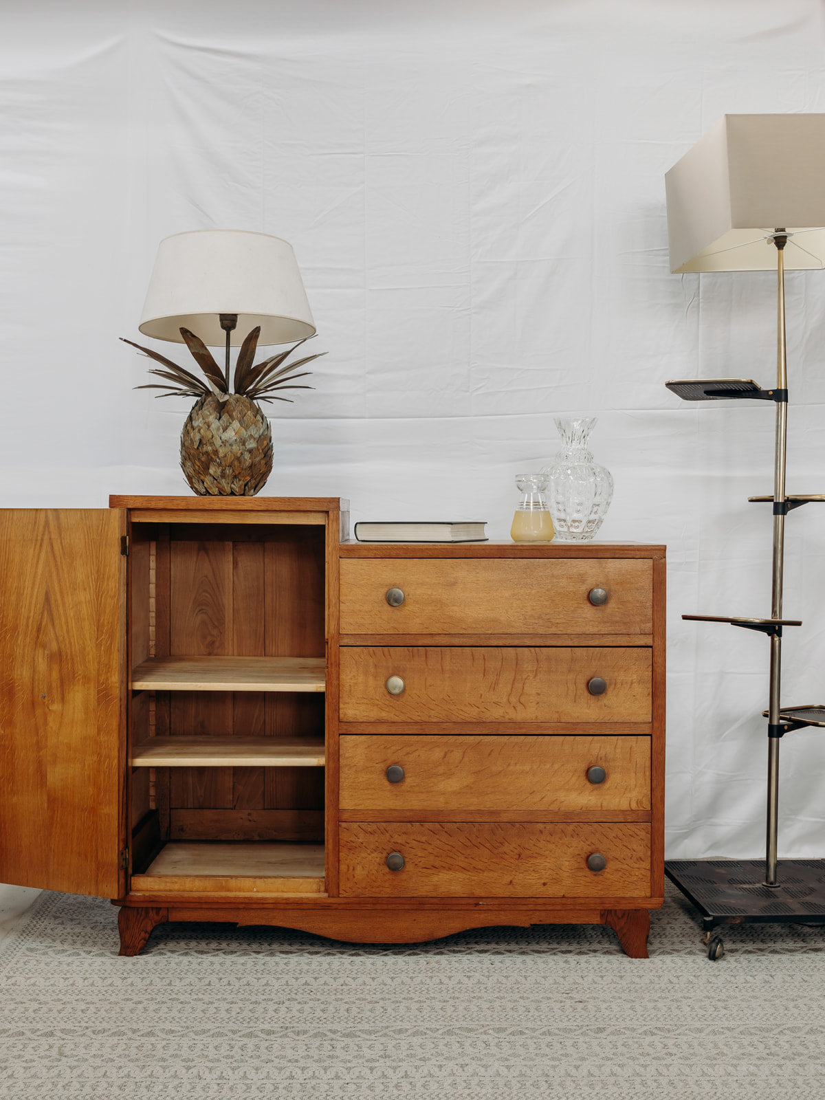 Découvrez la commode vintage des années 90, conçue avec soin pour allier style et fonctionnalité. Dotée de quatre tiroirs spacieux, elle offre un espace de rangement pratique tout en ajoutant une touche rétro à votre intérieur. Ses petits pieds légèrement surélevés et ses poignées rondes soulignent son charme authentique. Parfaite pour la chambre ou le salon, cette commode deviendra rapidement un élément indispensable de votre décoration.