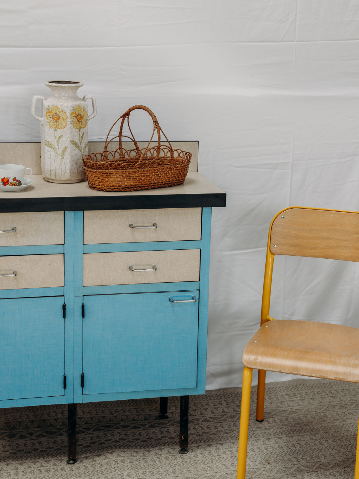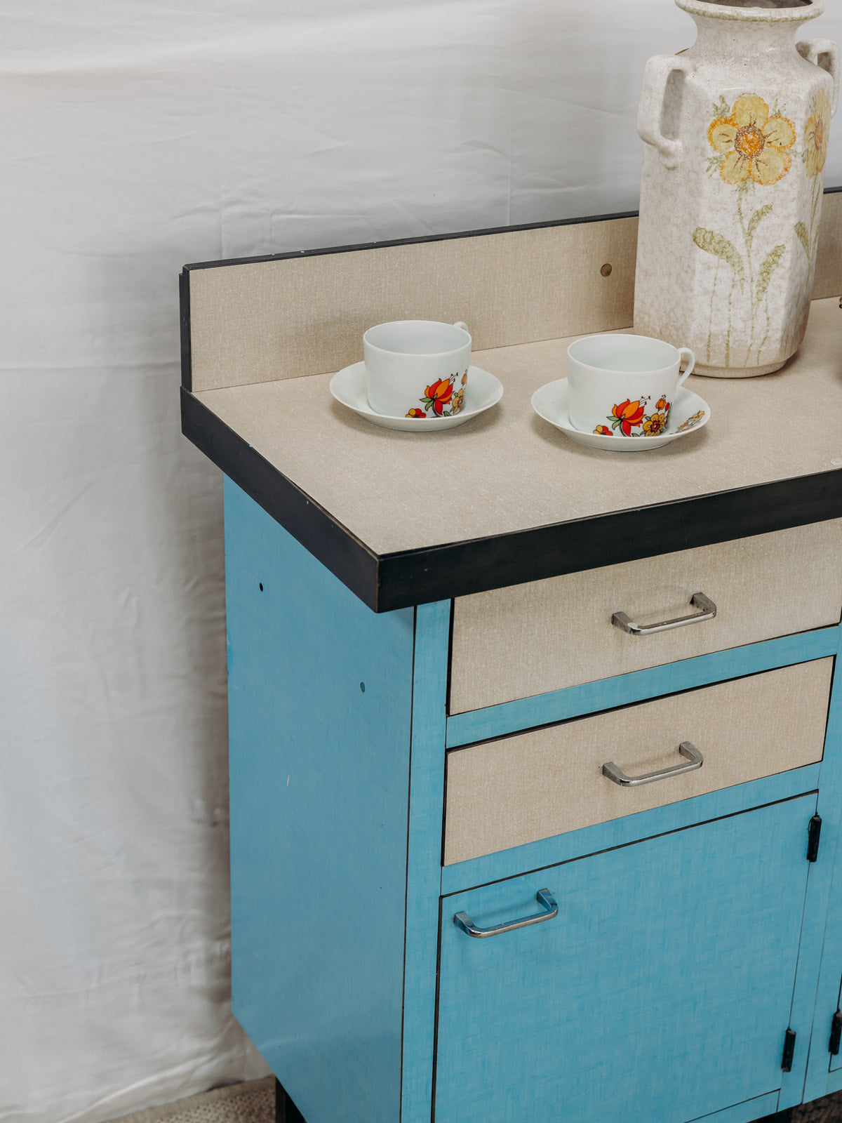 Ajoutez une touche rétro à votre intérieur avec ce buffet Formica bleu, alliant style et fonctionnalité. Équipé de 4 tiroirs et de 2 placards spacieux, il offre un ample espace de rangement pour vos objets du quotidien. Les 5 pieds en métal assurent une stabilité optimale tout en apportant une note moderne. Ses rebords en haut ajoutent une finition soignée, faisant de ce meuble un atout indéniable pour votre décoration.