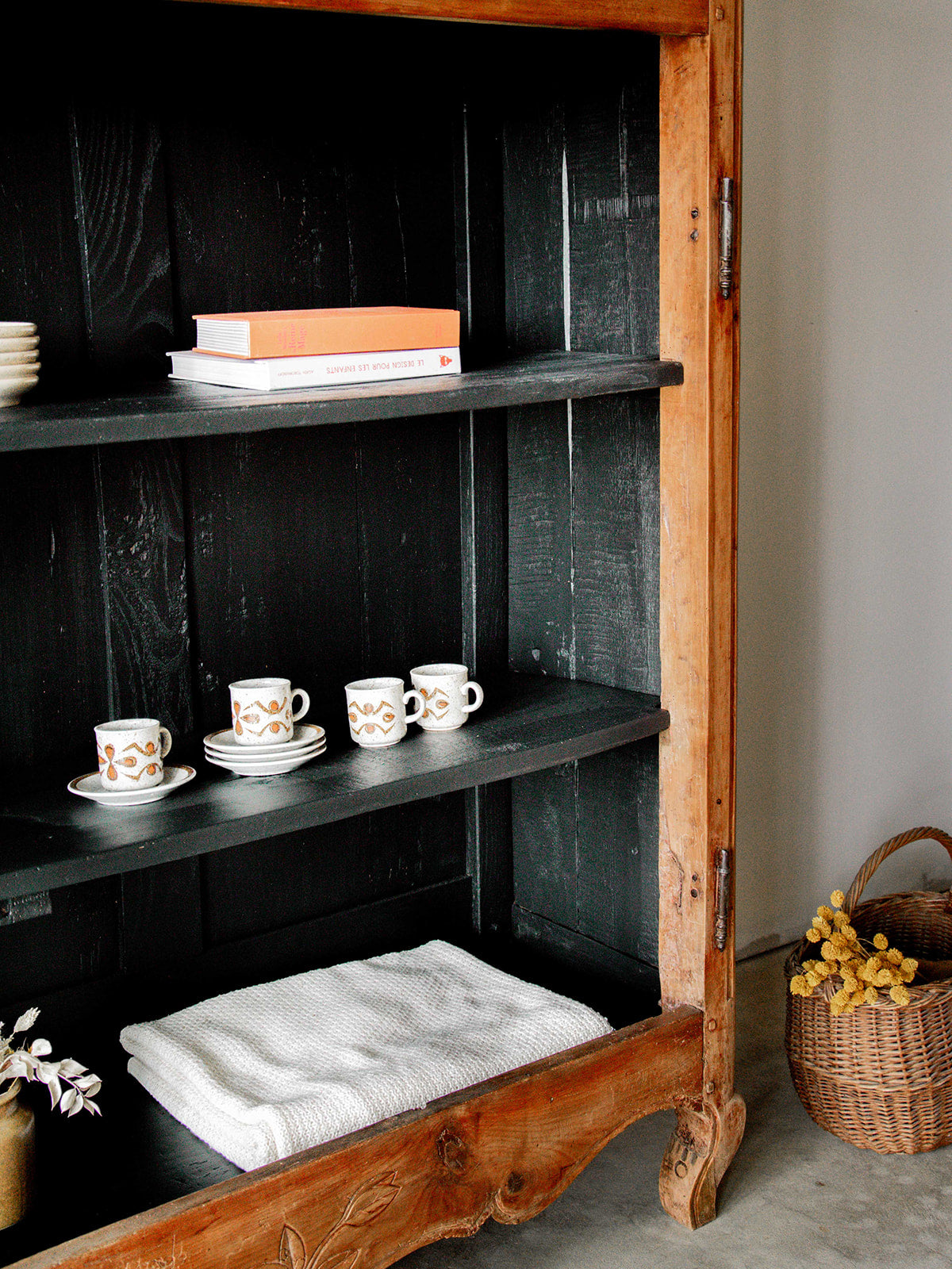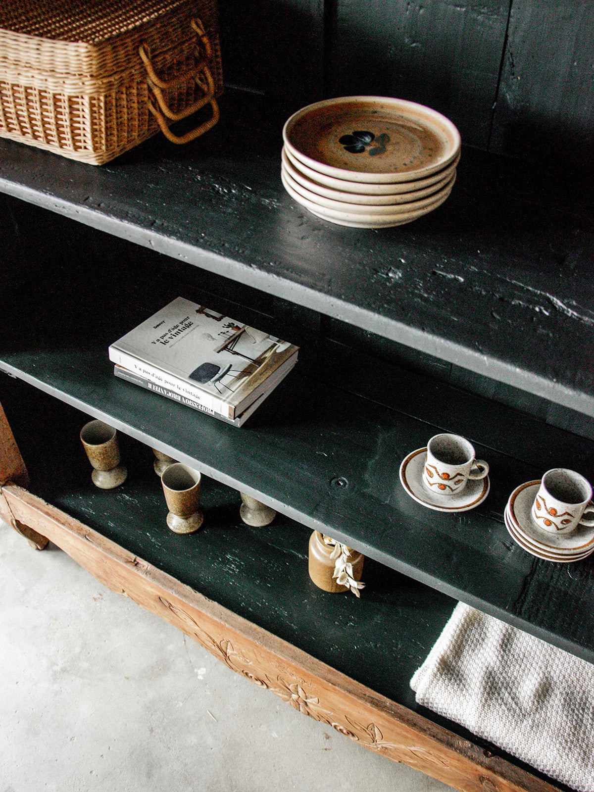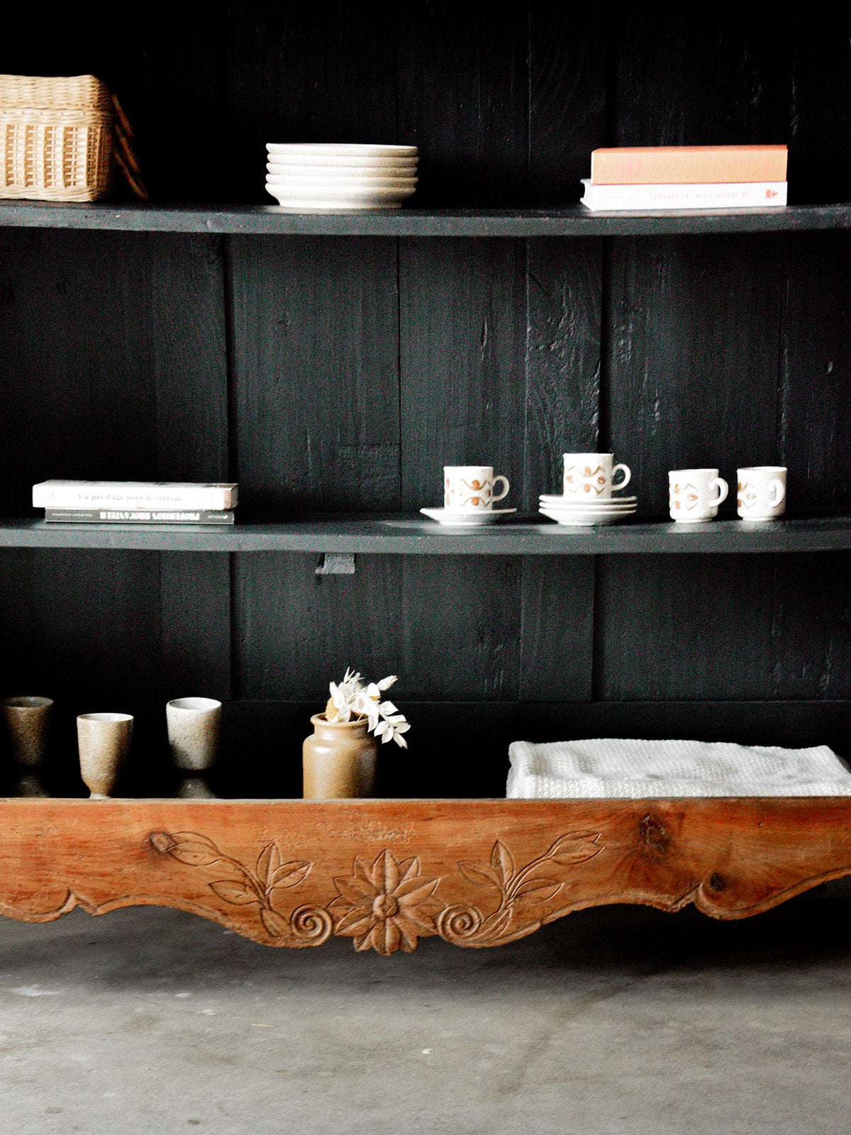 Discover this large, stylish storage unit, entirely repainted in charcoal black inside. Its carved wooden structure and curved legs give it an elegant and timeless look. Featuring numerous niches, it offers ample storage space while adding character to your home. A unique piece that combines practicality and aesthetics with distinction.