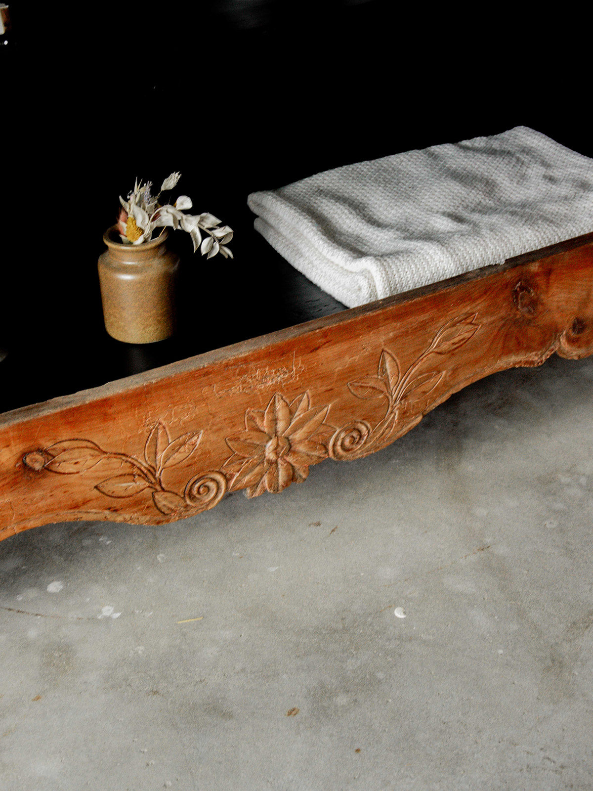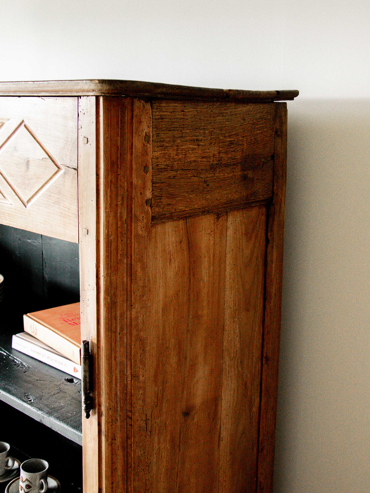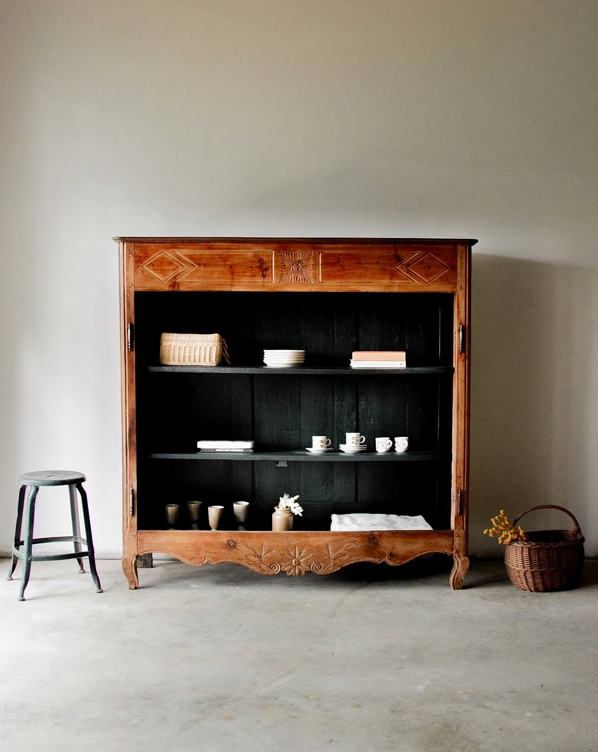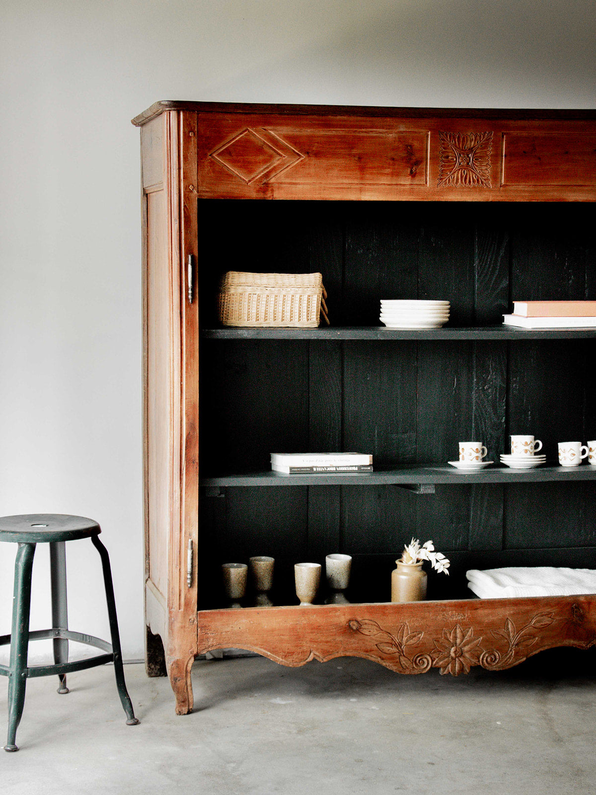Discover this large, stylish storage unit, entirely repainted in charcoal black inside. Its carved wooden structure and curved legs give it an elegant and timeless look. Featuring numerous niches, it offers ample storage space while adding character to your home. A unique piece that combines practicality and aesthetics with distinction.