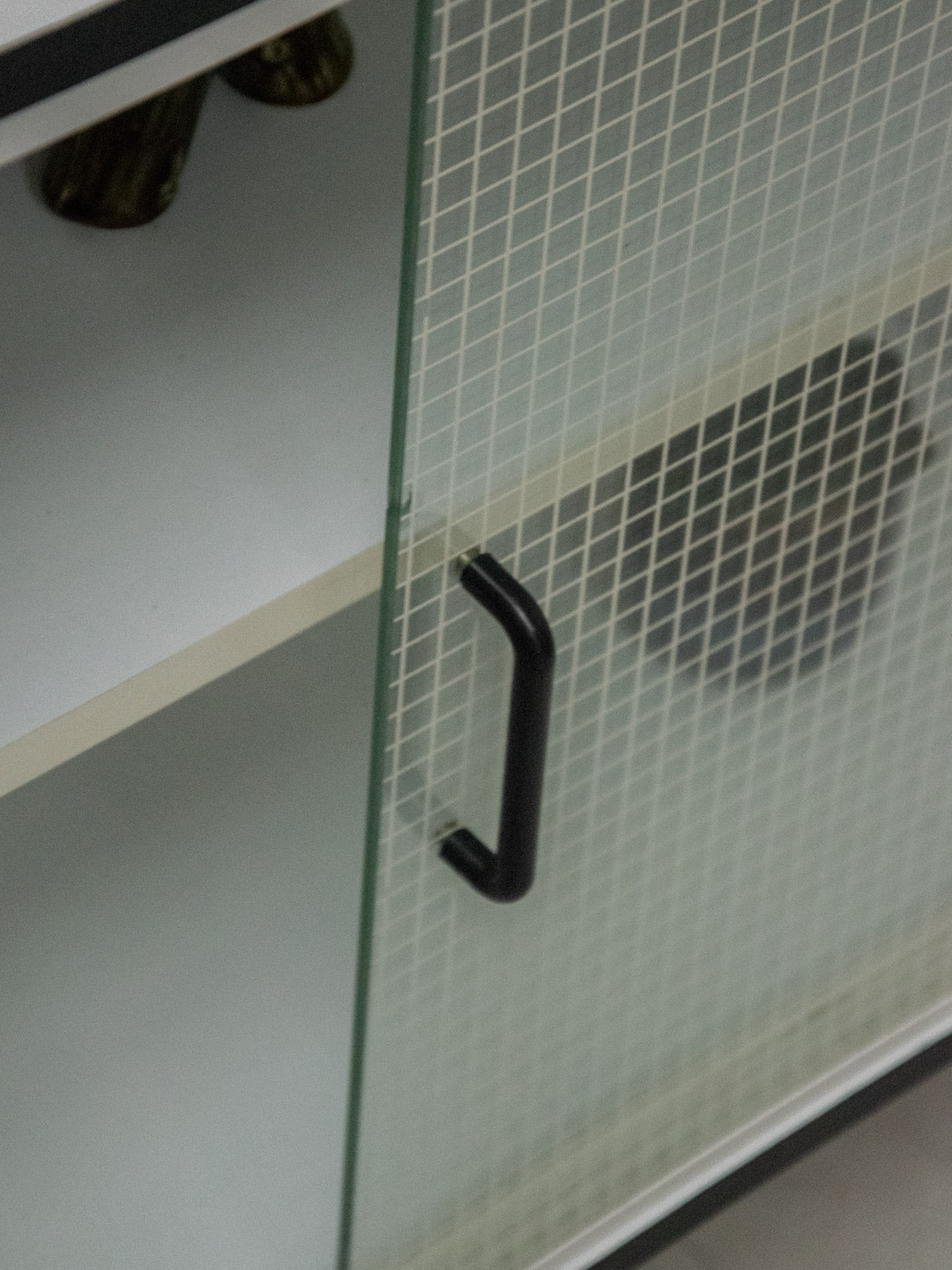 Bring a touch of elegance to your home with this small, modernist-style sideboard. Featuring a glass door, it combines the chic of black and white Formica with a black metal base, ideal for a contemporary design. Although this piece of furniture shows some signs of wear and tear, it's still a charming addition to your storage space. A perfect choice for combining functionality and aesthetics! Removable interior shelf.