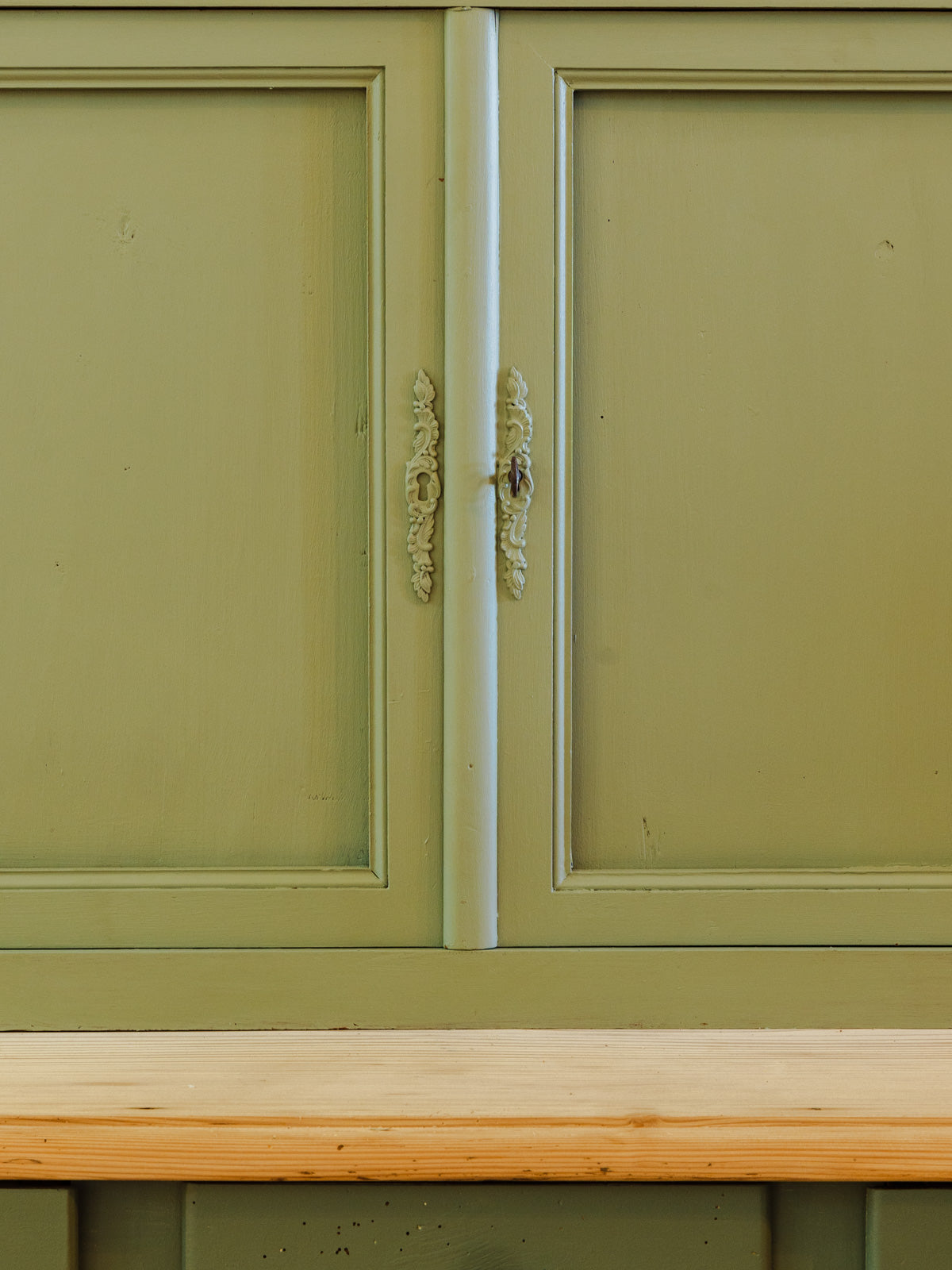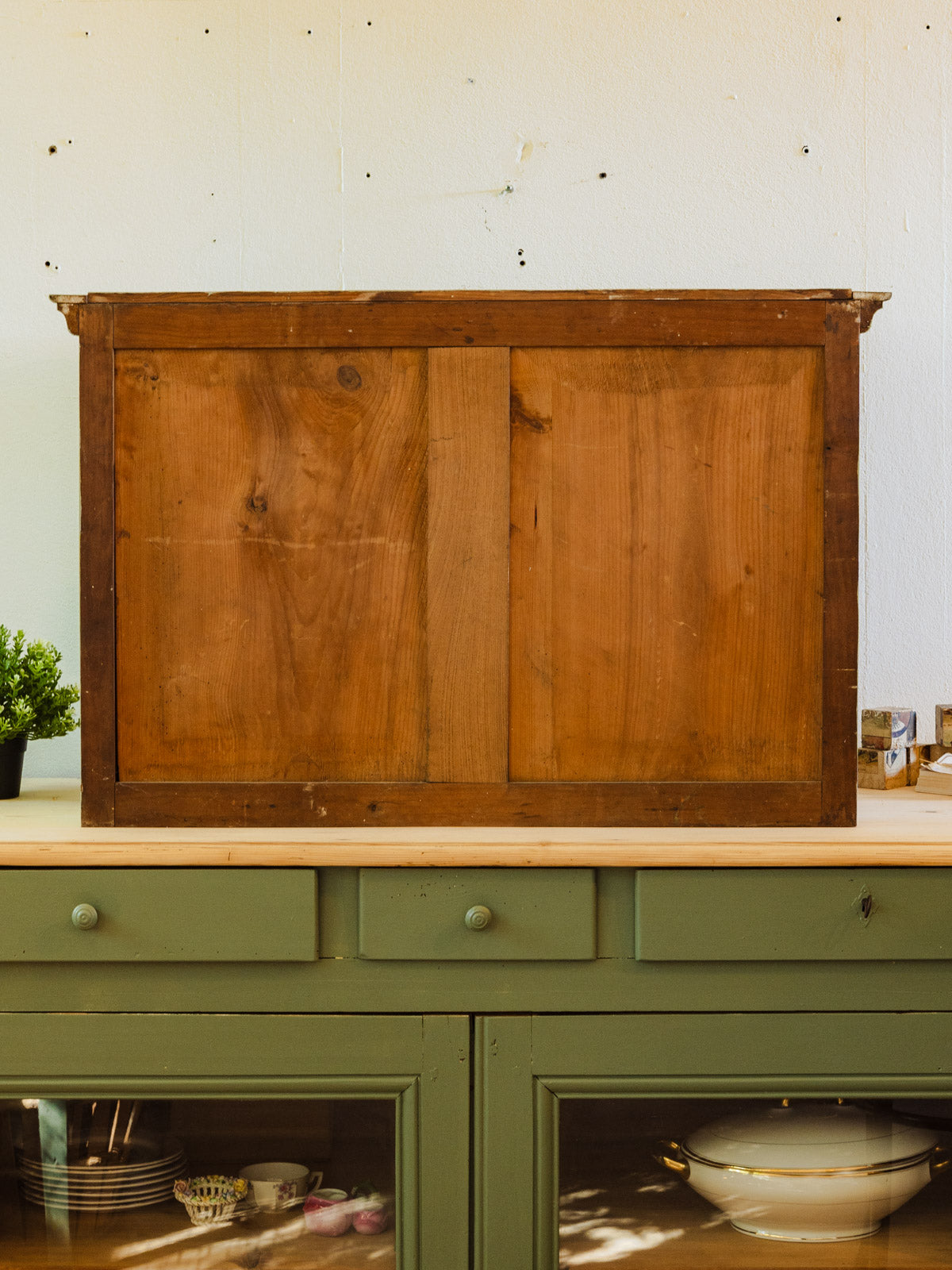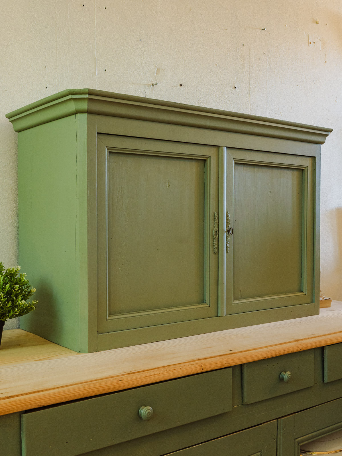 Bring a touch of elegance to your home with this vintage pine cabinet top, carefully repainted in green. Featuring two doors and a shelf, it combines functionality and aesthetics. Its carved wood details add a timeless charm, perfect for enhancing your decor. Ideal for a living room or bedroom, this piece will add a touch of character to your space.