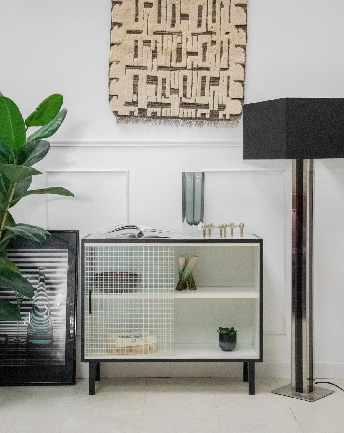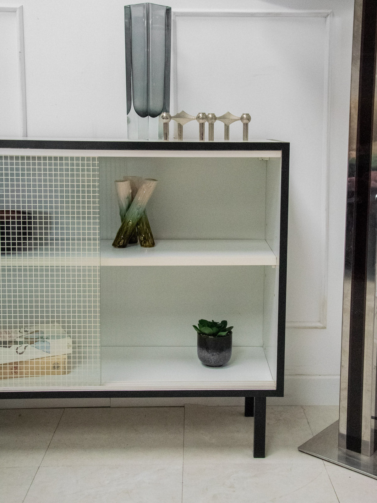 Bring a touch of elegance to your home with this small, modernist-style sideboard. Featuring a glass door, it combines the chic of black and white Formica with a black metal base, ideal for a contemporary design. Although this piece of furniture shows some signs of wear and tear, it's still a charming addition to your storage space. A perfect choice for combining functionality and aesthetics! Removable interior shelf.