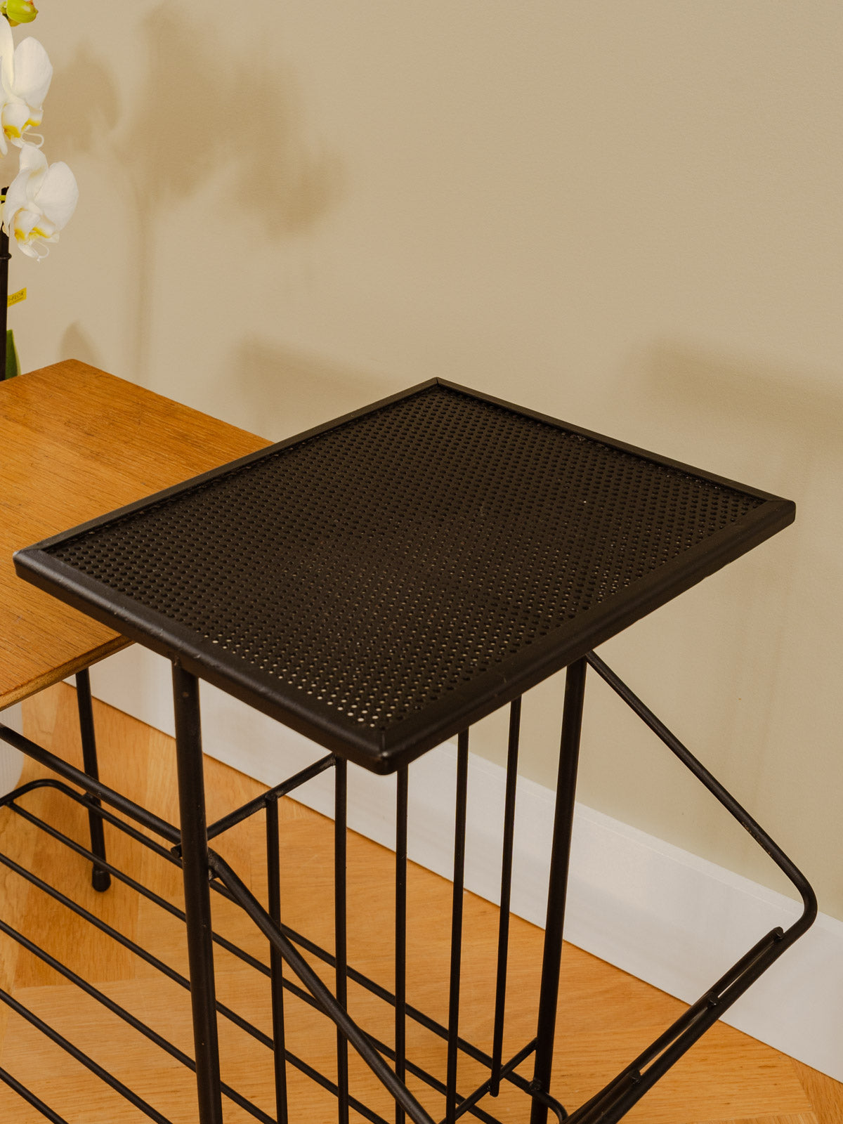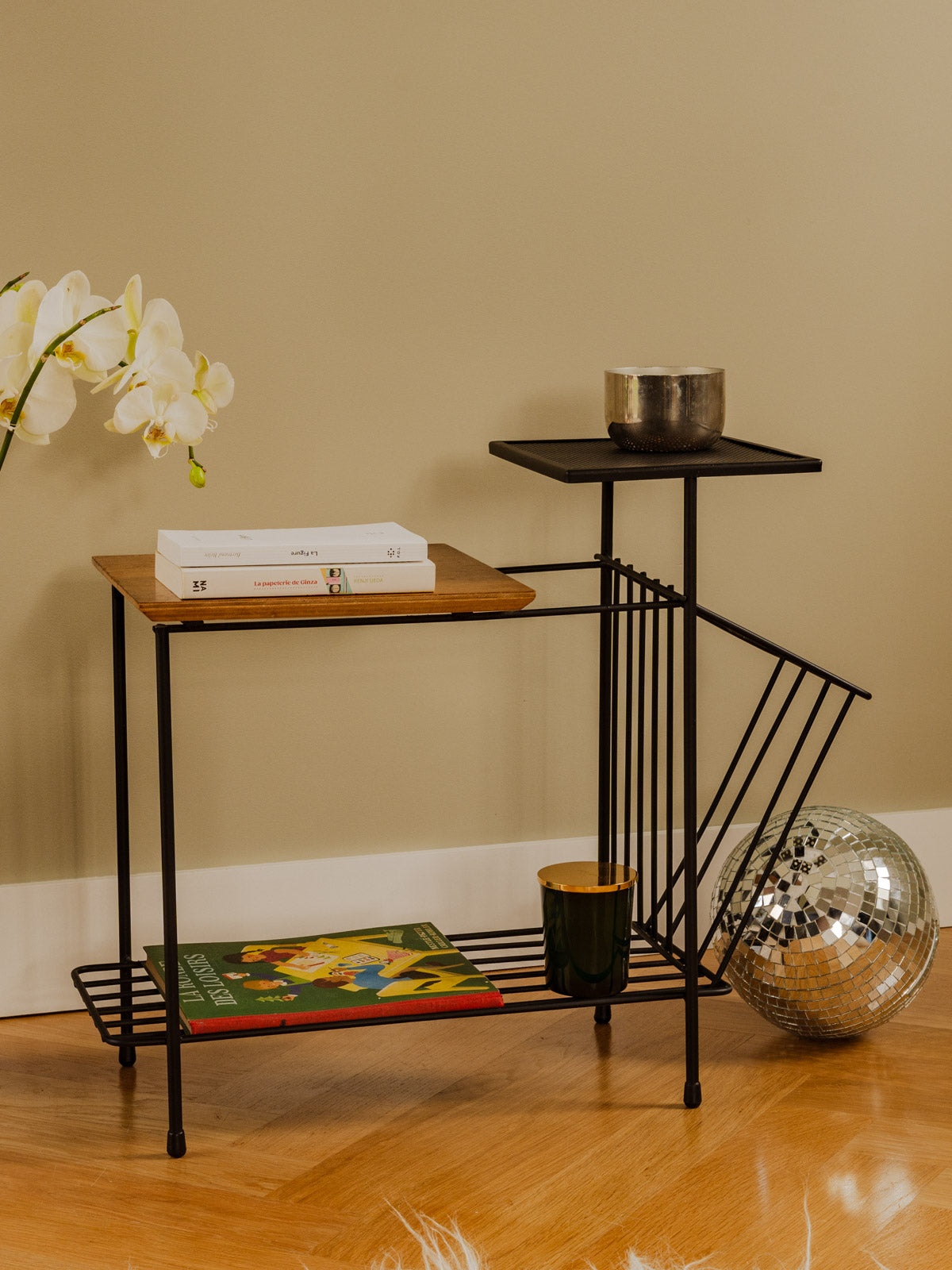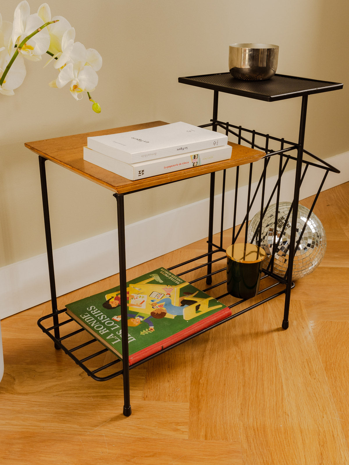 Add a touch of originality to your home with this versatile side table. Featuring three tops made of perforated metal, wood, and metal rods, it creates a true focal point in your decor. Practical, it also offers clever storage space for your magazines and books. Whether used as a sofa end table, side table, or bedside table, this unique piece promises to combine style and functionality, while displaying some traces of time that give it an undeniable charm.