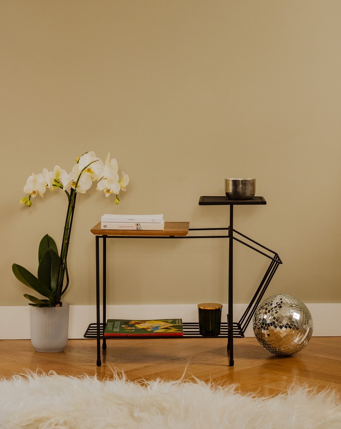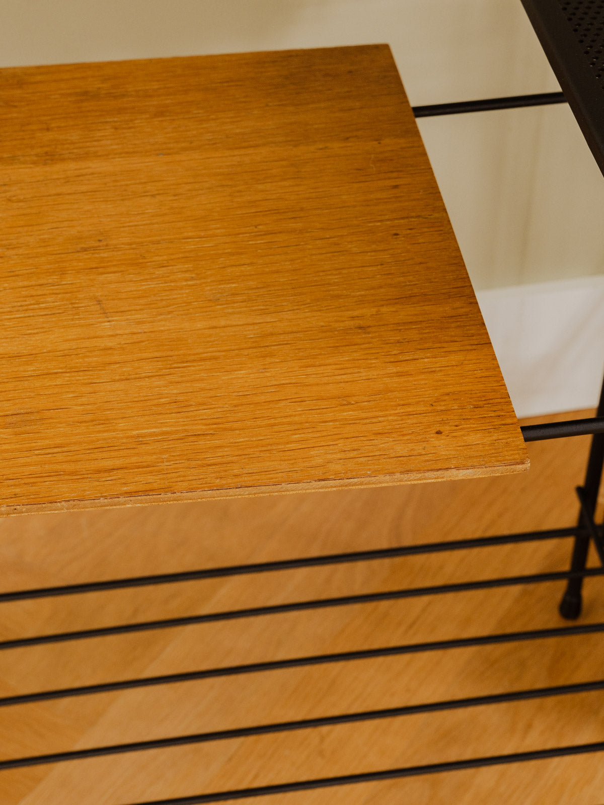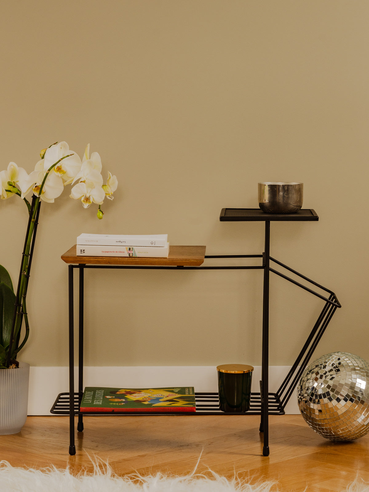 Add a touch of originality to your home with this versatile side table. Featuring three tops made of perforated metal, wood, and metal rods, it creates a true focal point in your decor. Practical, it also offers clever storage space for your magazines and books. Whether used as a sofa end table, side table, or bedside table, this unique piece promises to combine style and functionality, while displaying some traces of time that give it an undeniable charm.
