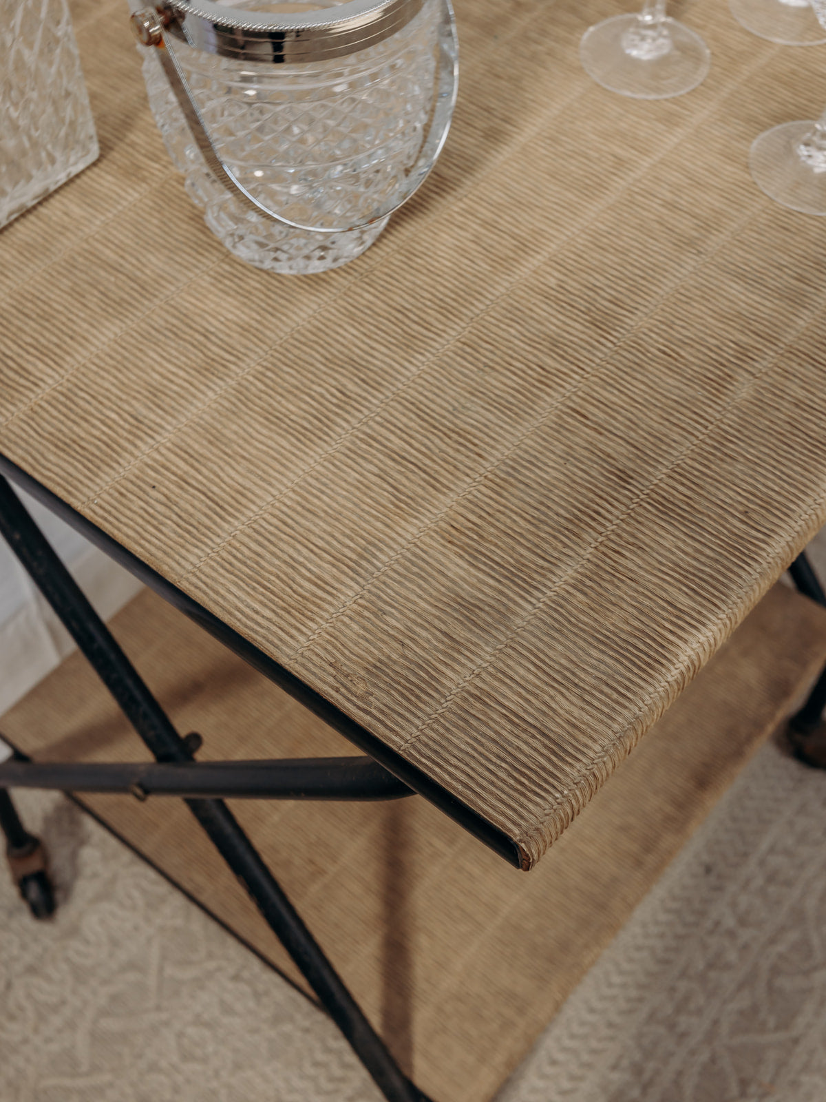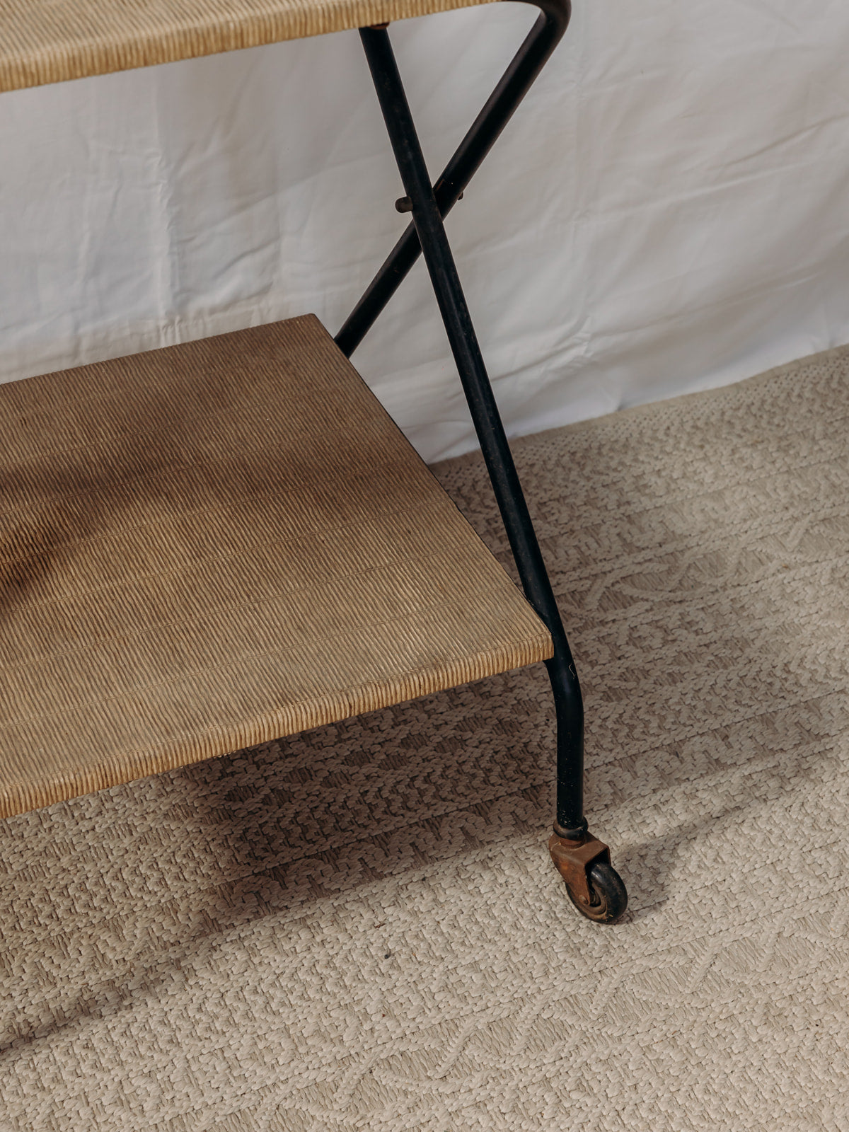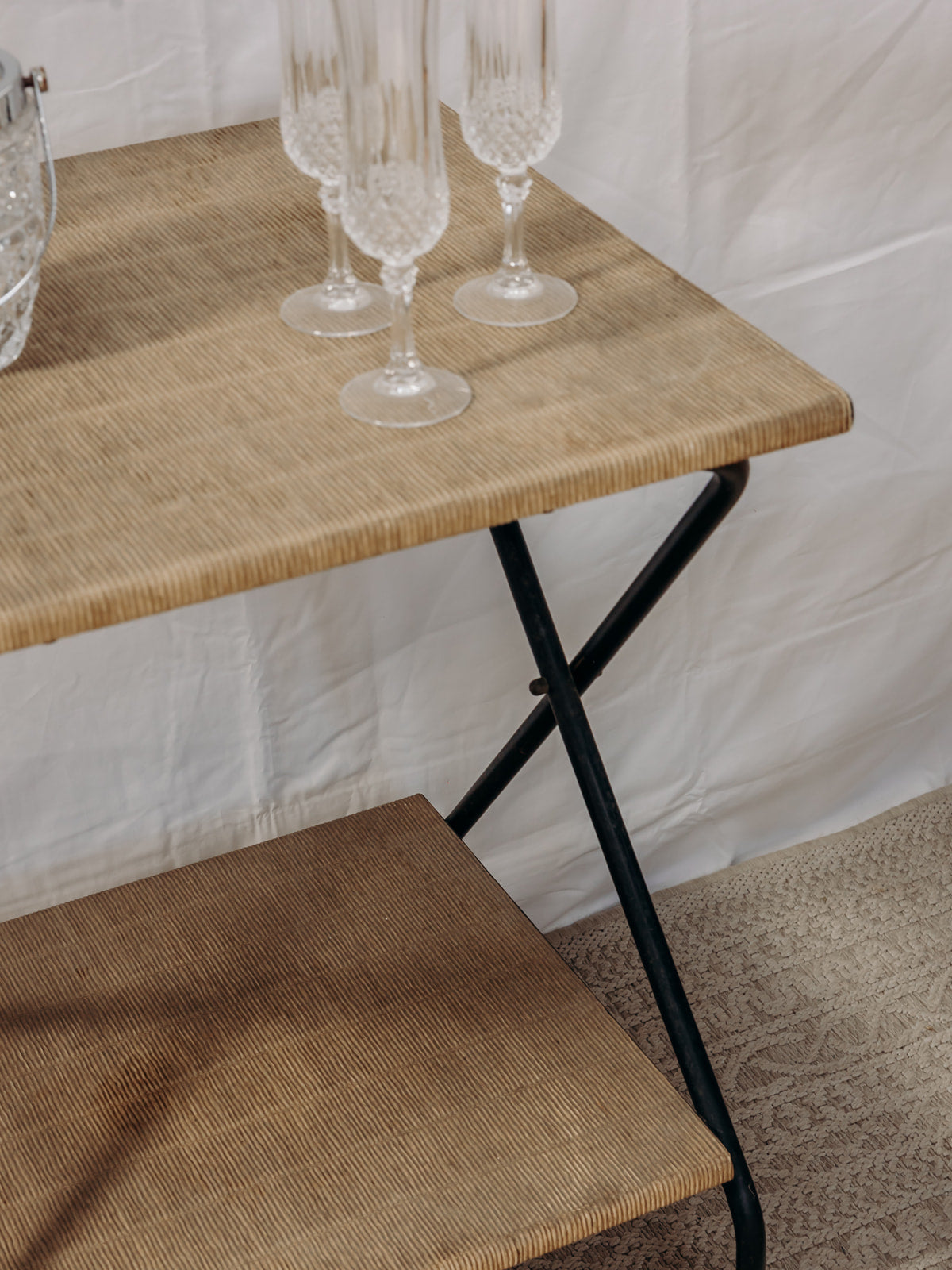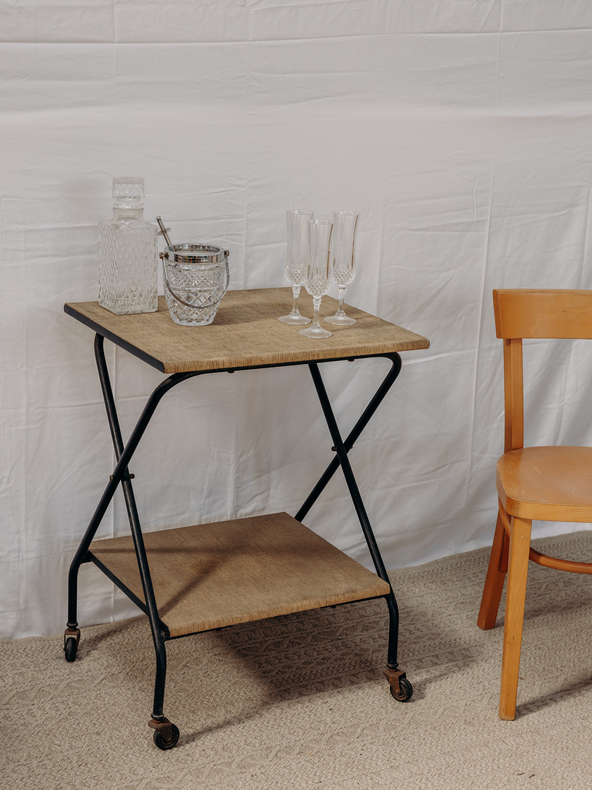 Discover this charming metal trolley on wheels, emblematic of the 50s and 60s. With its two trays covered in vintage canvas, it will bring a retro touch to your interior. Its rusty patina gives it a unique character, while the sound of its wheels testifies to its authenticity. Perfect for serving your appetizers or as an occasional piece of furniture, this trolley will appeal to lovers of eclectic decor.