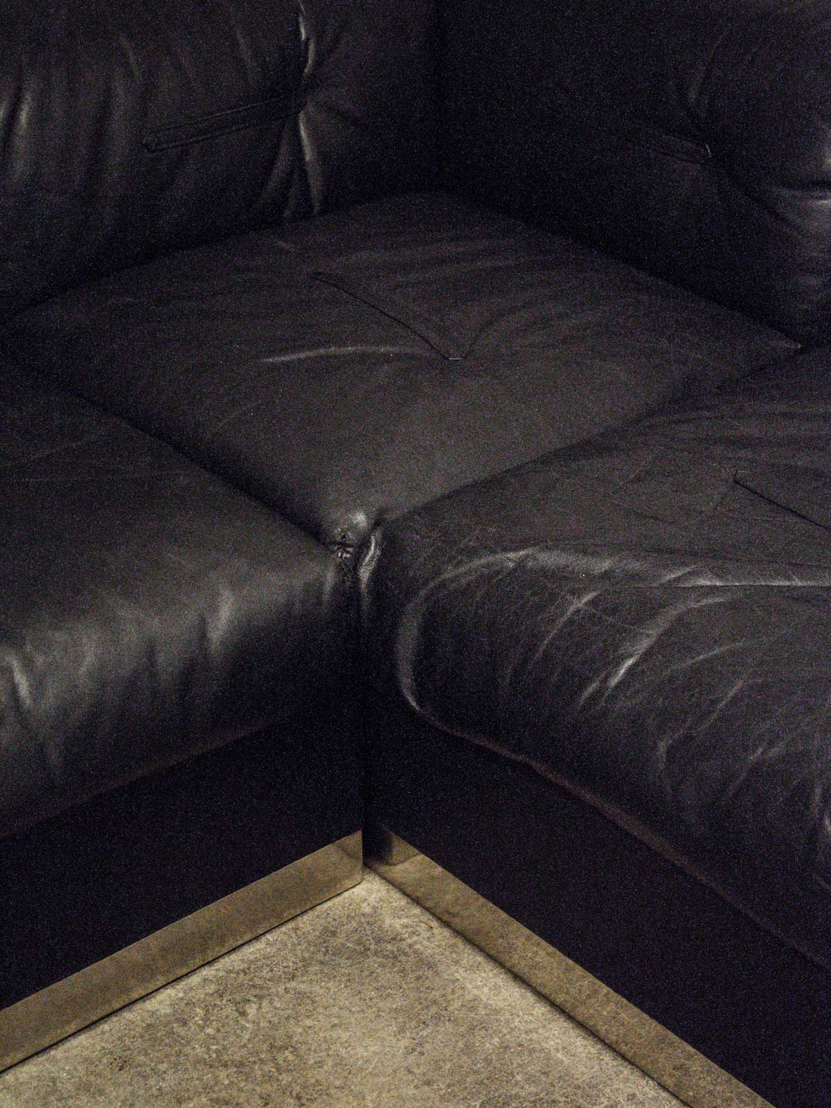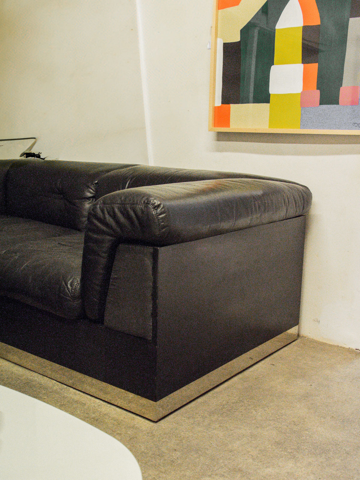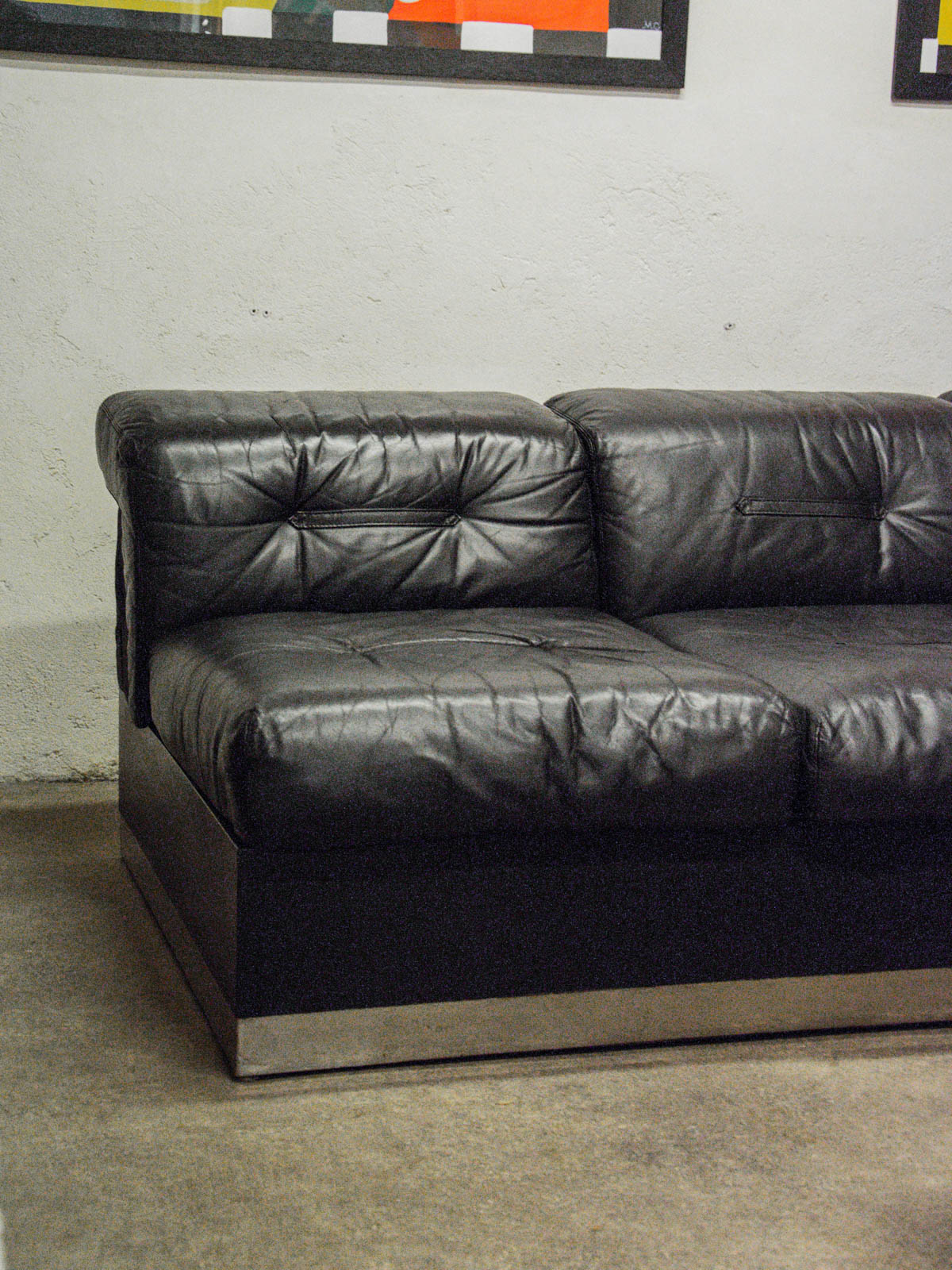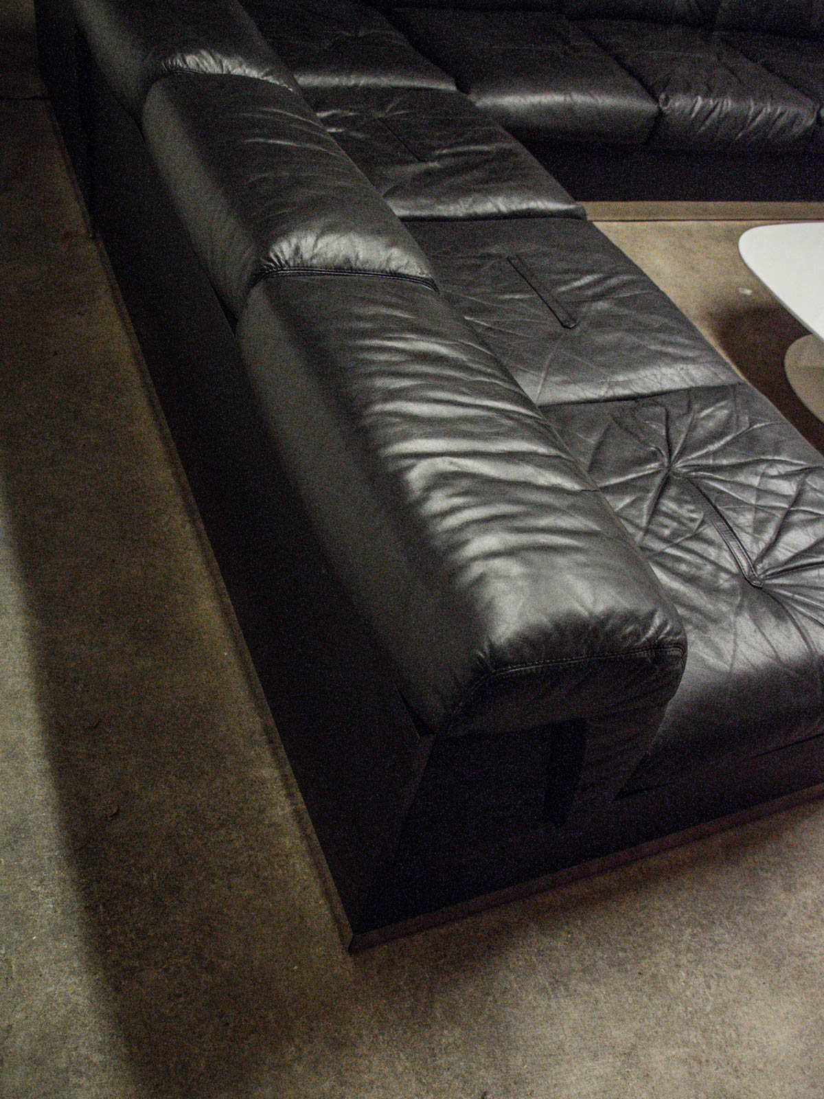 Discover this long modular black leather bench/sofa from the 1970s, composed of several modules that can be freely arranged to create a custom living room. The structure is made of matte black lacquered wood, with an aluminum base surrounding the entire belt. Inspired by the spirit of Jacques Charpentier, Roche Bobois and designer Giorgio Montani, some cushions show signs of wear on the leather.