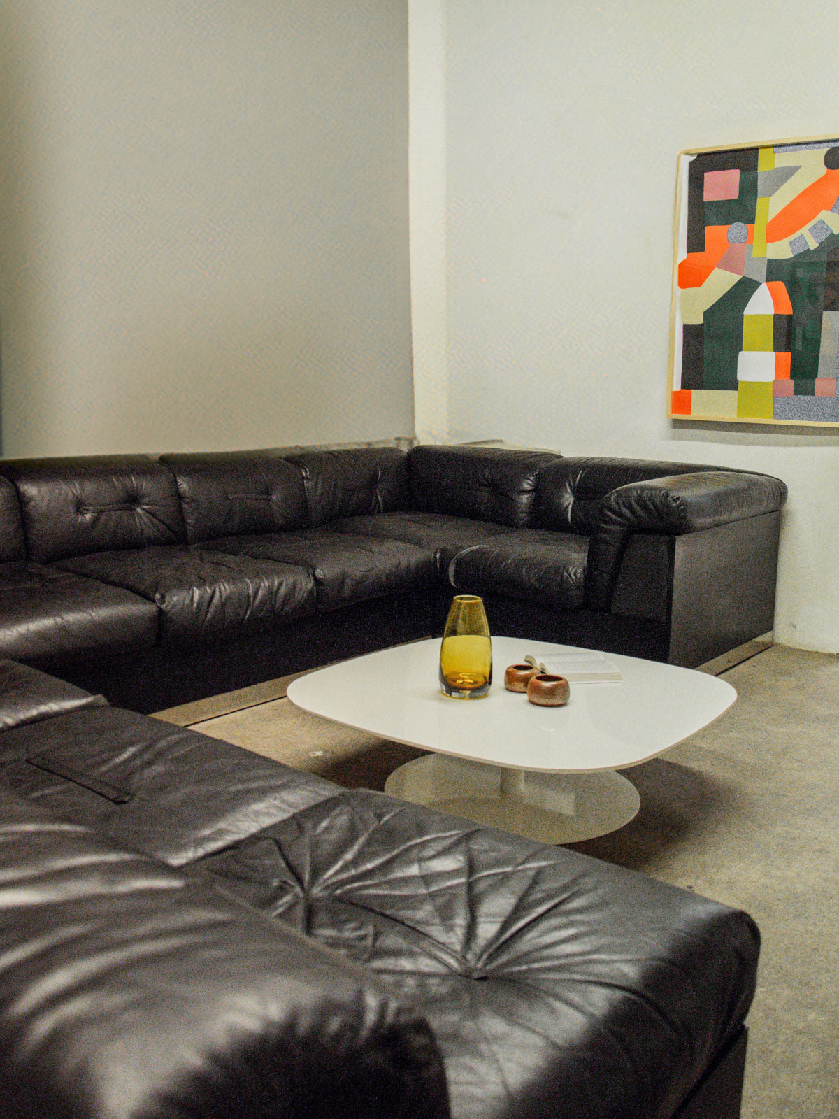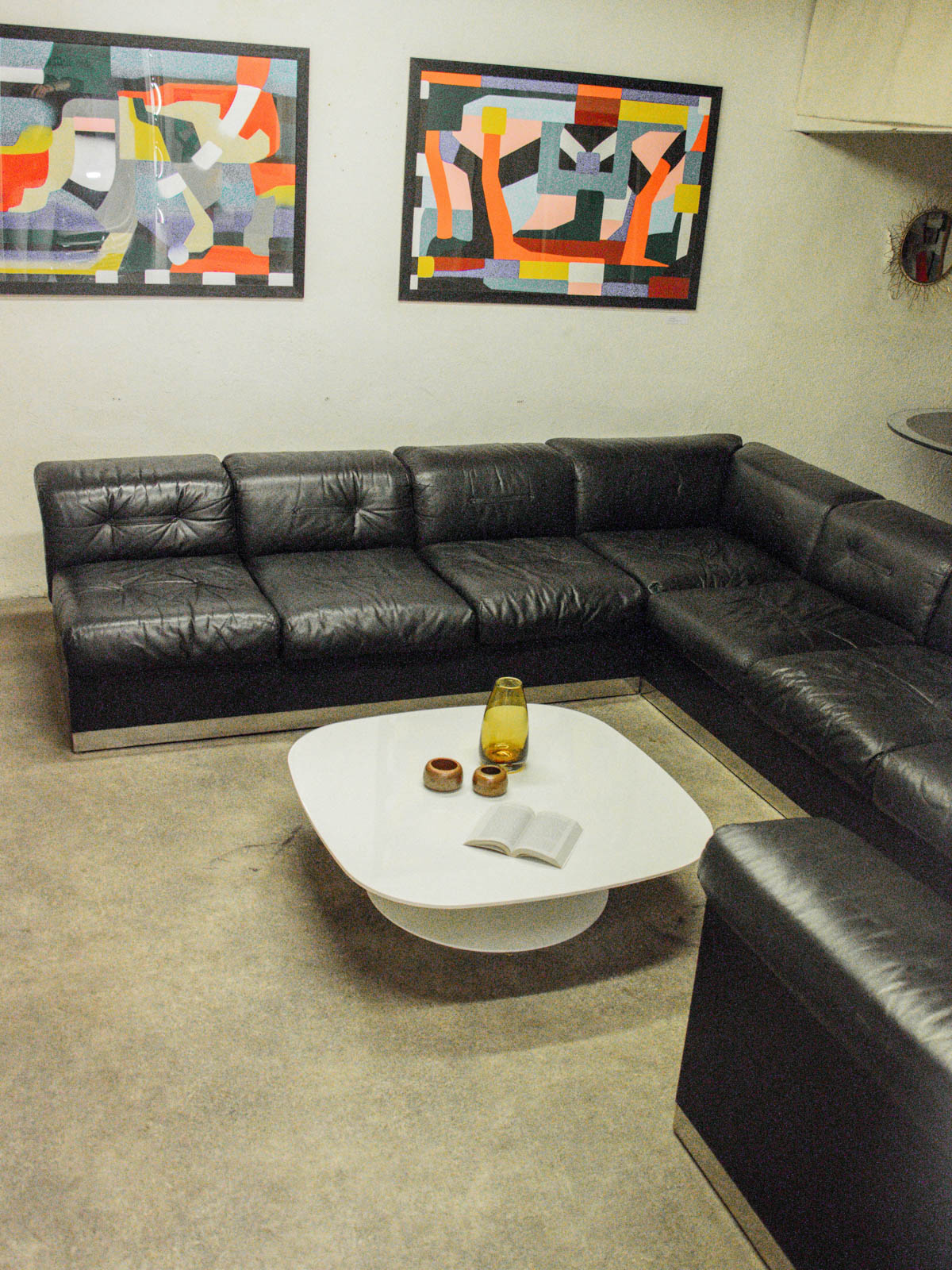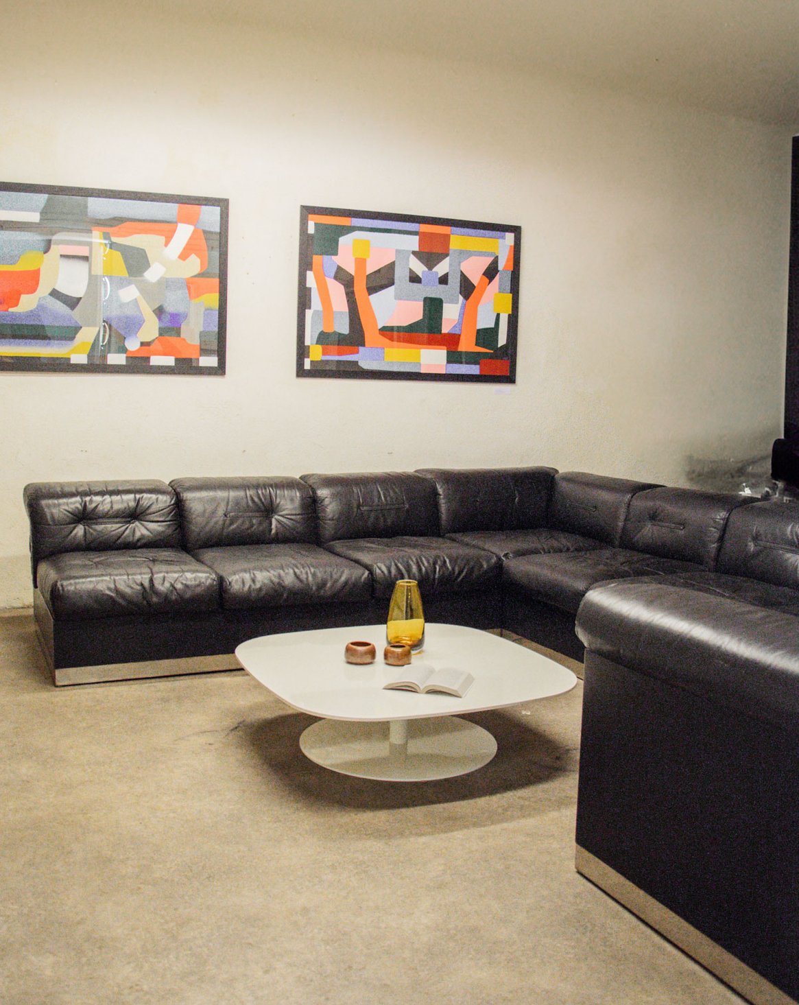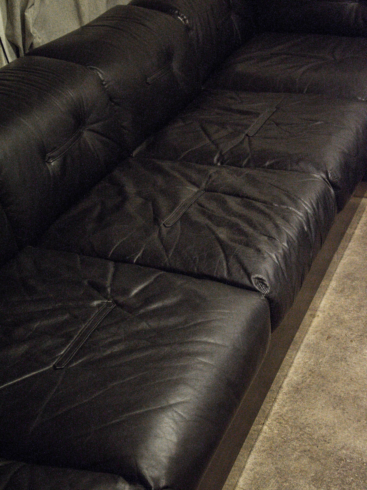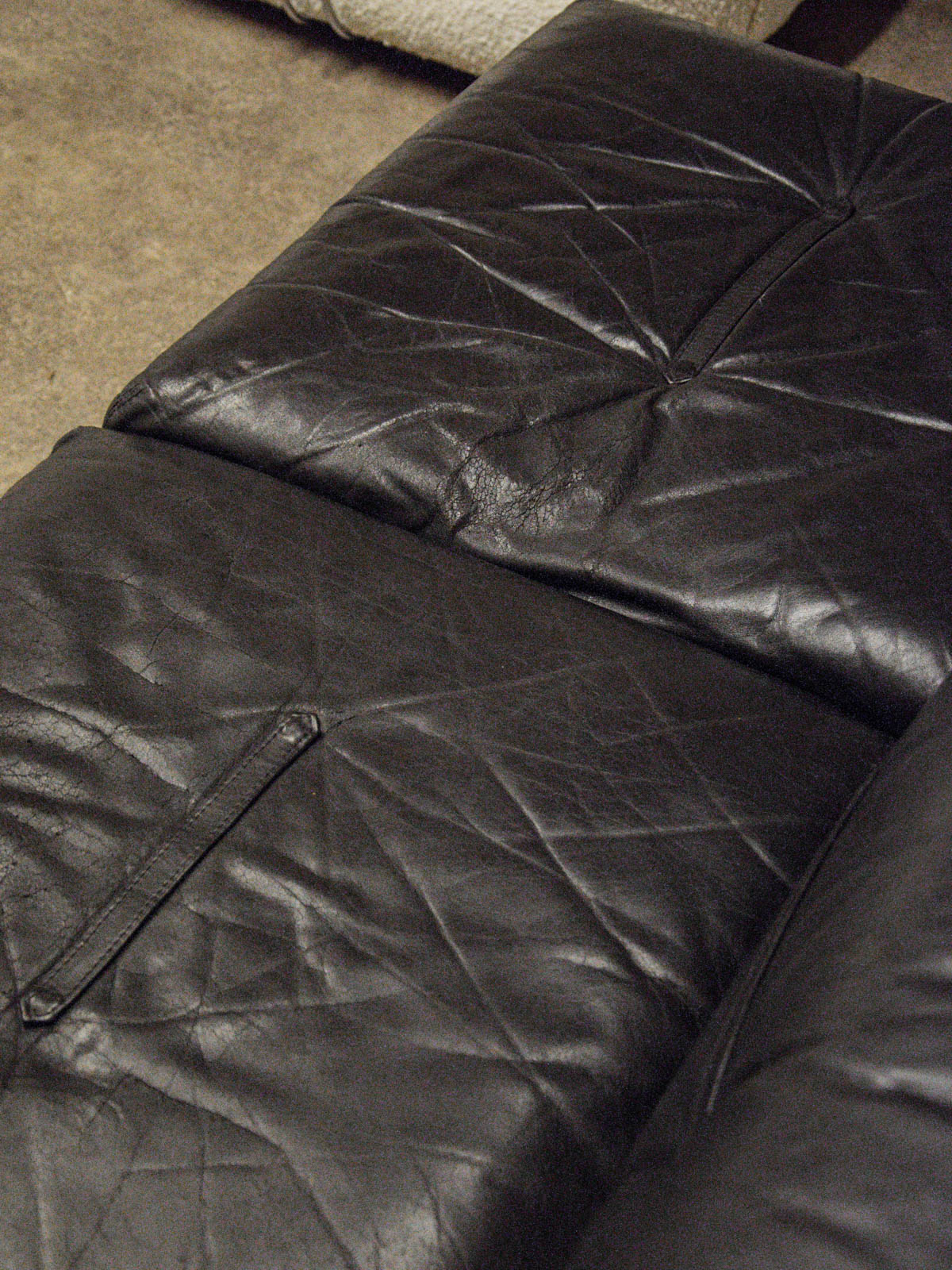 Discover this long modular black leather bench/sofa from the 1970s, composed of several modules that can be freely arranged to create a custom living room. The structure is made of matte black lacquered wood, with an aluminum base surrounding the entire belt. Inspired by the spirit of Jacques Charpentier, Roche Bobois and designer Giorgio Montani, some cushions show signs of wear on the leather.