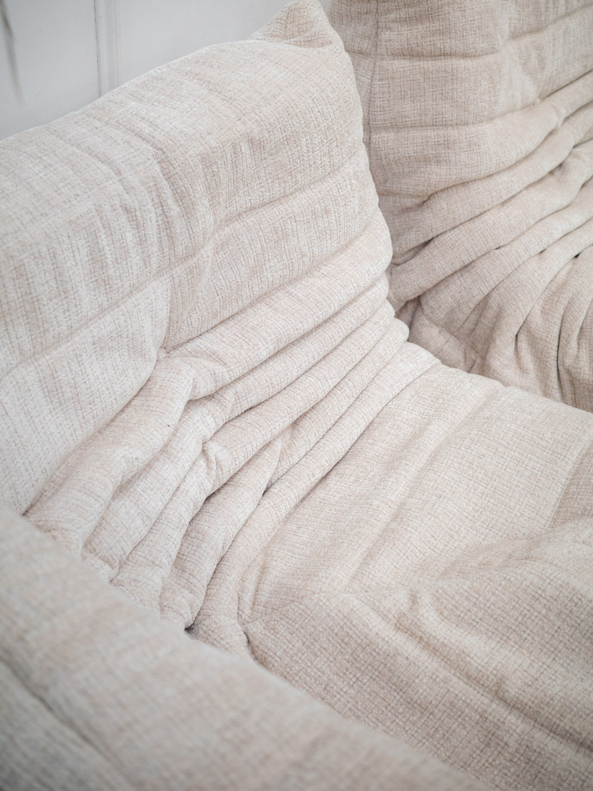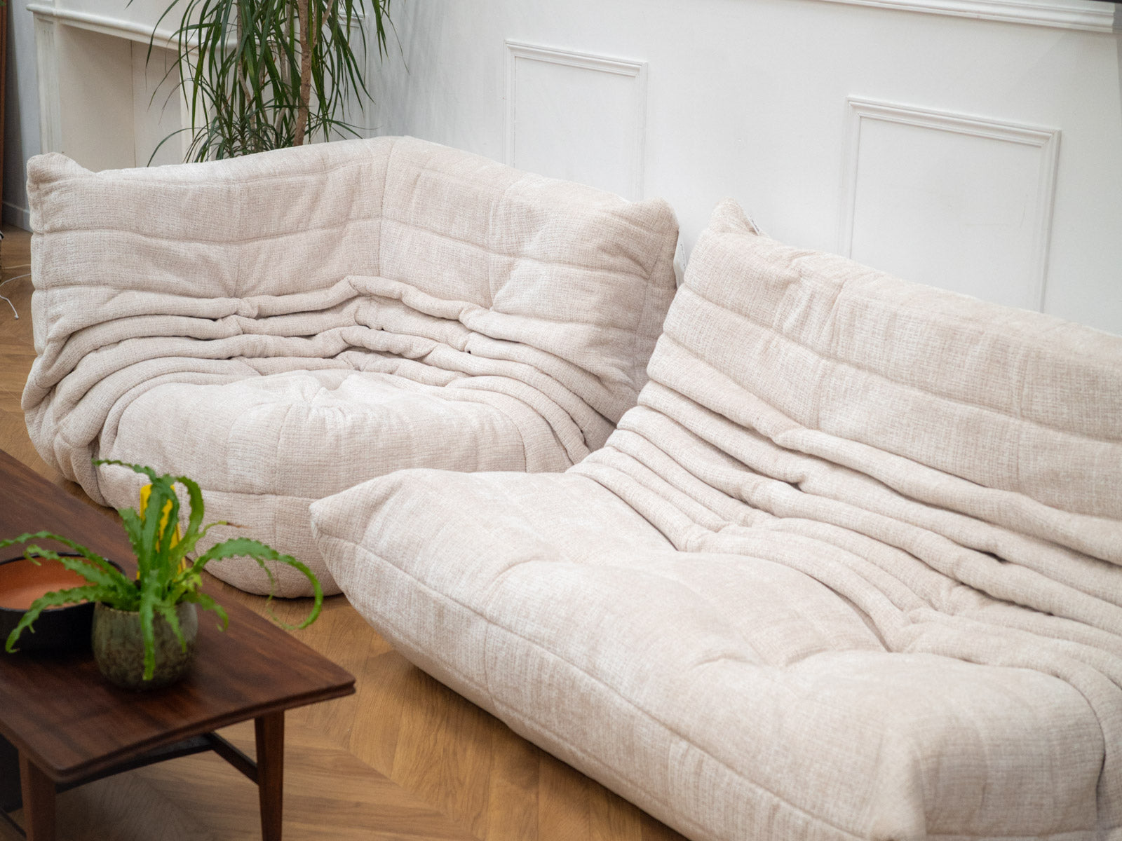 Discover the TOGO set, an iconic ensemble comprising a 2-seater sofa and a corner armchair, showcasing the innovative craftsmanship of Ligne Roset. Recently reupholstered in an elegant cream-colored woven fabric, this model combines comfort and style with its soft and inviting texture. Enjoy its modular system, which adapts perfectly to your living spaces for a personalized and welcoming layout. A must-have for a modern and chic interior.