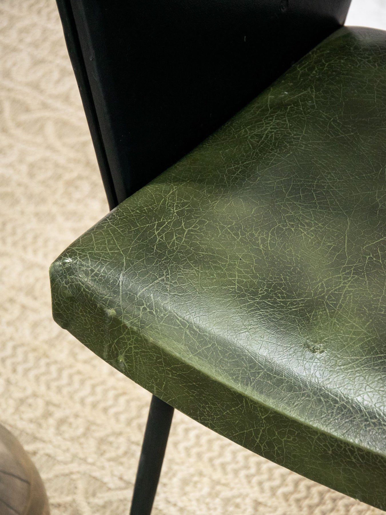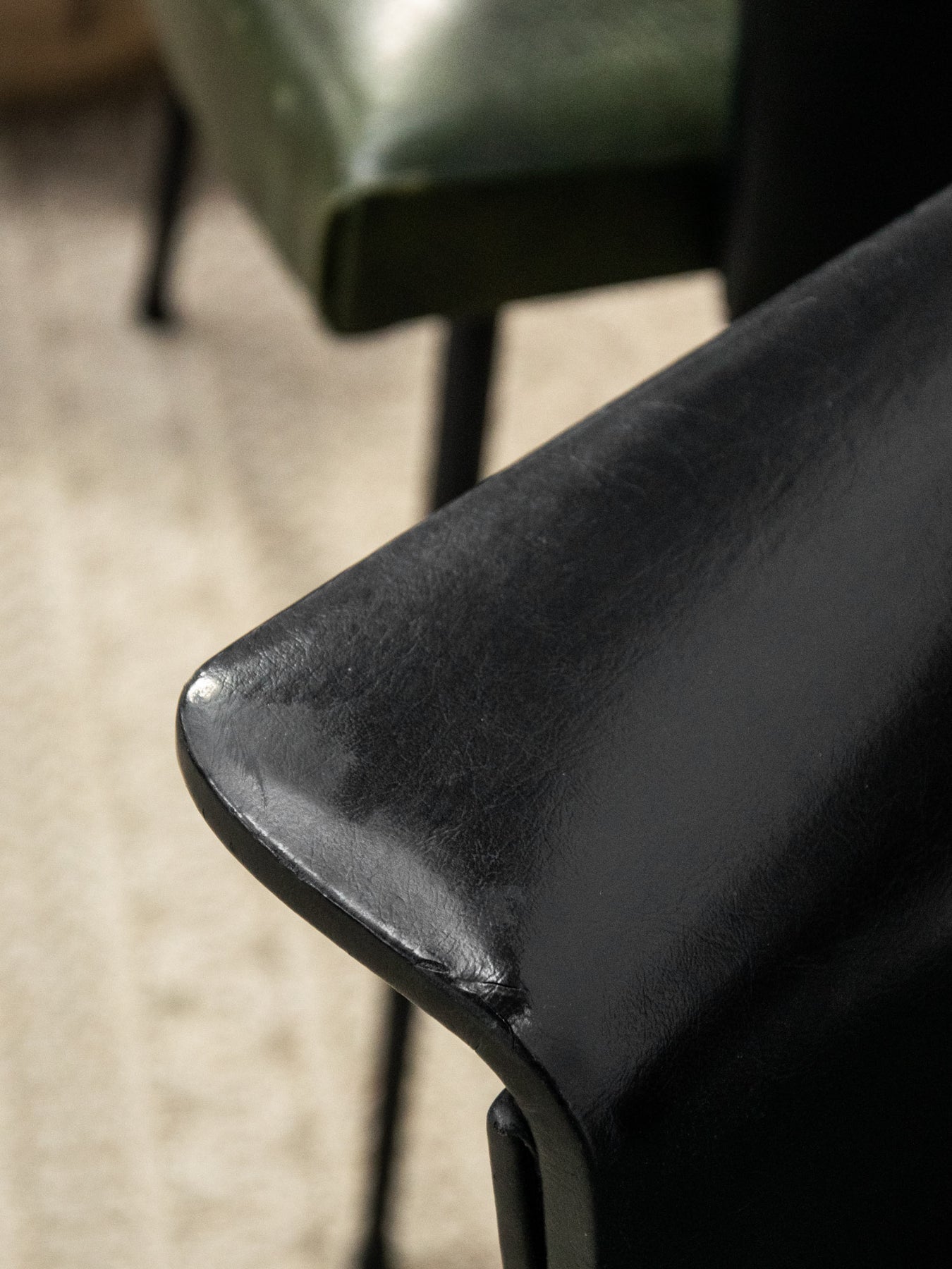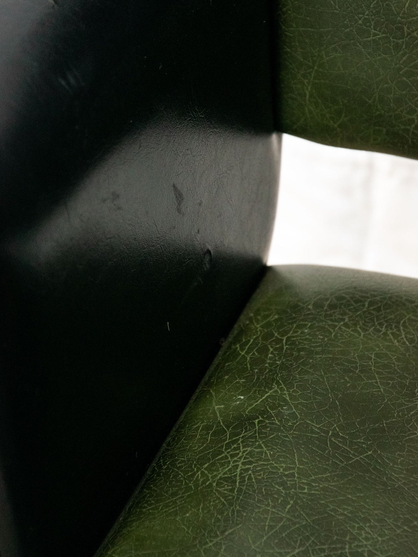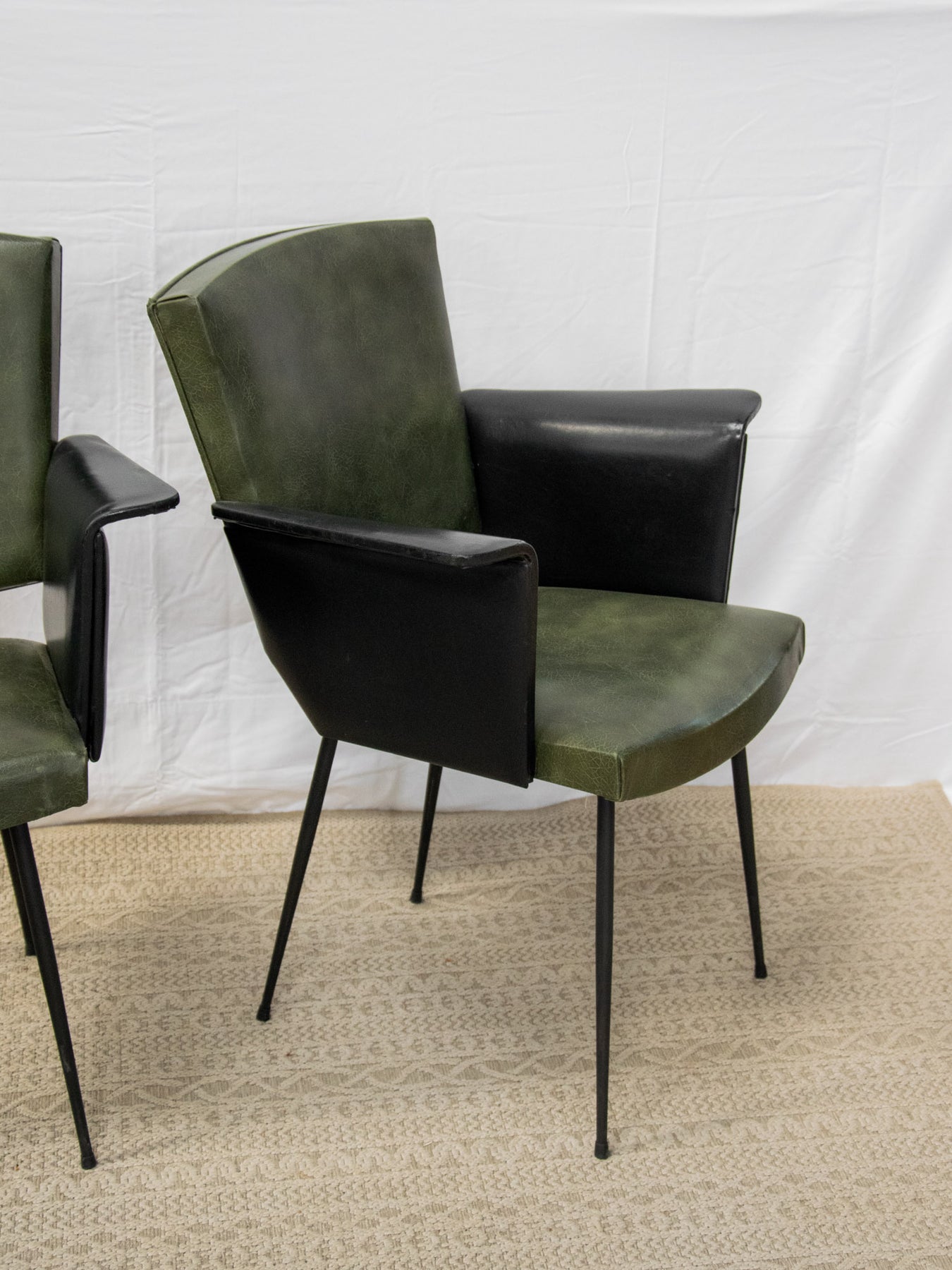 Add a vintage touch to your home with this pair of green and black leatherette armchairs. Featuring slim armrests and elegant compass metal legs, these armchairs combine comfort and style. Although they show some signs of wear, they retain an undeniable charm, perfect for creating a welcoming and chic atmosphere in your living space.