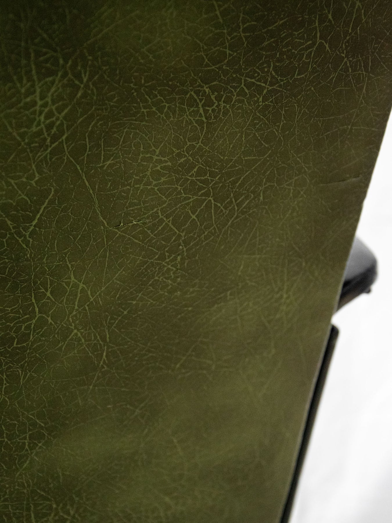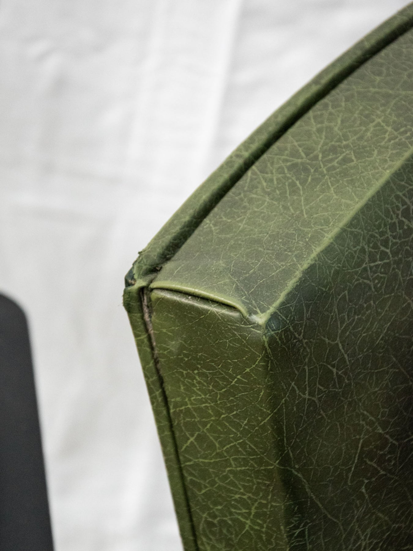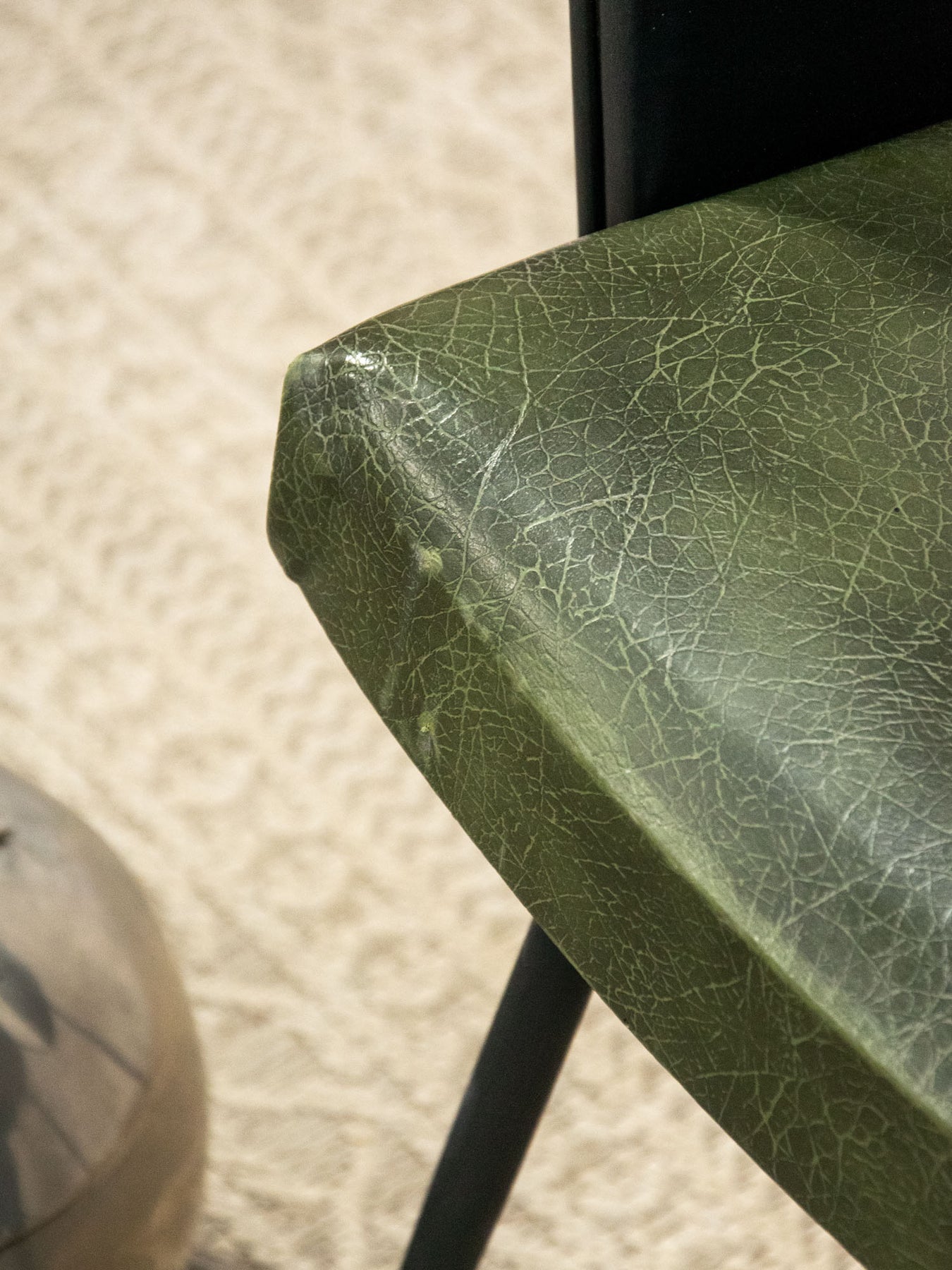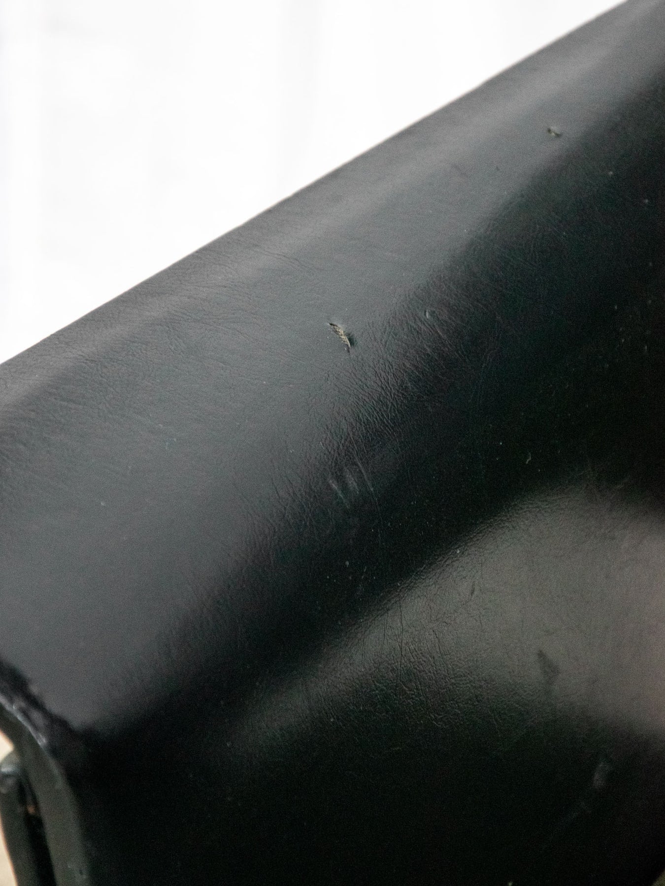 Add a vintage touch to your home with this pair of green and black leatherette armchairs. Featuring slim armrests and elegant compass metal legs, these armchairs combine comfort and style. Although they show some signs of wear, they retain an undeniable charm, perfect for creating a welcoming and chic atmosphere in your living space.