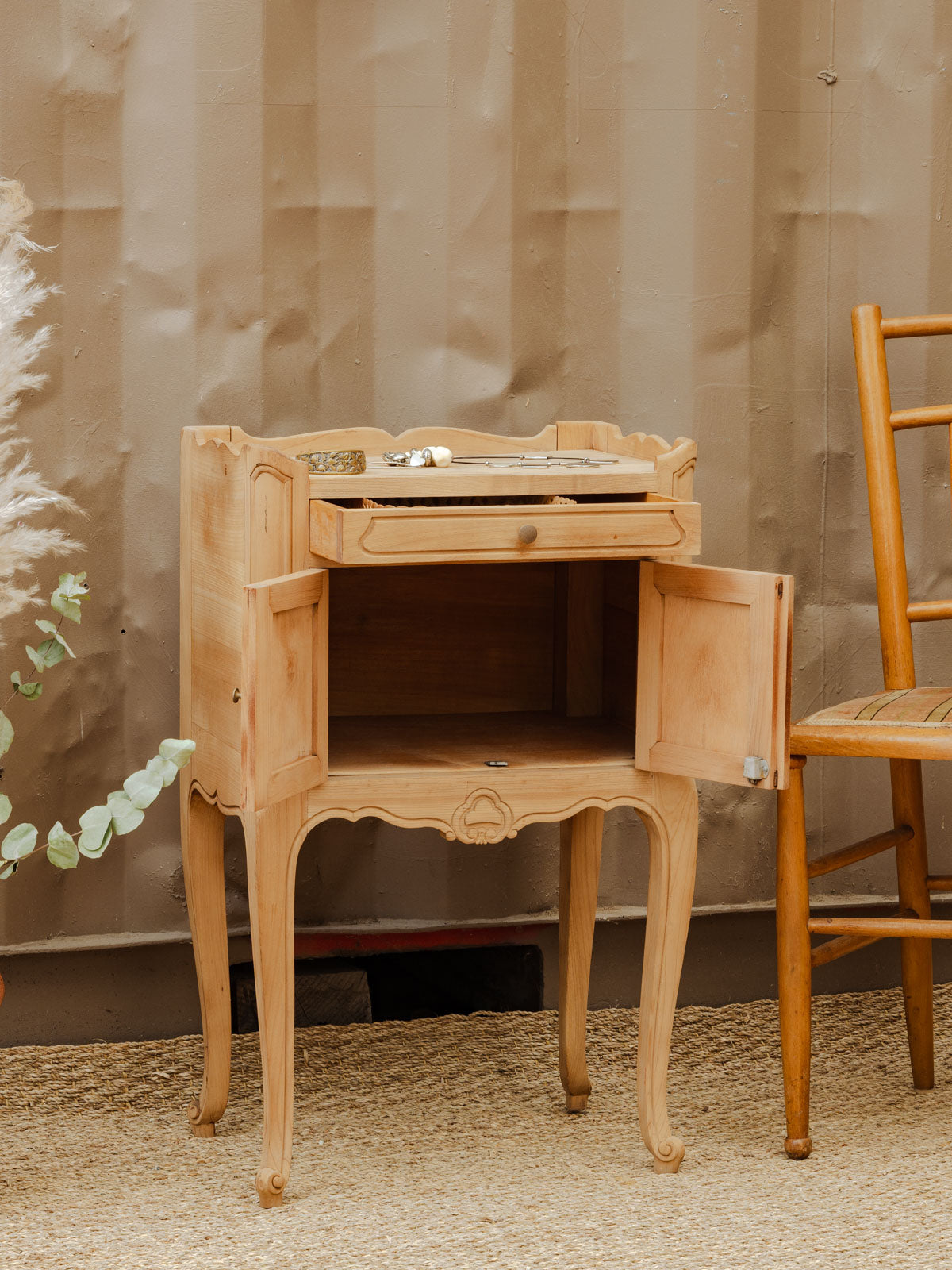Chevet ancien poncé pour révéler son bois brut au grain chaleureux et naturel. Compact et bien proportionné, il offre un tiroir pratique et une niche fermée par deux petites portes, idéale pour garder livres et objets à portée de main. Les poignées en laiton apportent une touche patinée qui souligne son caractère authentique. Sobriété et douceur pour une chambre aux lignes apaisées. Légères traces du temps qui participent à son charme.