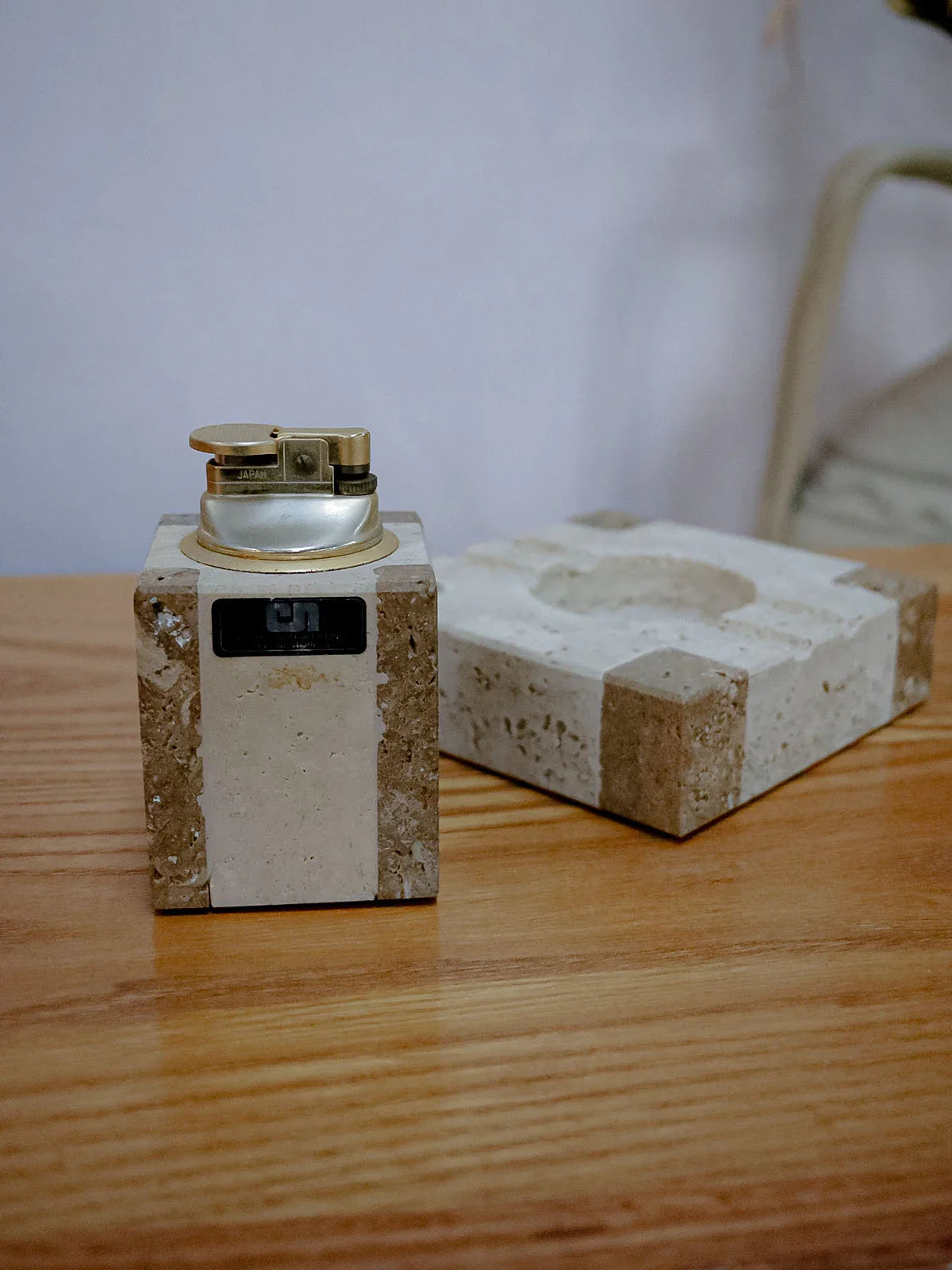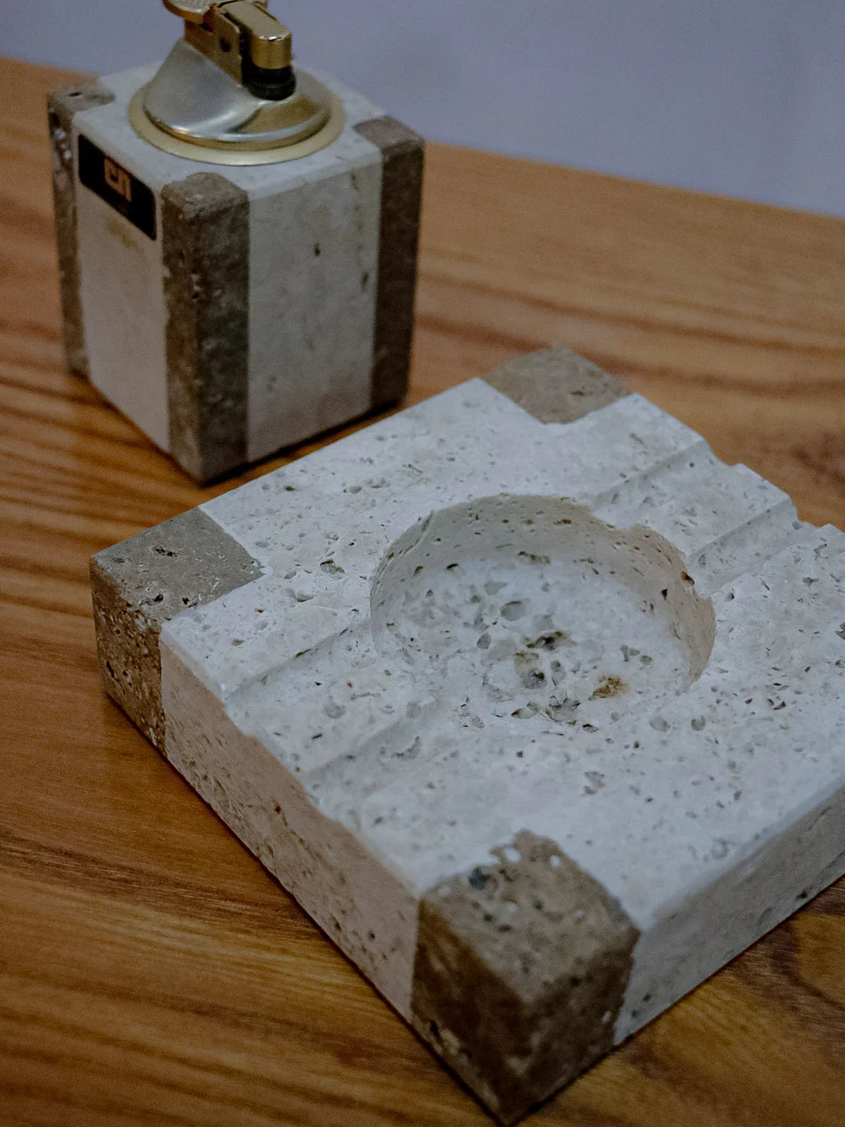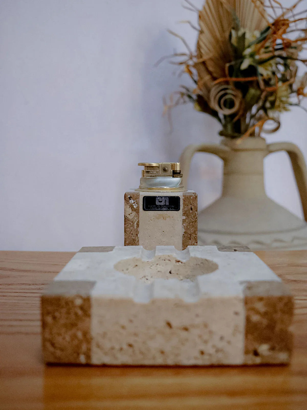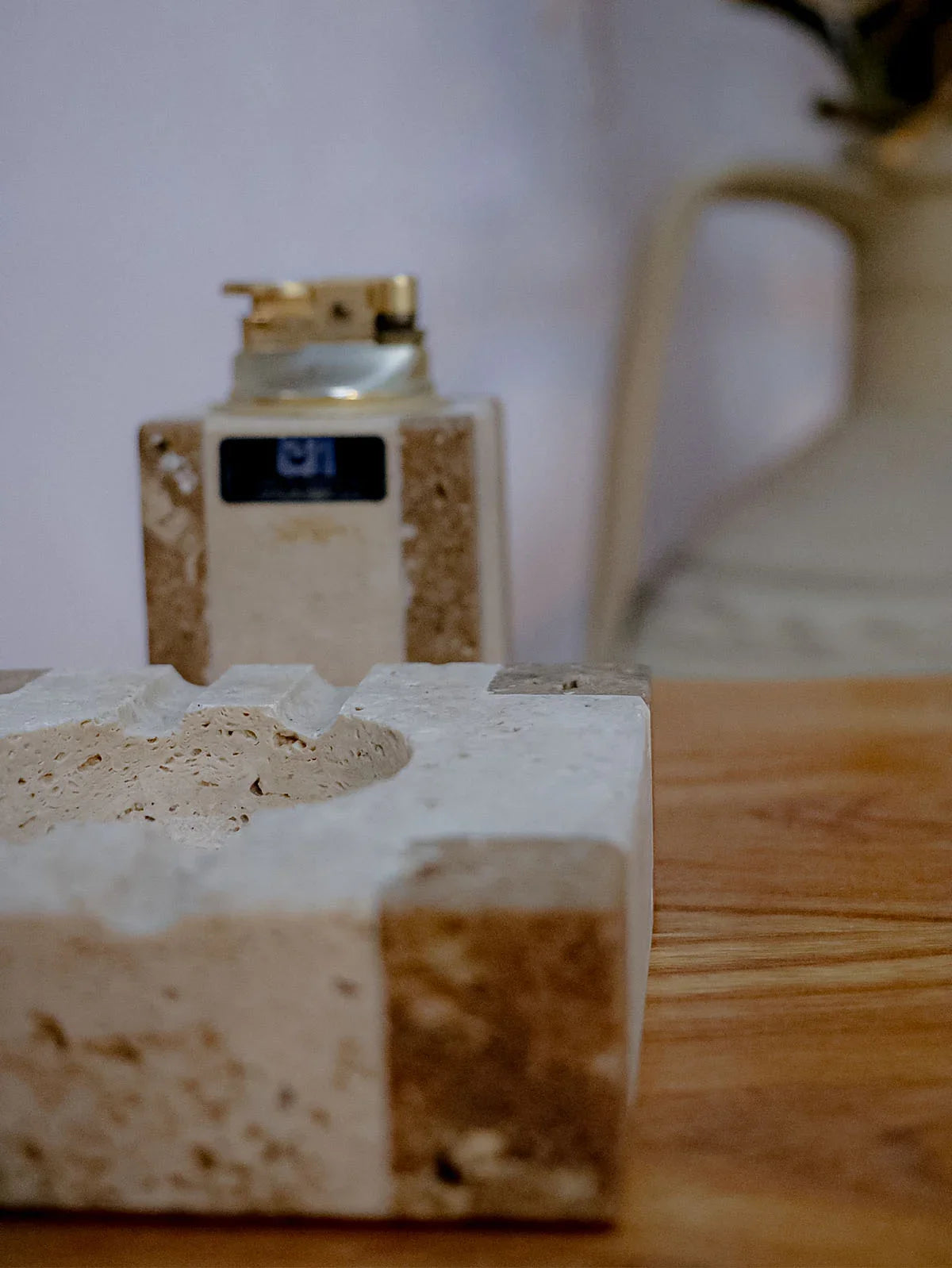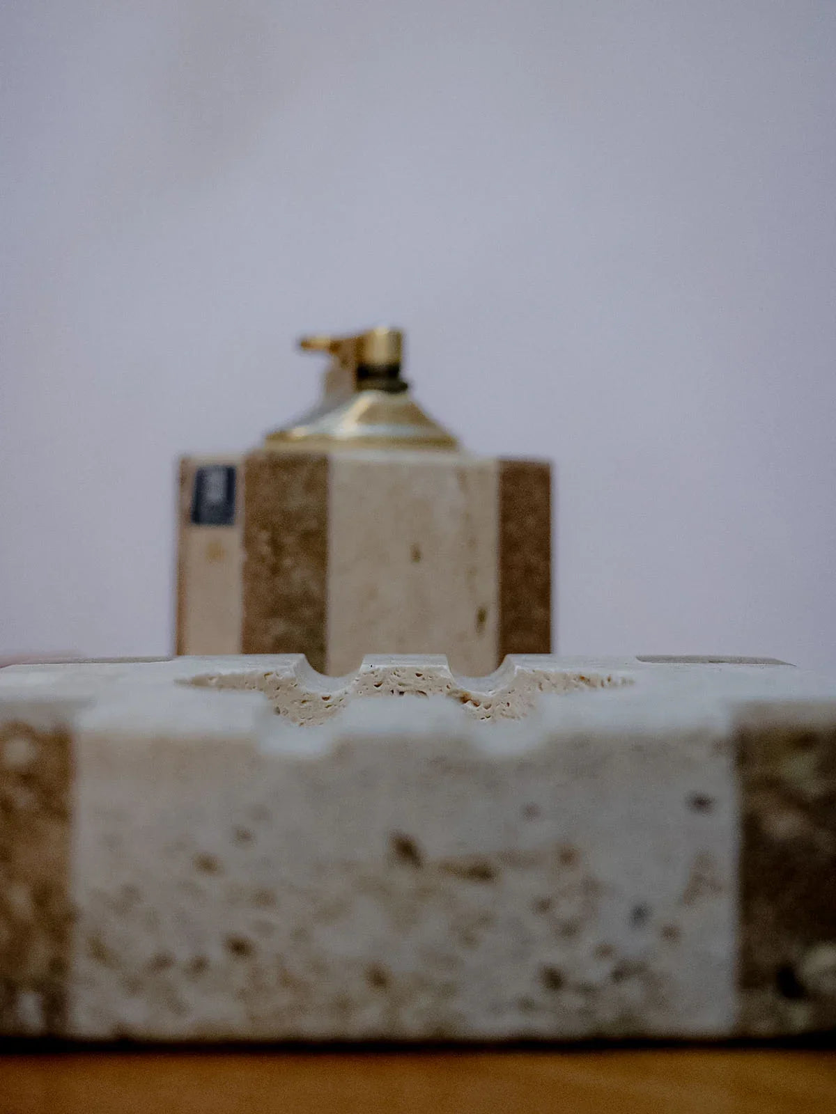 Treat yourself to this two-tone travertine ashtray and lighter set by Cerri Nestore, which blends the mineral warmth of the stone with a clean and elegant design. The refillable lighter fits perfectly into the compact ashtray, creating a practical duo for a coffee table, desk, or discreet smoking area. The contrasting hues of the travertine lend a sculptural presence, ideal for establishing a refined, retro-chic atmosphere in a contemporary interior.