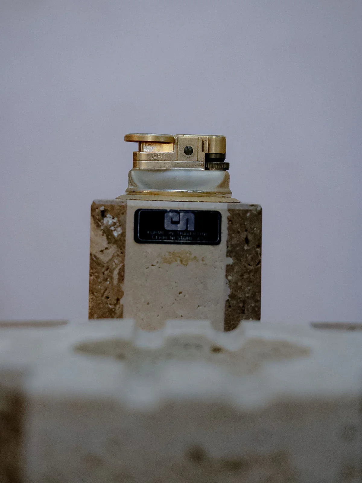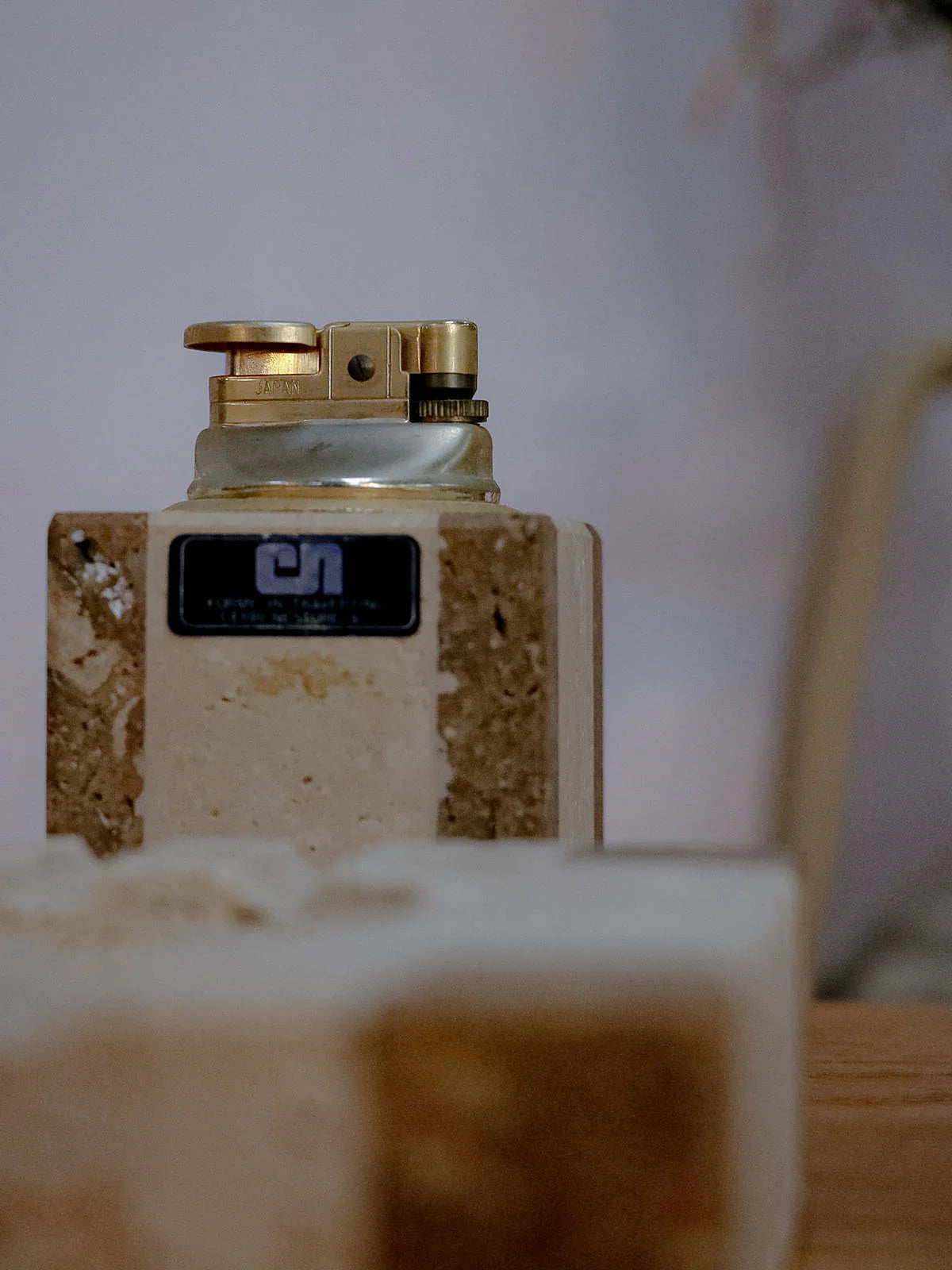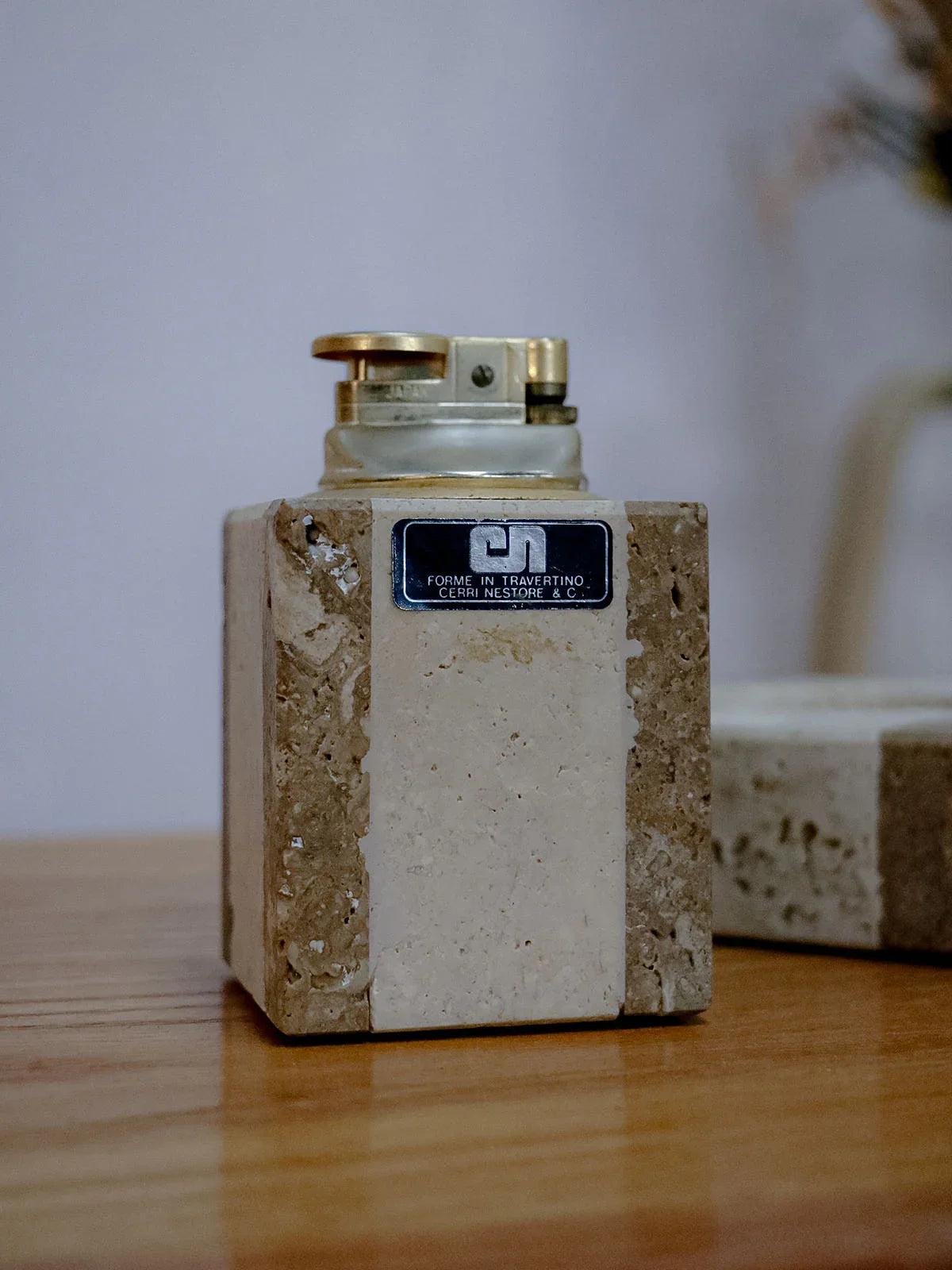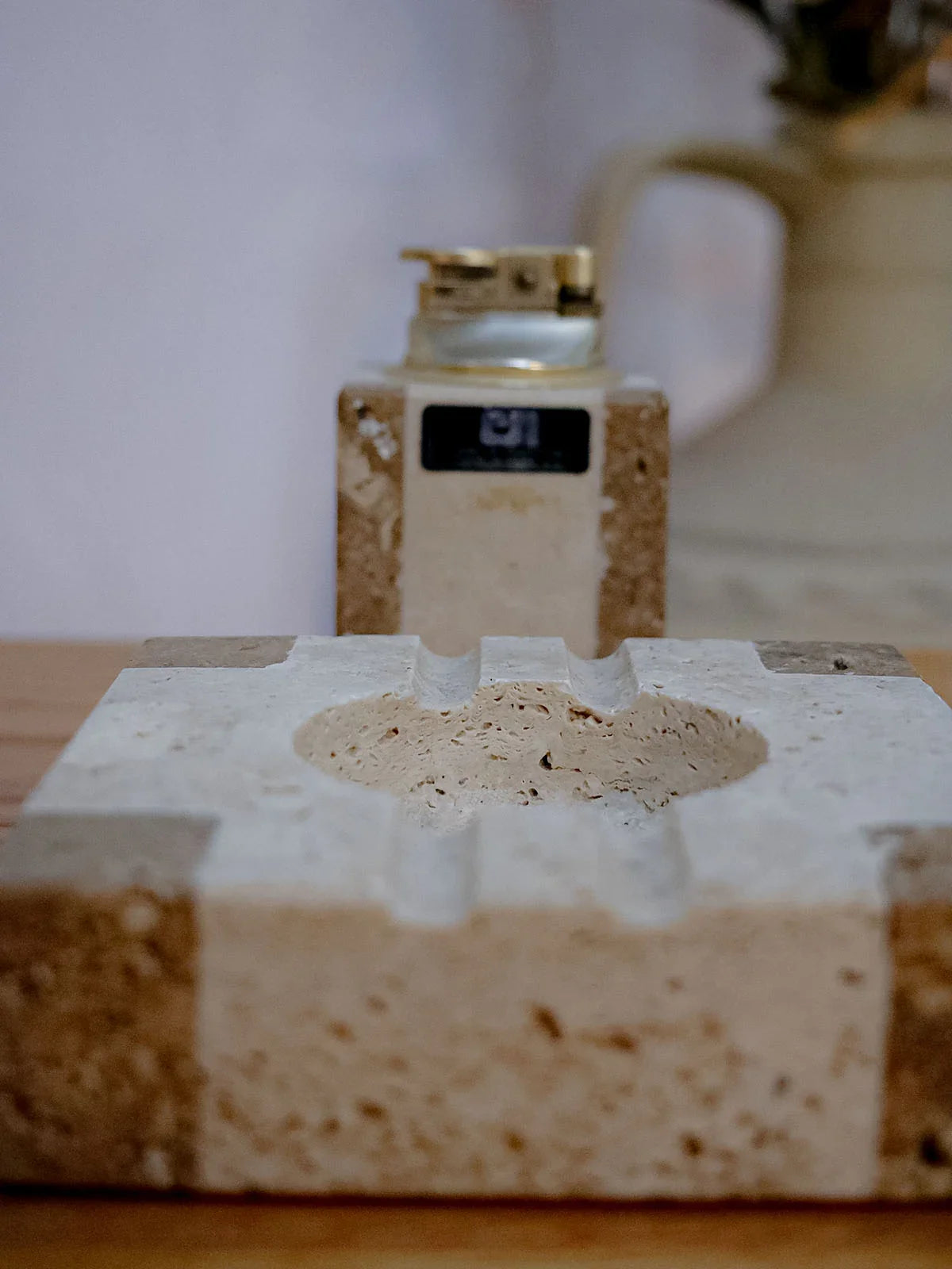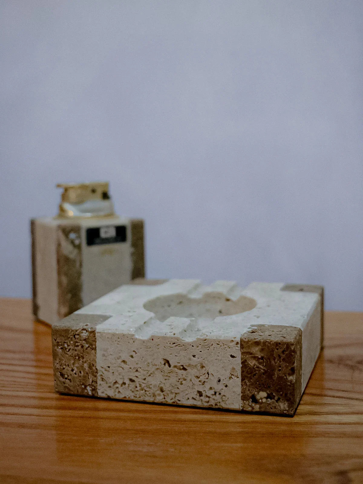 Treat yourself to this two-tone travertine ashtray and lighter set by Cerri Nestore, which blends the mineral warmth of the stone with a clean and elegant design. The refillable lighter fits perfectly into the compact ashtray, creating a practical duo for a coffee table, desk, or discreet smoking area. The contrasting hues of the travertine lend a sculptural presence, ideal for establishing a refined, retro-chic atmosphere in a contemporary interior.