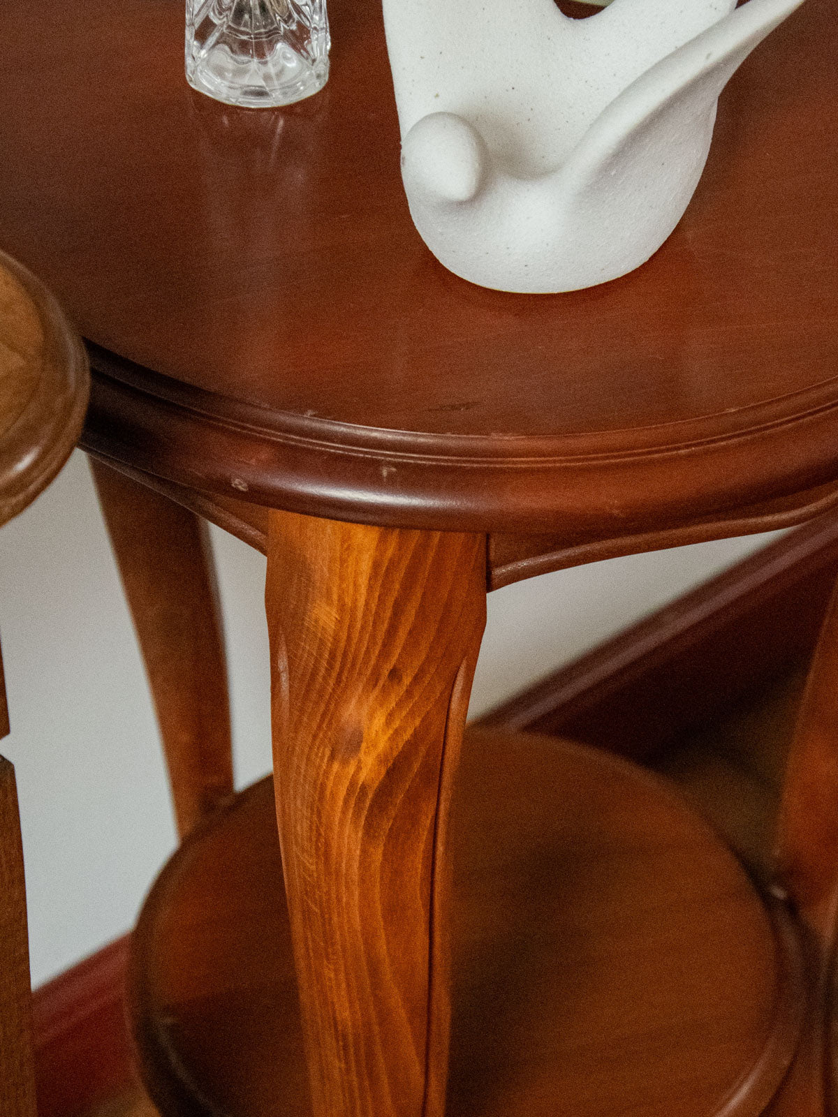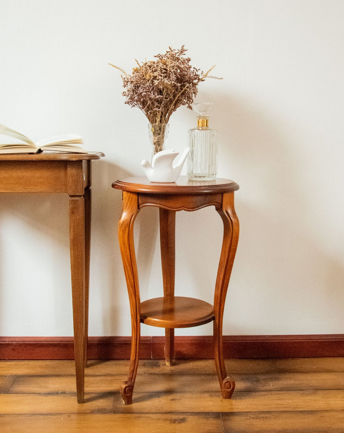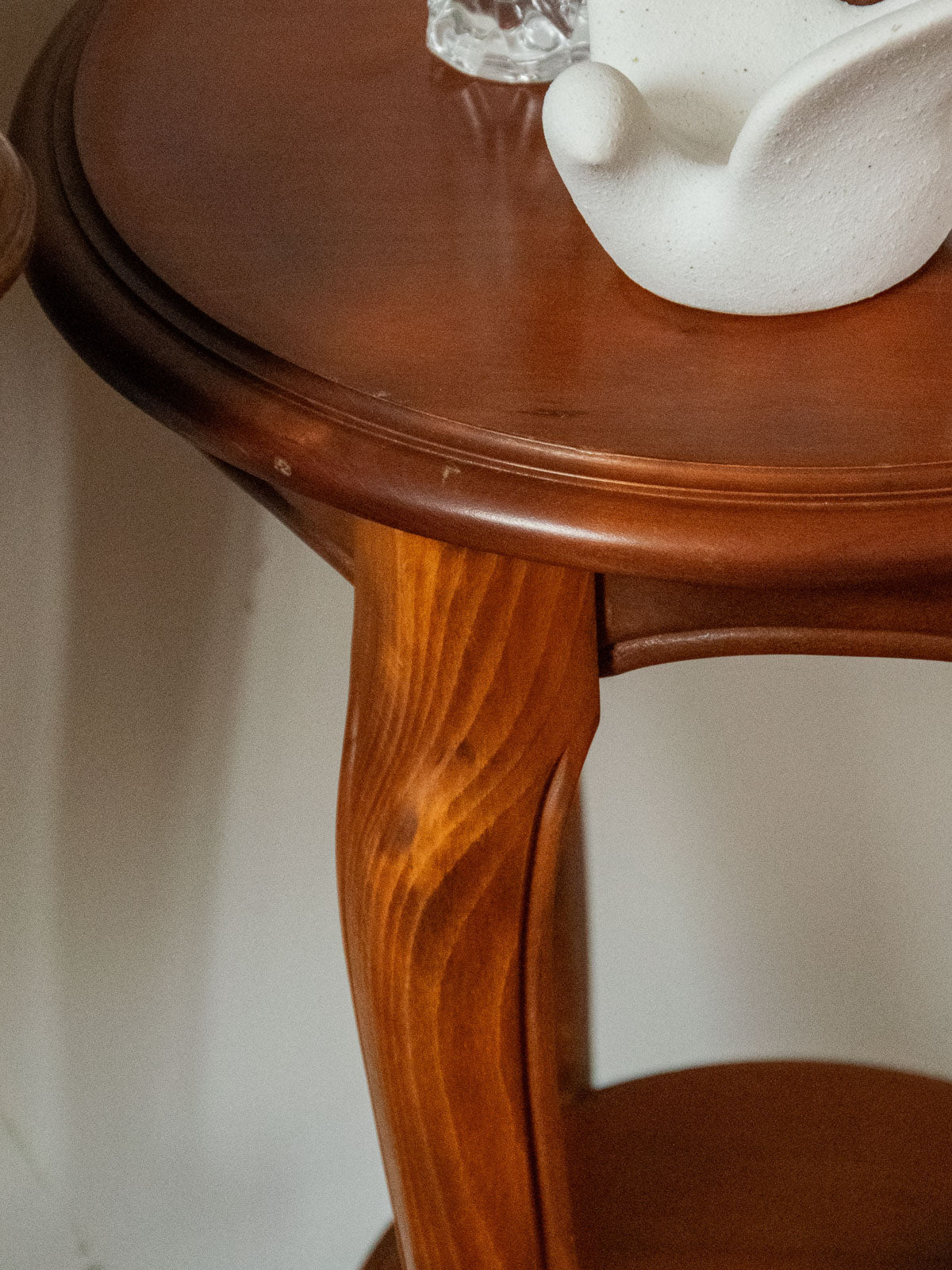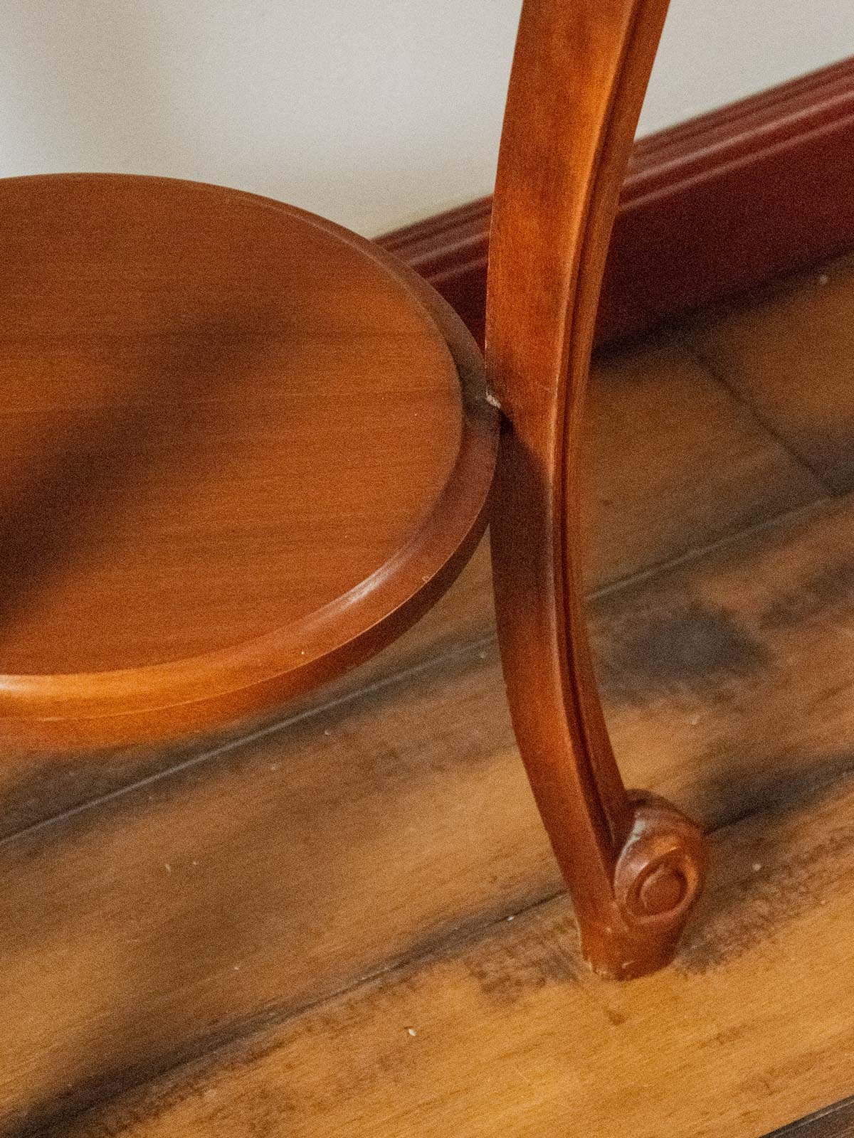 Enhance your interior with this double-tiered side table in deep caramel-colored wood, where the warmth of the grain blends with an elegant silhouette. Its two round shelves offer a flexible surface for displaying cups, plants, or decorative objects, while the curved legs and sculpted caps add a delicate touch of elegance. Its balanced size makes it equally at home next to a sofa or in an entryway, creating a welcoming and refined atmosphere. Signs of wear are present.