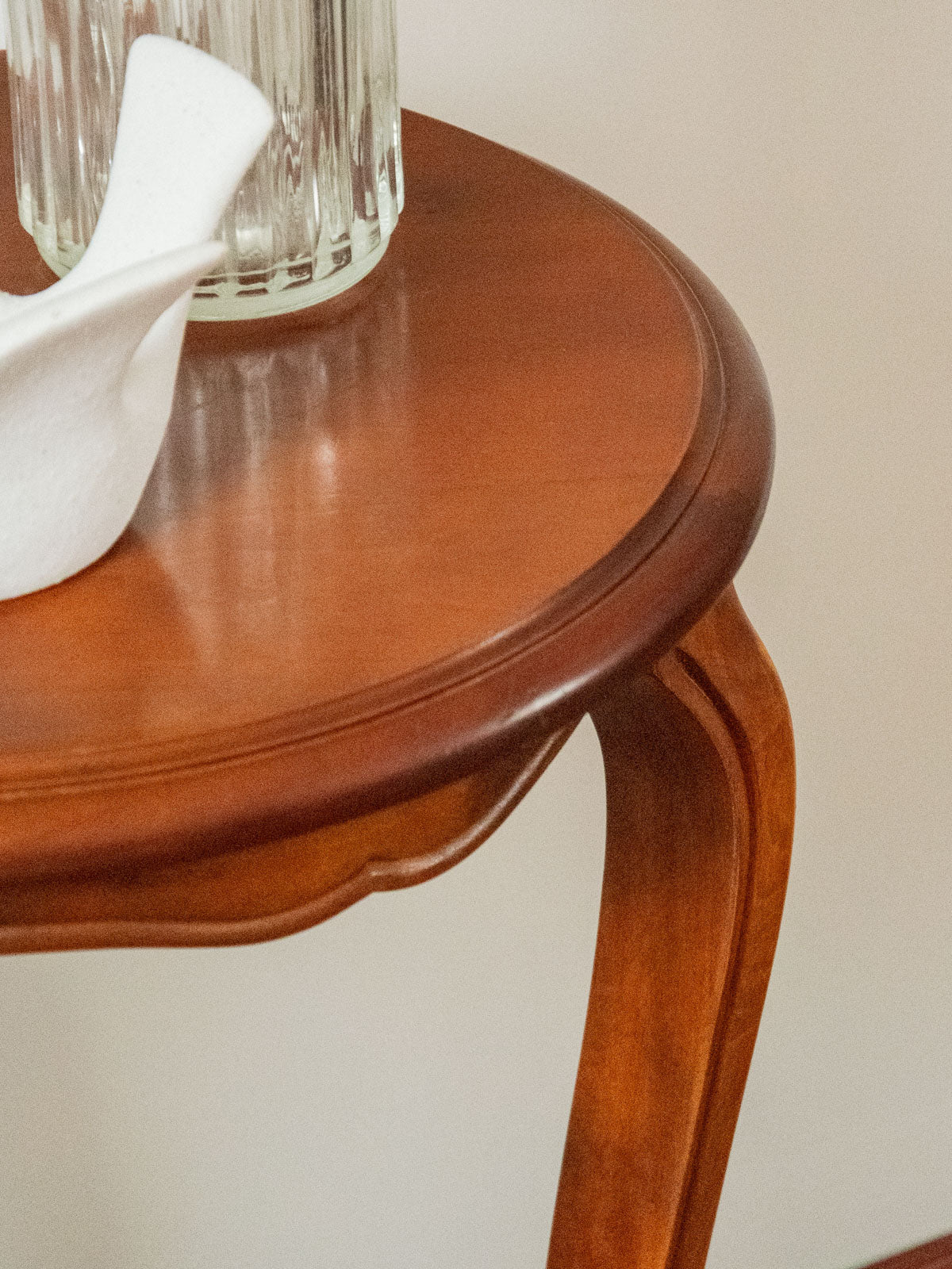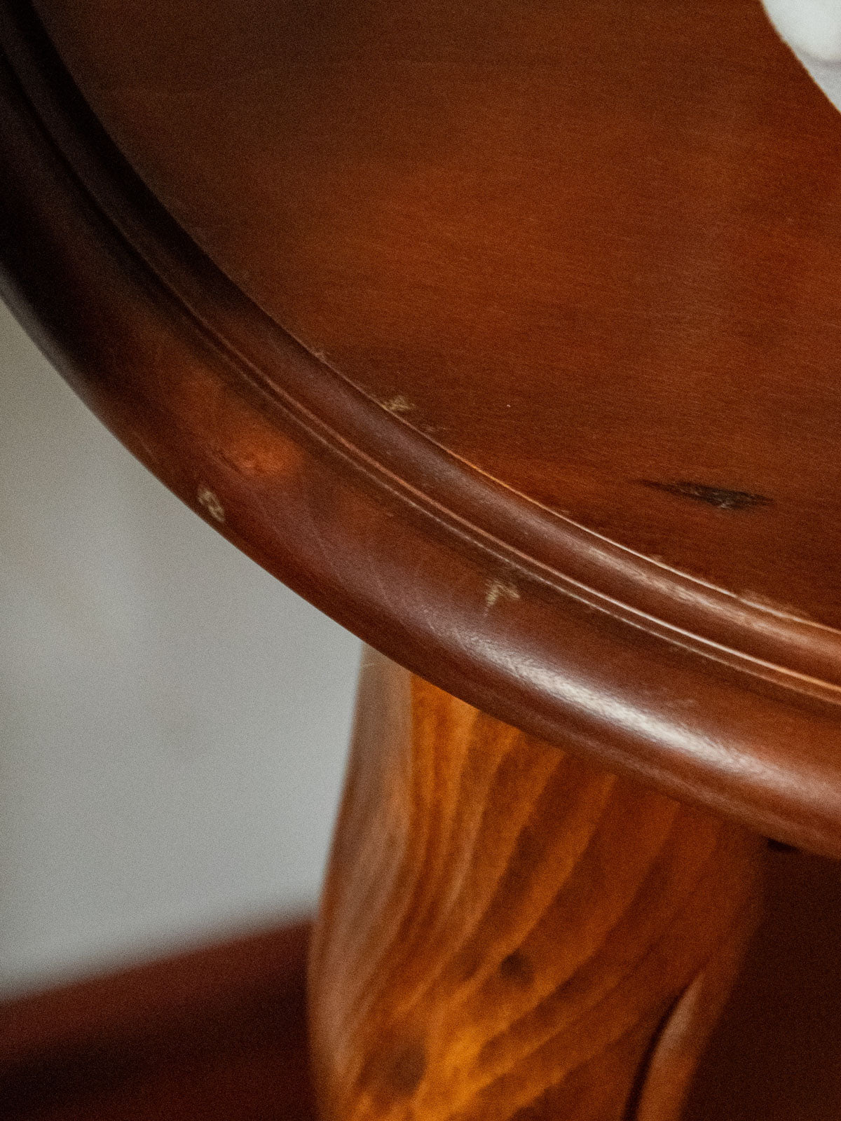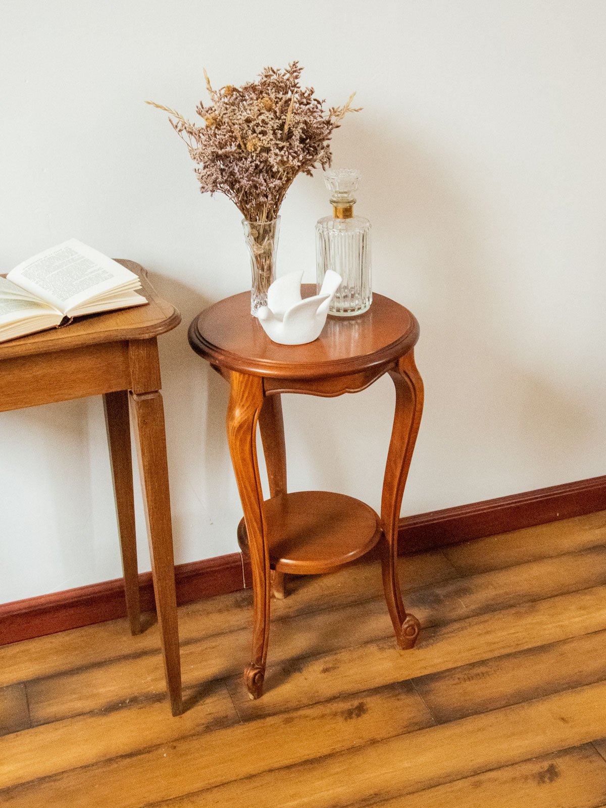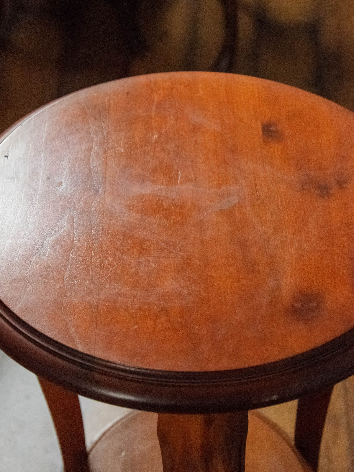 Enhance your interior with this double-tiered side table in deep caramel-colored wood, where the warmth of the grain blends with an elegant silhouette. Its two round shelves offer a flexible surface for displaying cups, plants, or decorative objects, while the curved legs and sculpted caps add a delicate touch of elegance. Its balanced size makes it equally at home next to a sofa or in an entryway, creating a welcoming and refined atmosphere. Signs of wear are present.