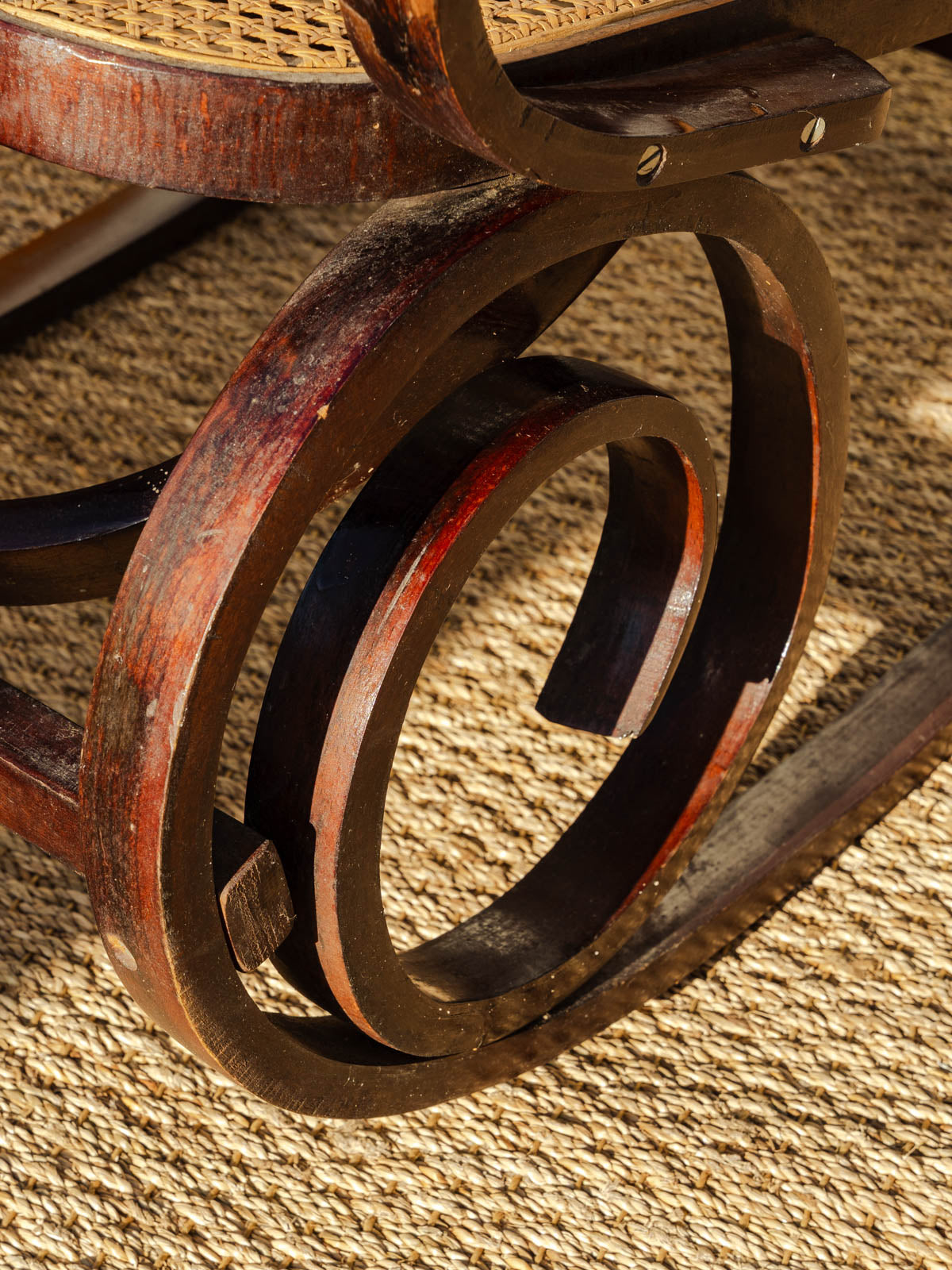 Rocking chair ancien en bois courbé, inspiré du style Thonet, au design élégant et caractériel. Assise et dossier cannés apportent une assise confortable et une délicate présence visuelle, idéale pour un coin lecture ou un salon chaleureux. Un accro sur le dossier a été recollé. Légères traces du temps qui participent à son charme.
