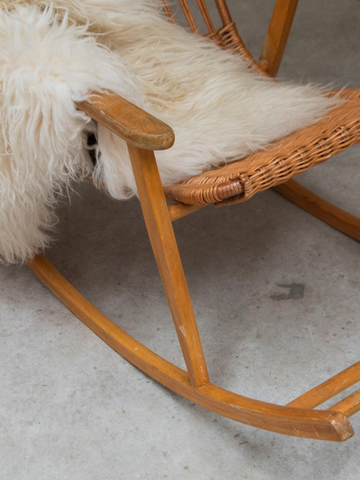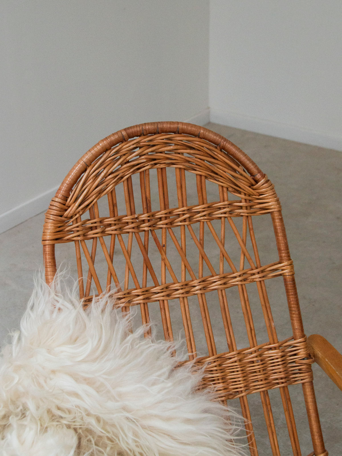 Adoptez ce rocking-chair Uluv en bois clair au design délicat, son assise et son dossier en osier apportent une allure naturelle et respirante, hommage à un savoir-faire artisanal. Ses proportions contenues et son inclinaison invitent à la lecture ou aux instants de détente, facile à placer dans un coin salon ou une véranda ensoleillée. Il diffuse une ambiance chaleureuse et aérienne, idéale pour un intérieur épuré et contemplatif. Légères usures présentes.