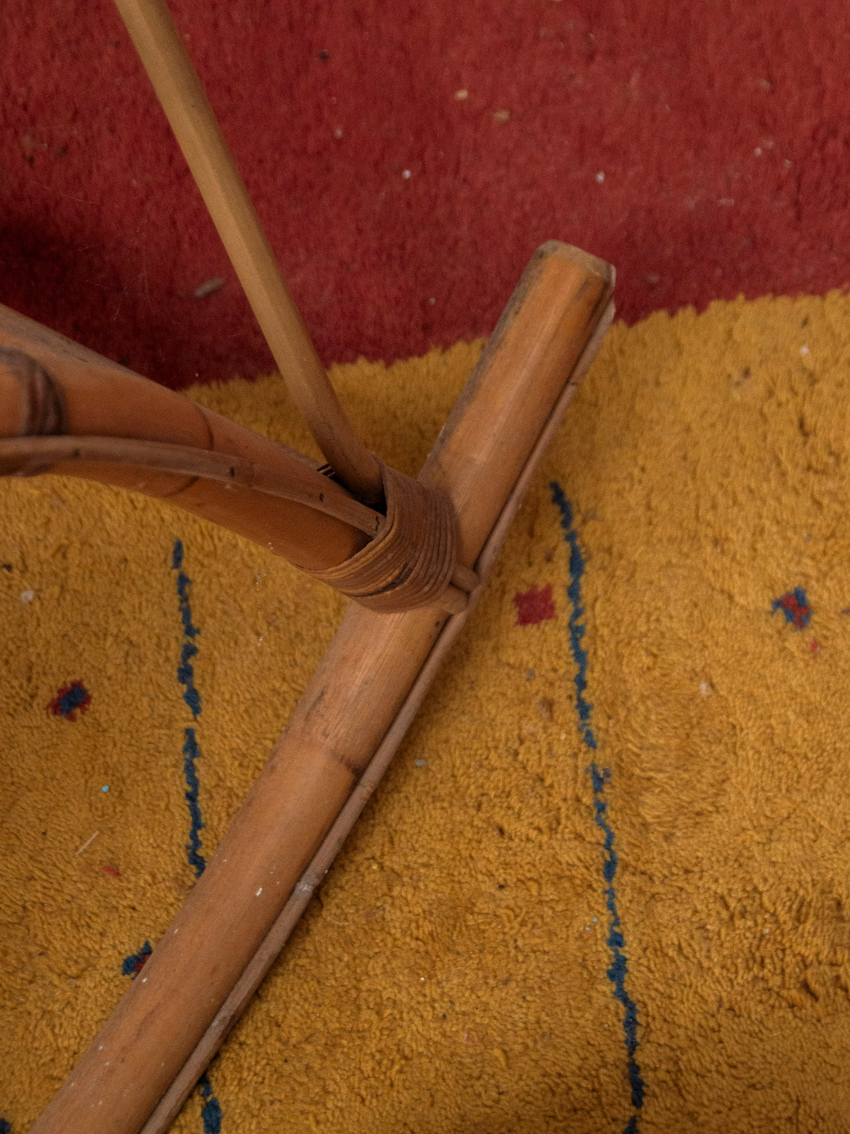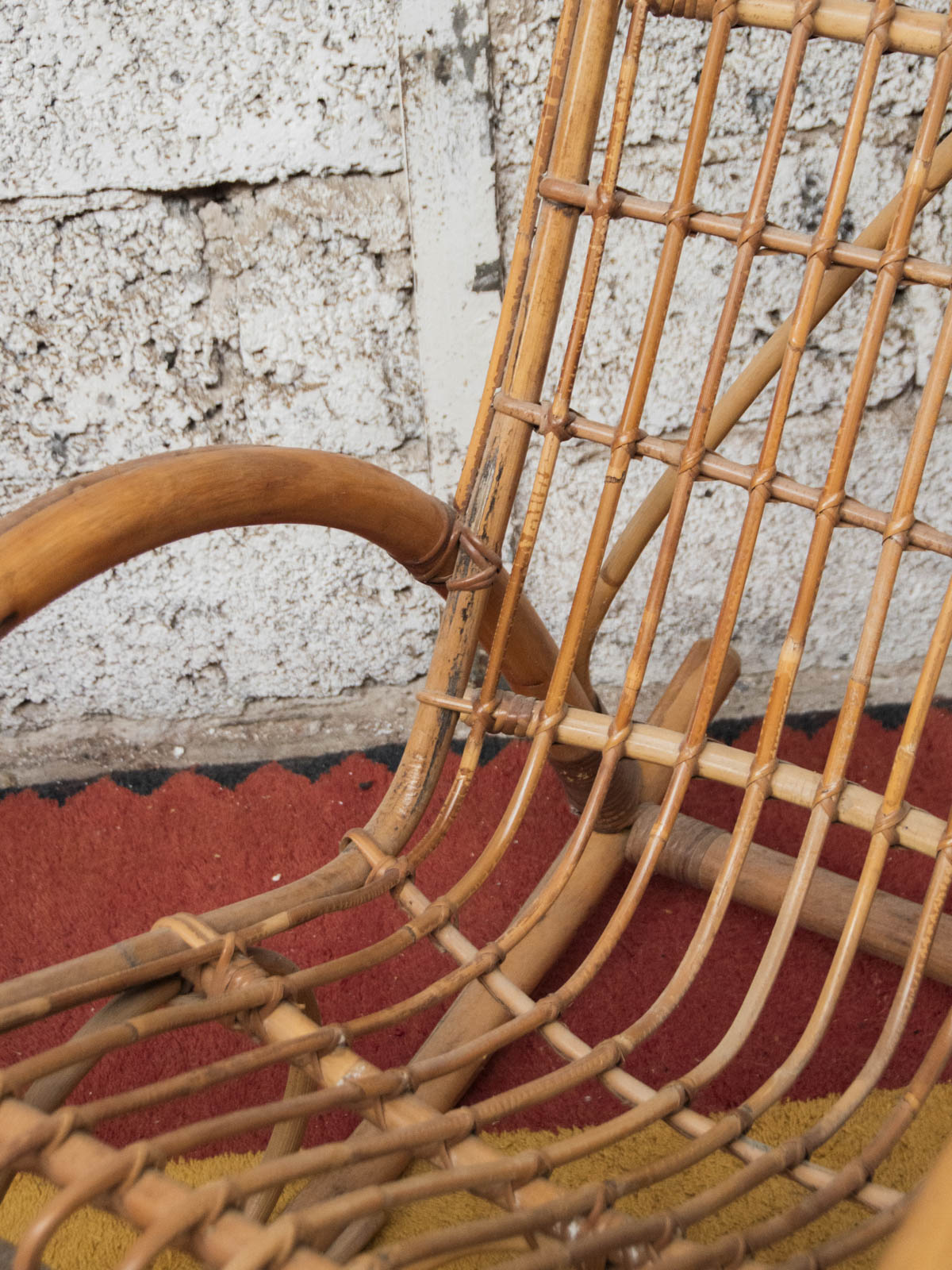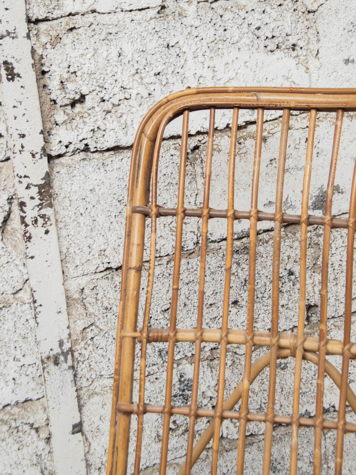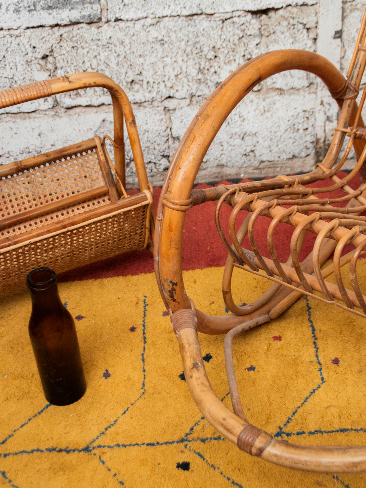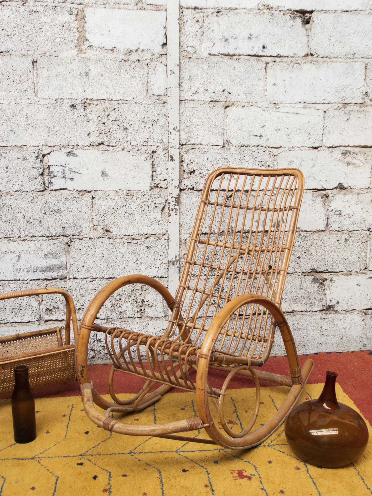 Embrace this light rattan rocking chair, imposing in its generous proportions and imbued with a warm vintage spirit. The natural weave and luminous hue create an airy silhouette that invites relaxation, with a deep seat ideal for reading or long breaks. Perfect for structuring a living room corner, a veranda, or a bedroom, it exudes a soft and welcoming atmosphere. In very good condition.