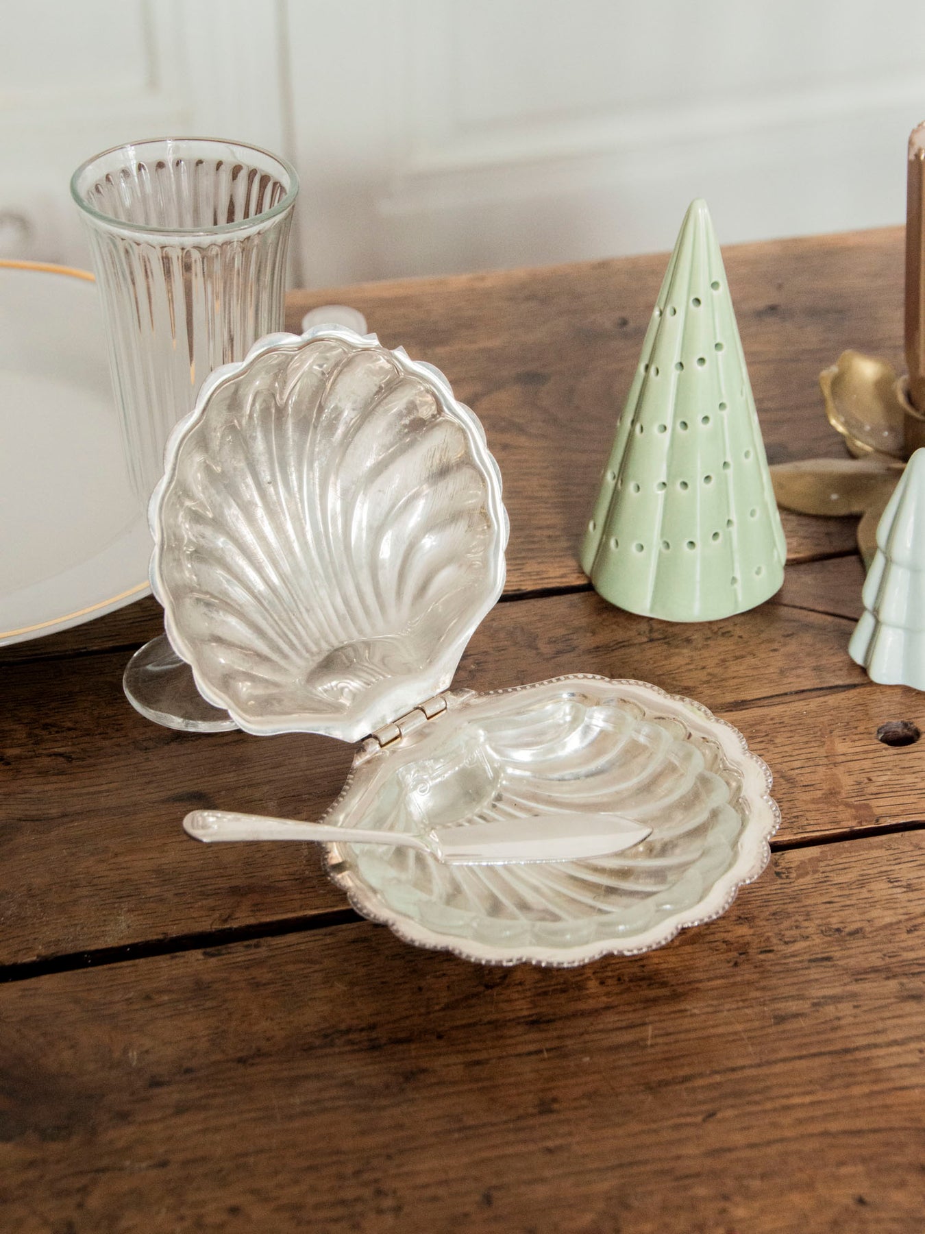 Elevate your table setting with this delicately designed stainless steel seashell butter dish. Its metallic exterior conceals a hygienic glass interior. Complete with a matching knife, it allows you to store and serve butter with precision and elegance, making it ideal for a relaxed breakfast or a cheese board. Its compact size and sea-inspired silhouette add a touch of understated poetry to your culinary moments.