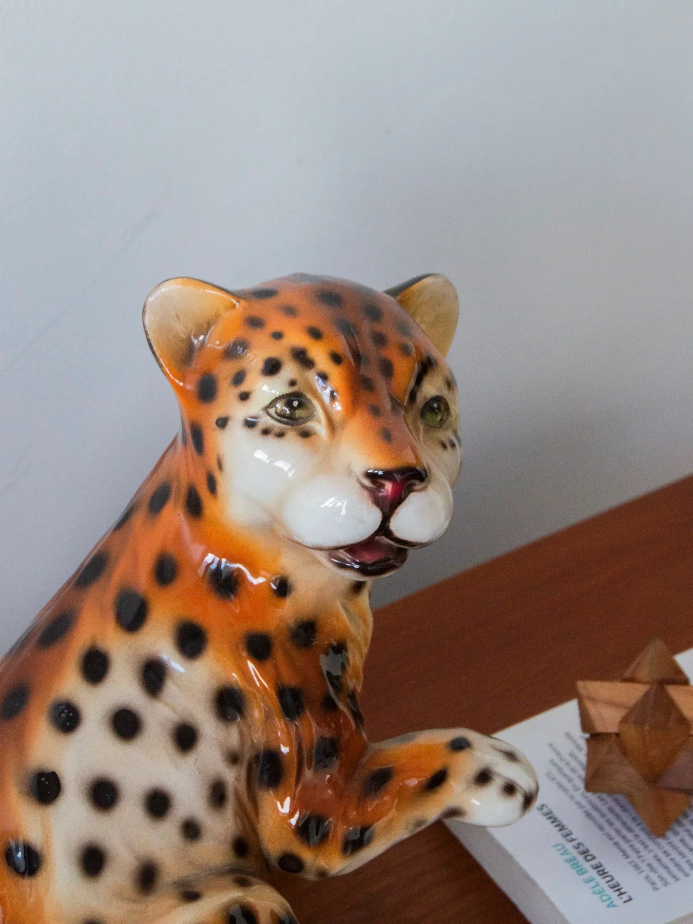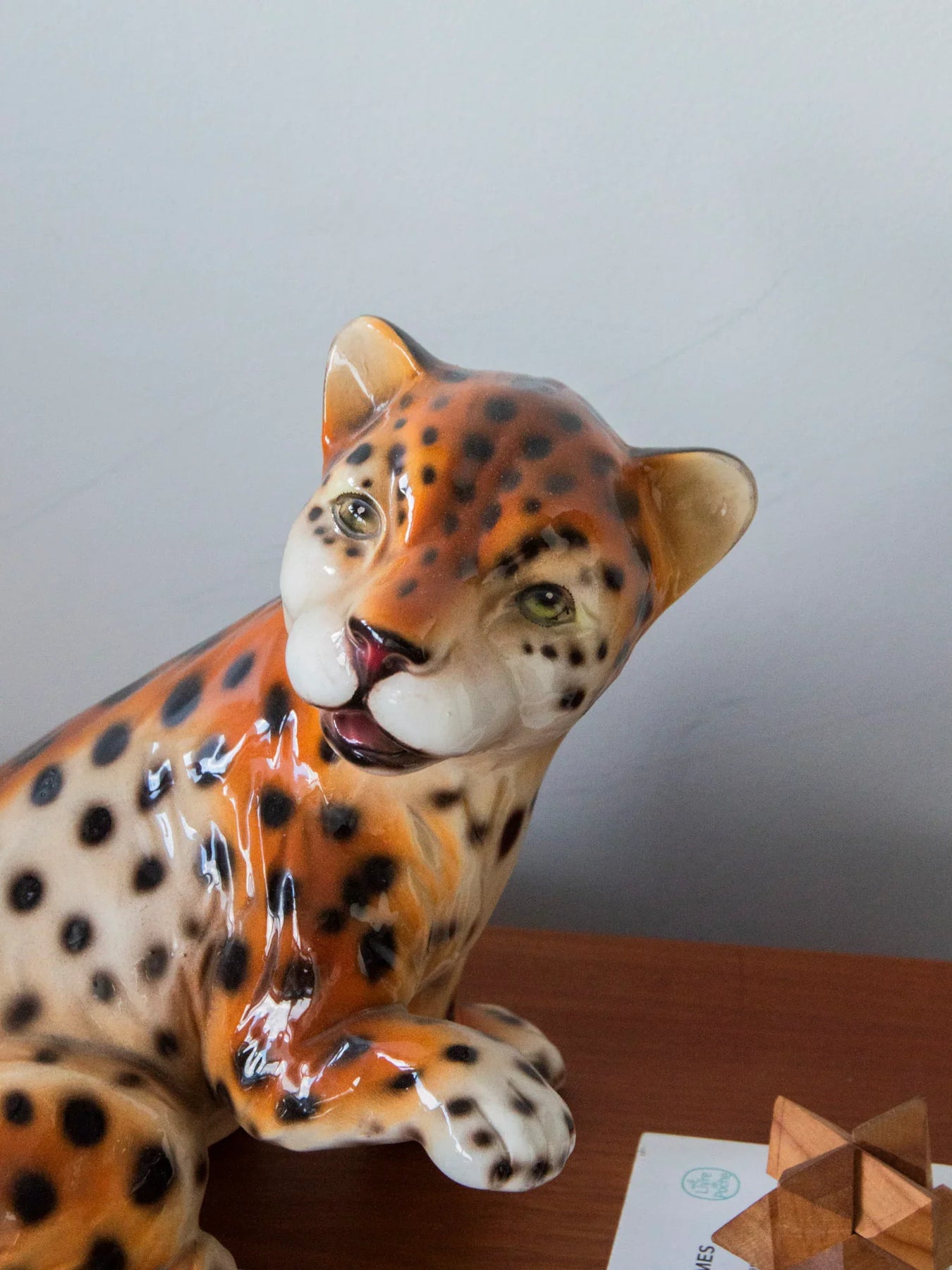Discover this young Italian ceramic leopard from the 1970s, whose patinated finish and subtle glaze reveal a high level of craftsmanship. Its expressive gaze and dynamic pose emphasize its sculpted form—muscles and fur folds follow the movement—creating a striking presence that finds its place naturally on a console table, shelf, or as the centerpiece of a contemporary or classic decorative arrangement. There is a small, barely noticeable flaw in the glaze on the back.