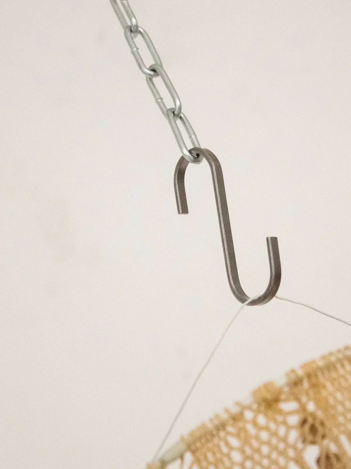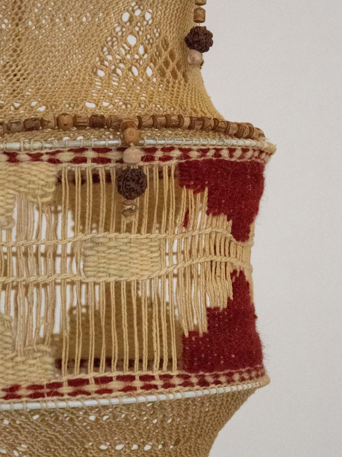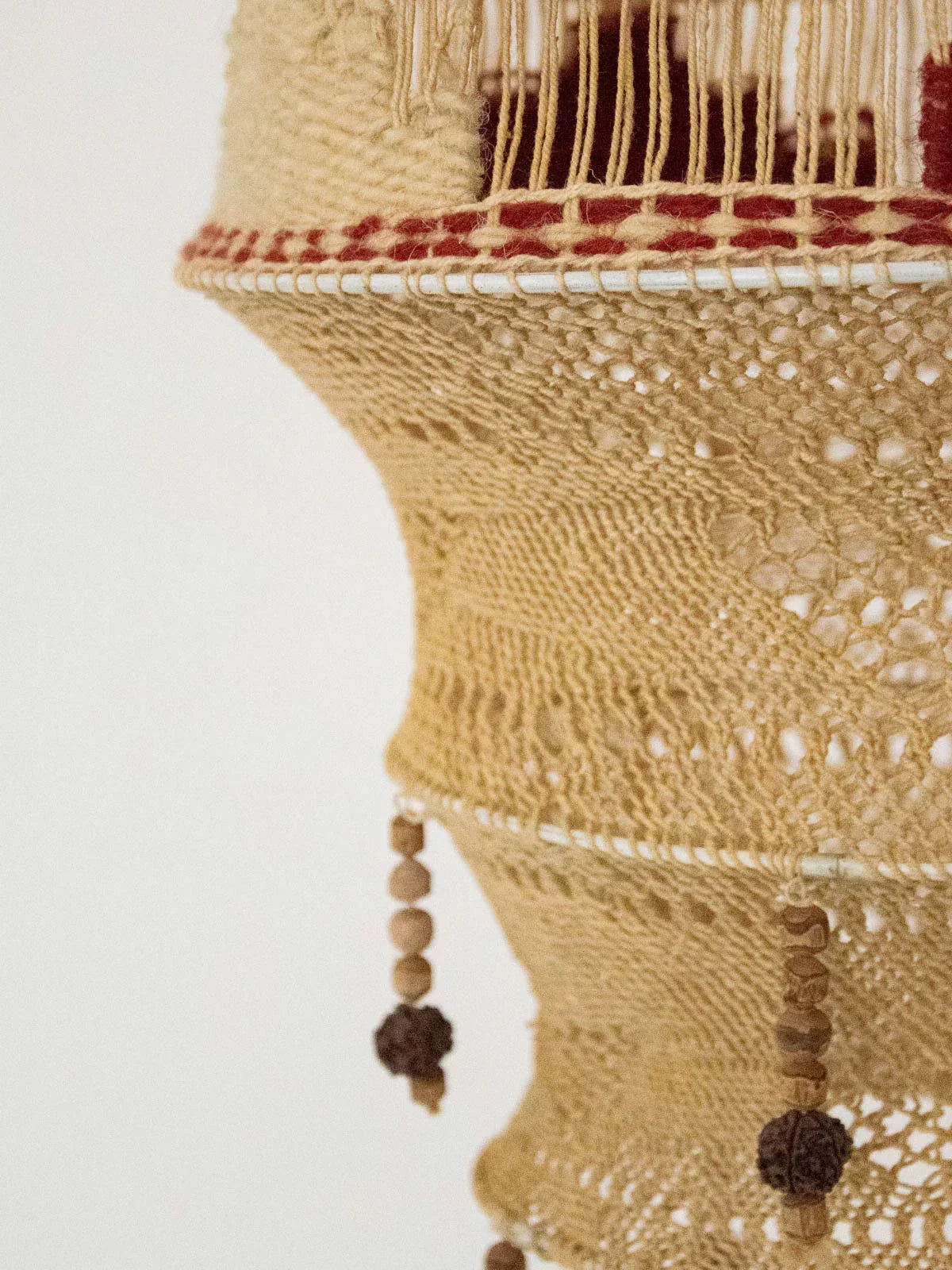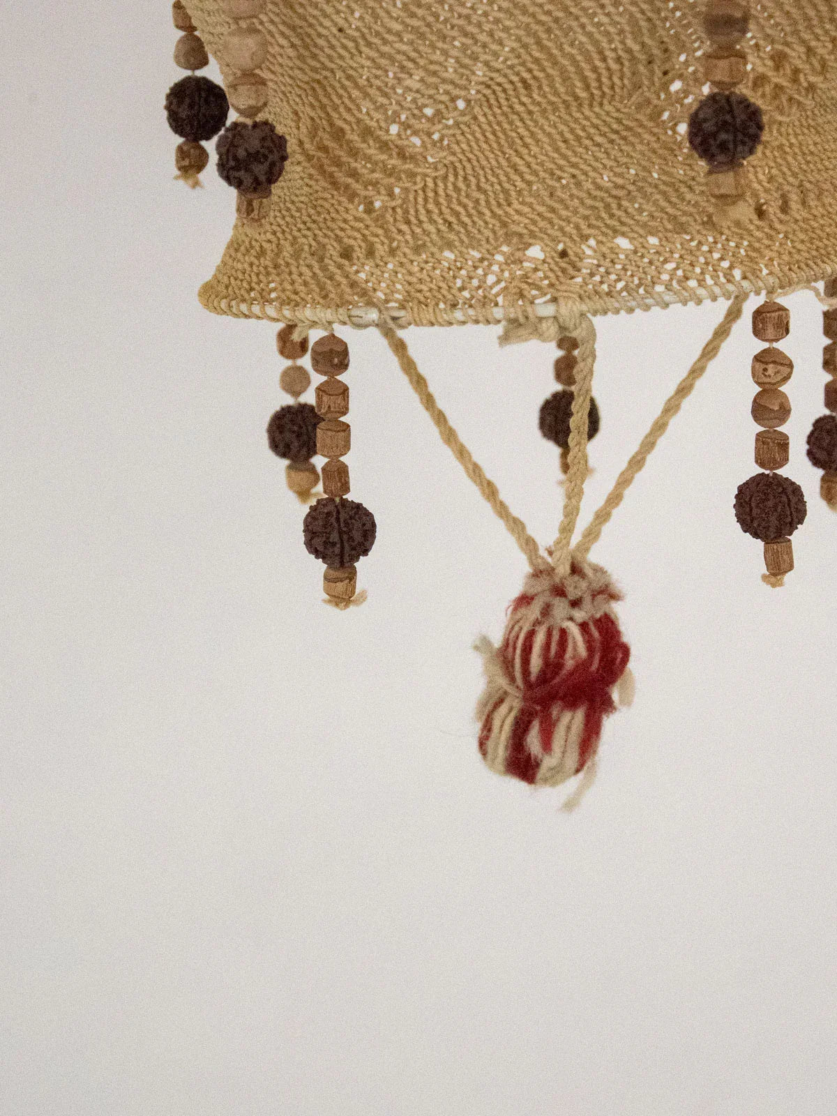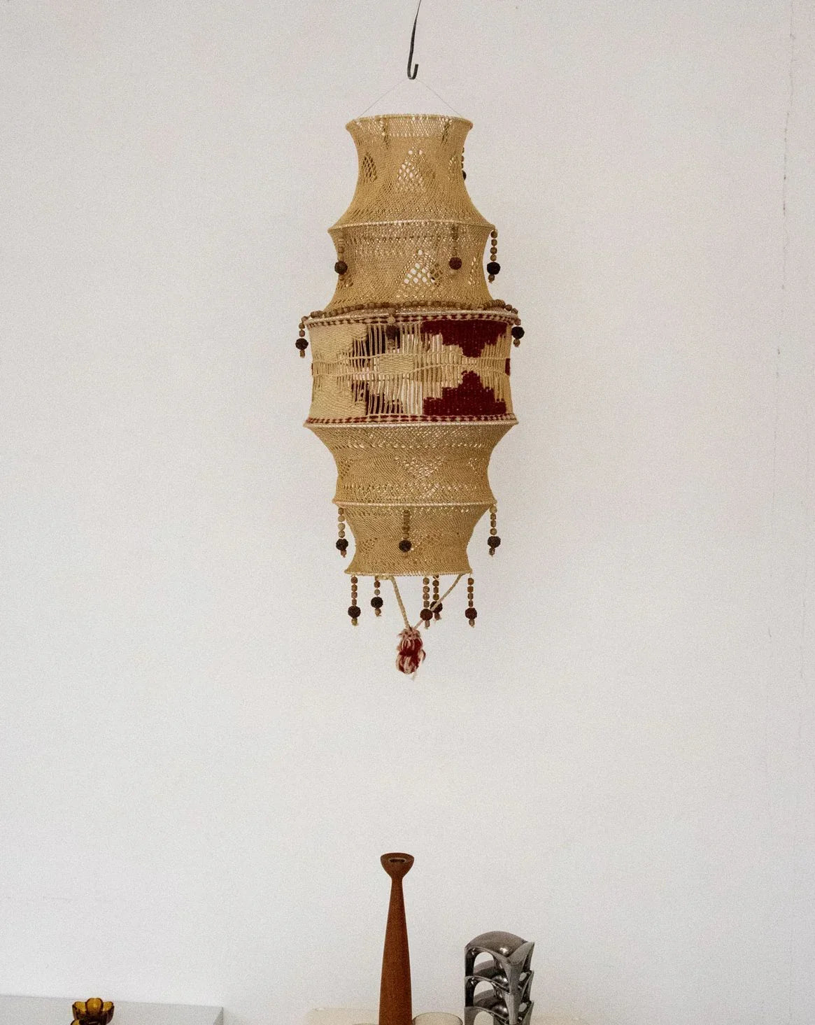Invite this handcrafted 1970s pendant light to illuminate your spaces. Woven from rope and wool and punctuated with wooden beads, it exudes a warm, bohemian aesthetic. Its slender silhouette hangs gracefully, making it ideal as a lampshade above a side table or placed as a decorative accent to create a natural focal point. The handcrafted details are evident, offering a soft, textured ambiance that enhances a simple yet inviting interior.