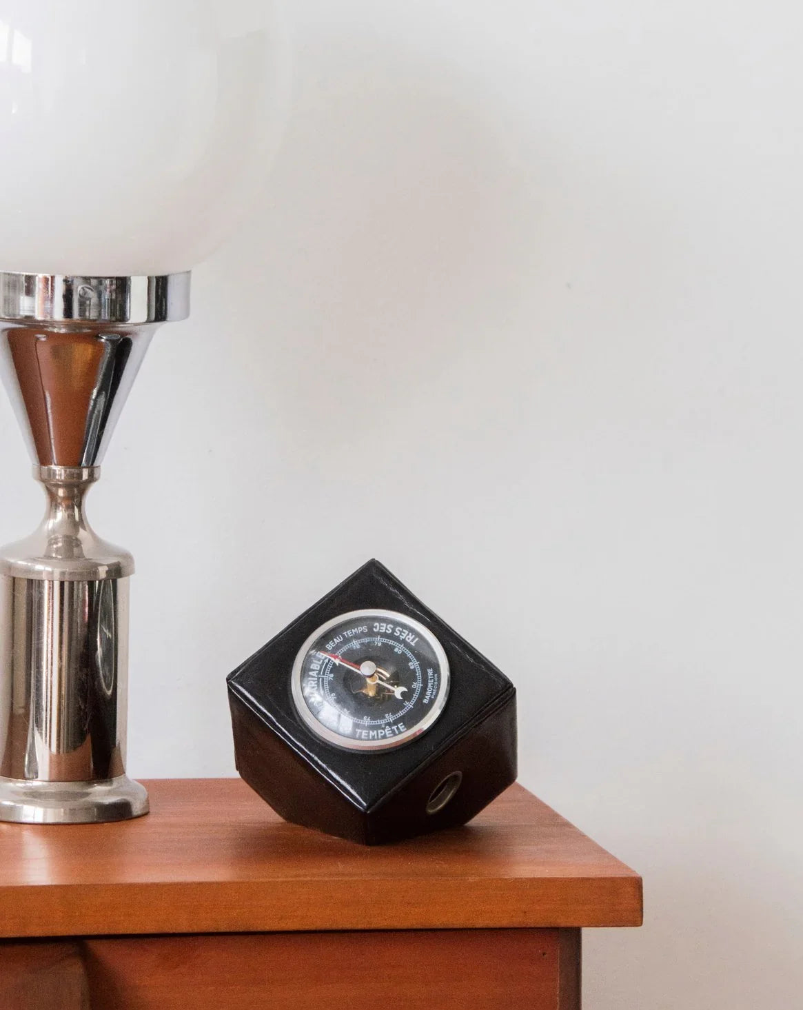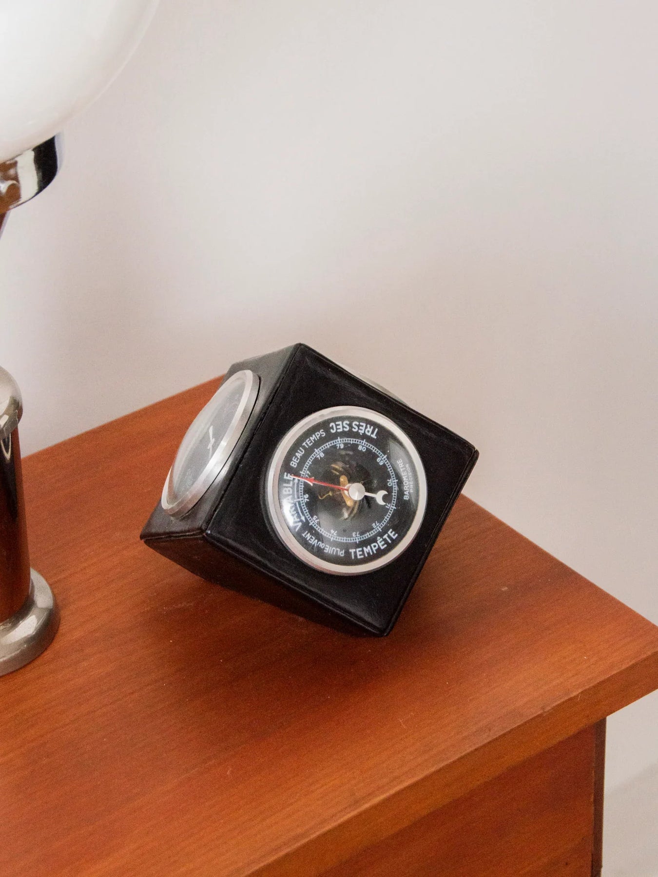 Discover this 1960s weather station, clad in leather, with an elegant and timeless design that blends retro style with contemporary simplicity. Equipped with three German precision instruments—a thermometer, barometer, and hygrometer—it provides a reliable reading of the indoor climate and fits perfectly on a desk or bedroom dresser. Its sophisticated look and fine materials create a warm and refined atmosphere, ideal for complementing your daily routine. In excellent cosmetic and working condition.
