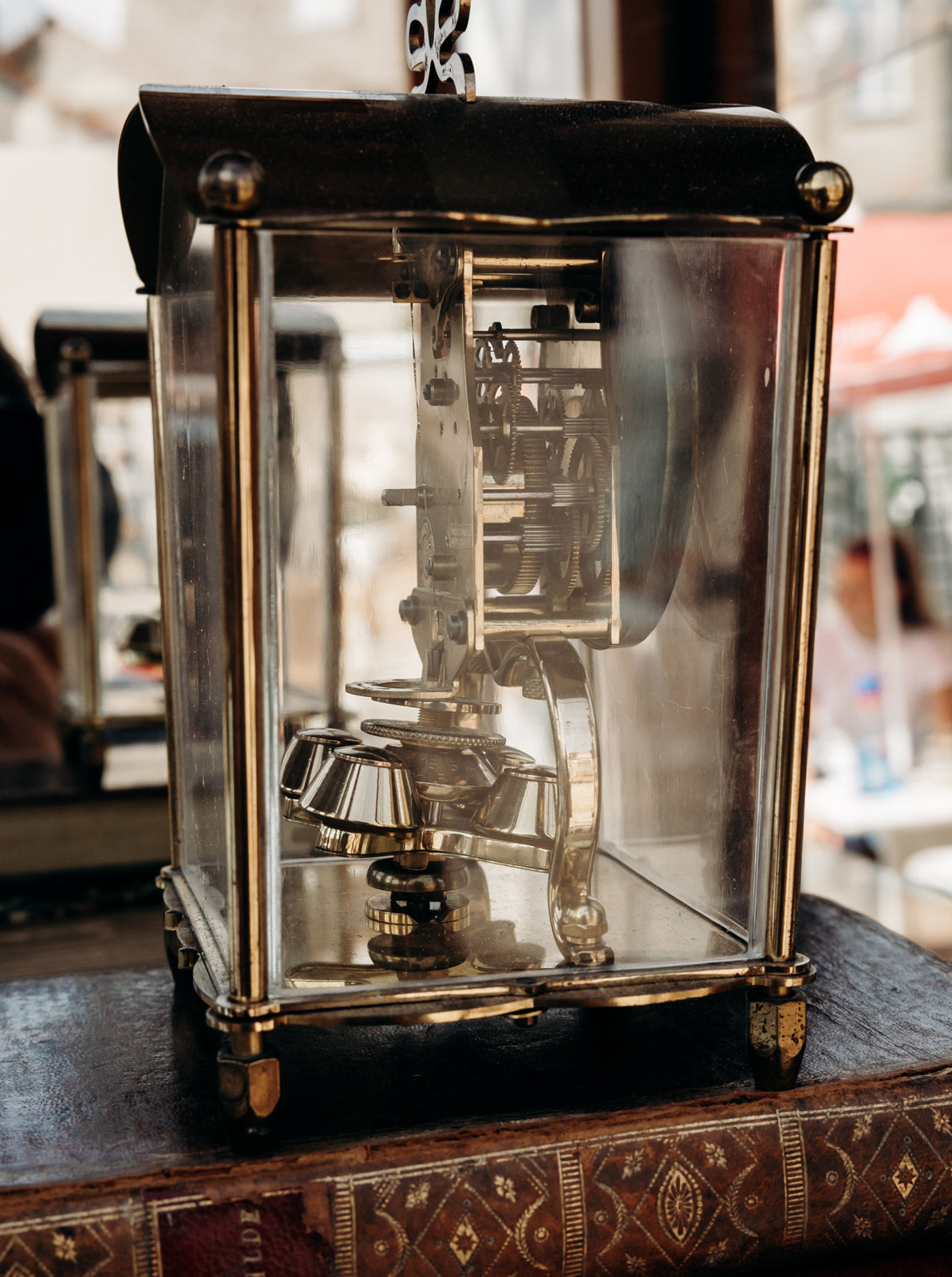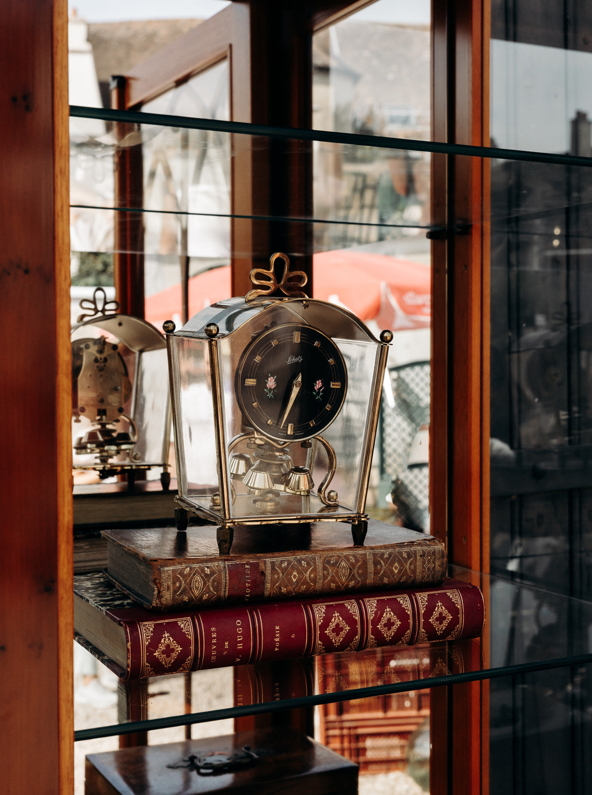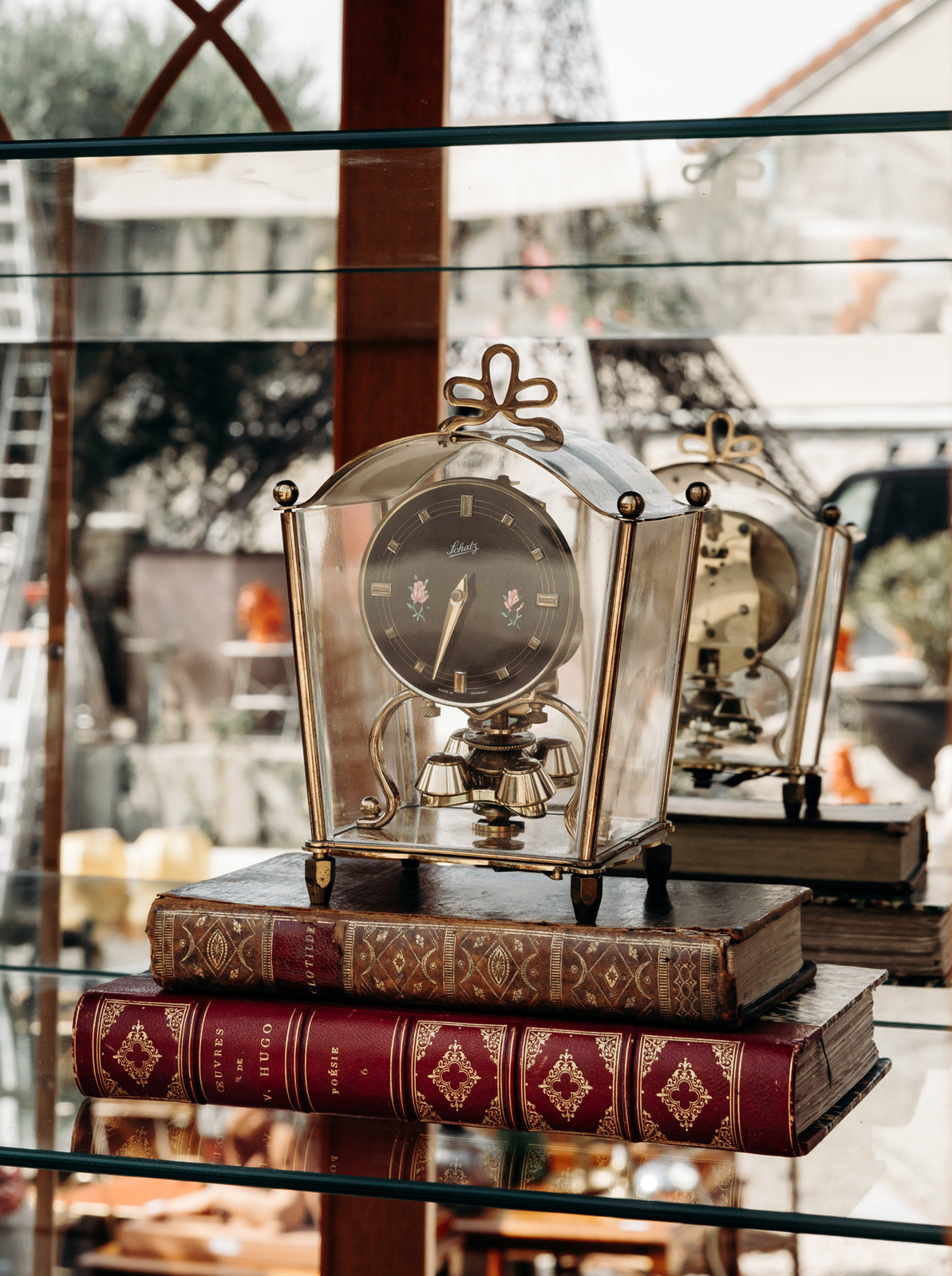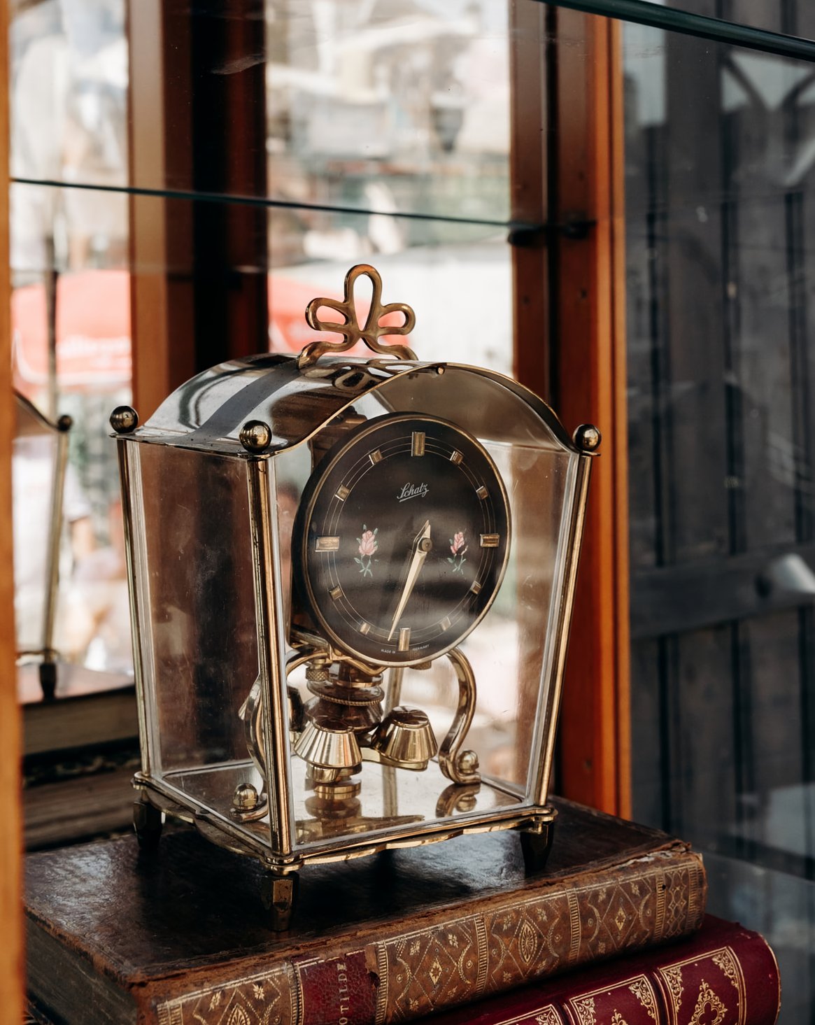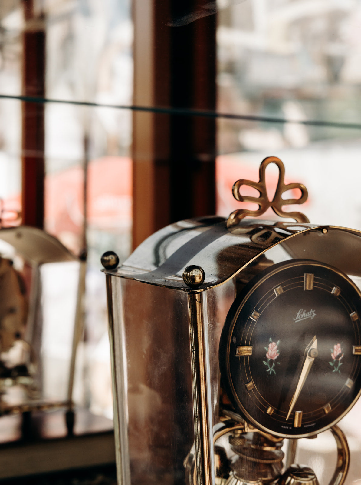 Discover this antique Schatz brass glass-fronted clock, made in Germany, with delicate painted rose details on the front. A few scratches and a light patina of oxidation tell its story and give it an authentic charm, combining vintage elegance and character to enrich your interior with a timeless touch.