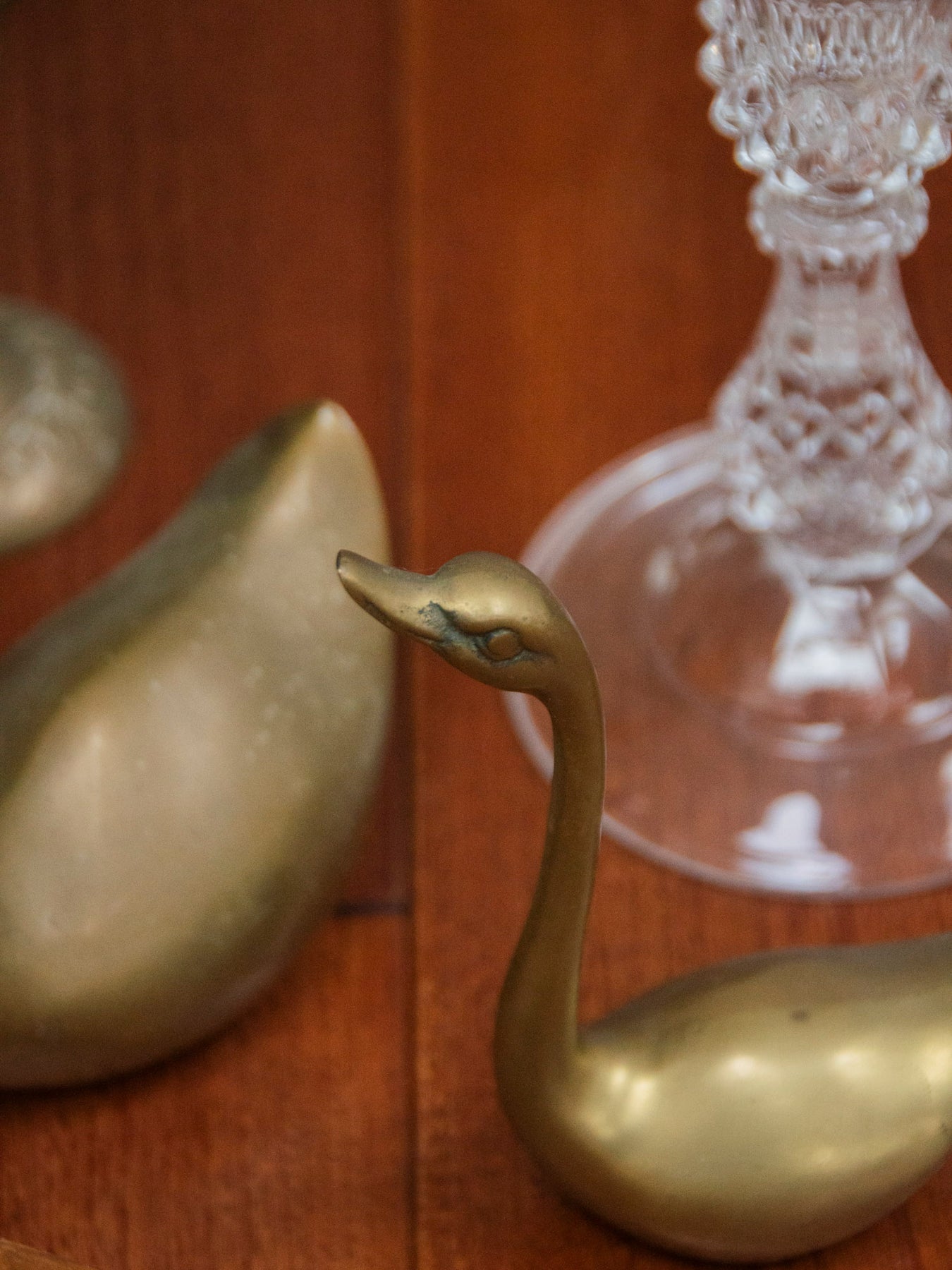 Add a touch of elegance with this pair of gilded brass swans, presented as a small/large duo. The polished brass catches the light and highlights their stylized lines, bringing a touch of understated refinement. Placed together on a console, bookcase, or coffee table, they create a balanced display and play on the contrast in scale to structure the space. A versatile decorative accessory, they bring a warm and contemplative atmosphere to your home.