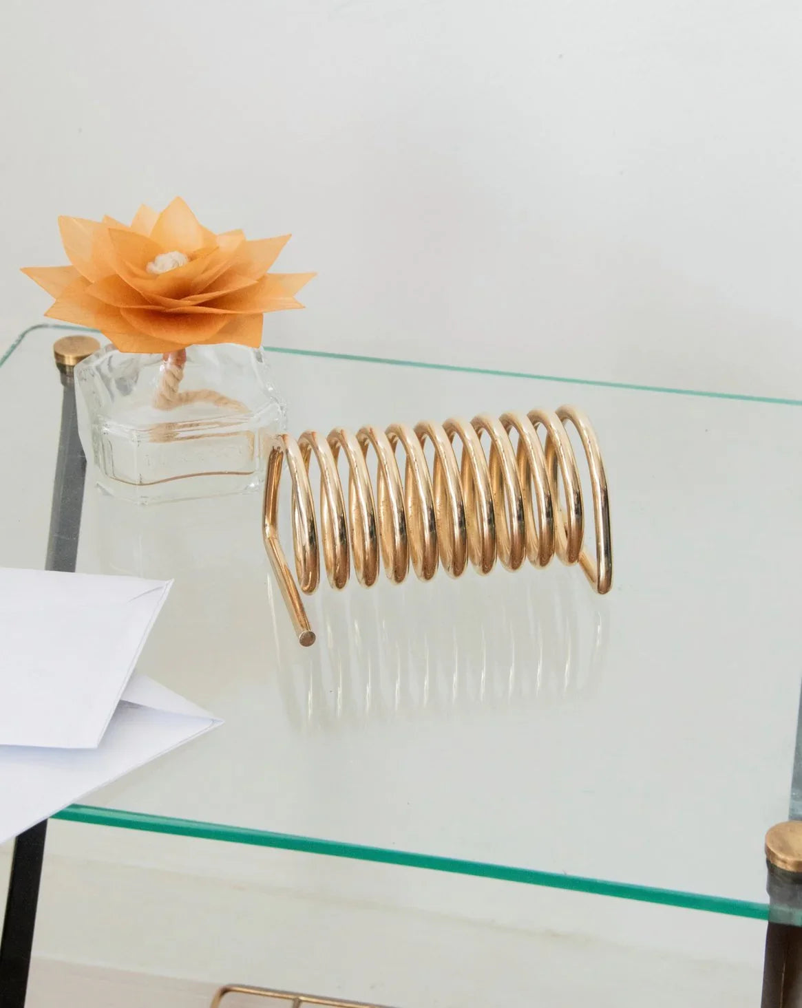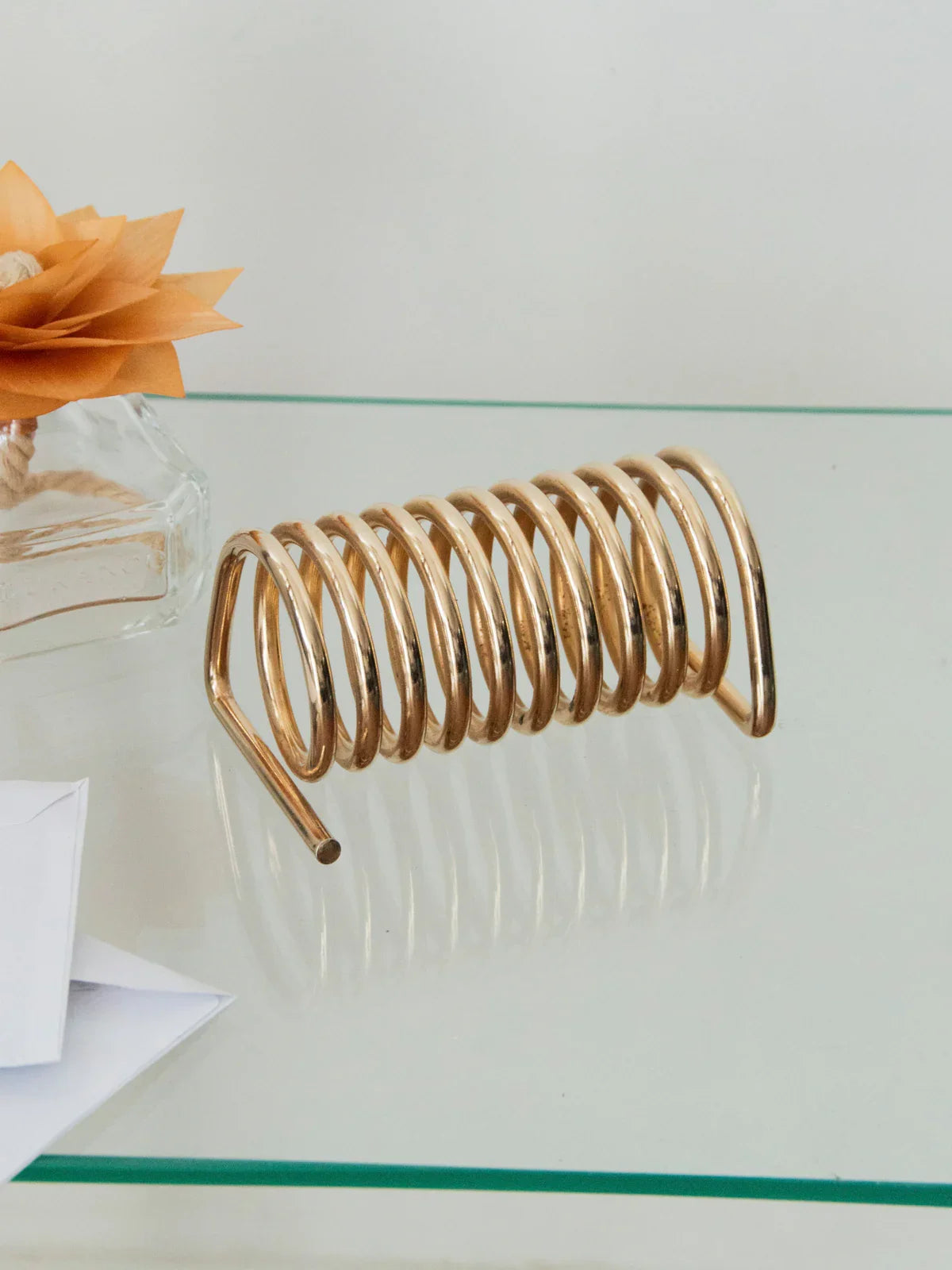 Add a gold-tone metal letter holder with a spring-inspired design to bring a touch of delicate originality to your office or entryway. Crafted from solid metal, it offers a subtle presence and a warm finish while organizing envelopes, cards, and everyday mail. Compact and well-proportioned, it sits easily on a console table or desk, structuring the space with elegance and simplicity. Minor signs of wear inside.