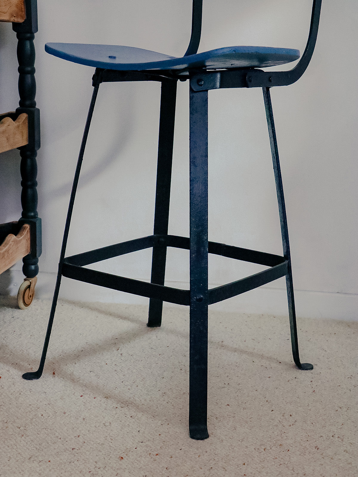 Embrace this industrial-style wooden and steel bar stool, where the combination of warm wood and a black base elegantly structures the piece. The blue seat and backrest add a touch of understated color, while the reclining backrest ensures relaxed comfort for long conversations at the counter. Its carefully considered height makes it ideal for a worktop or bar, and its slender proportions keep the space feeling airy. It creates a warm, urban, and decidedly contemporary atmosphere.