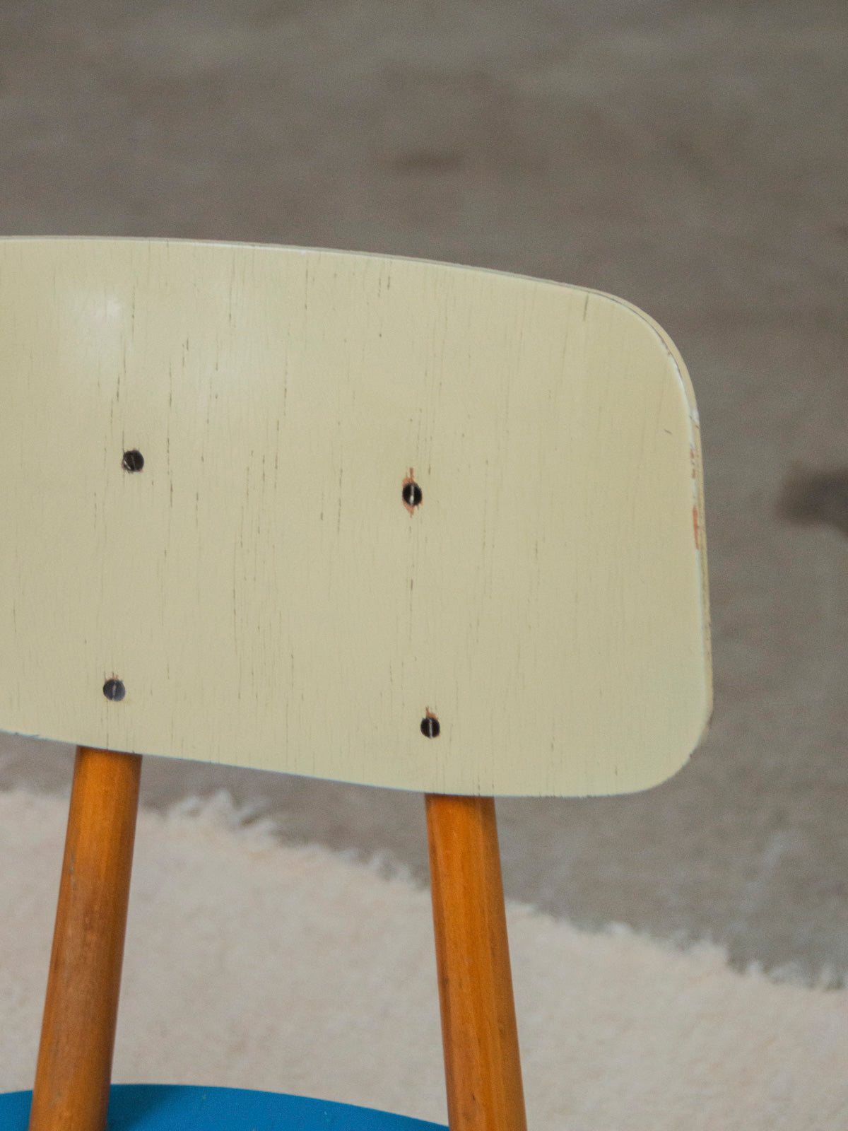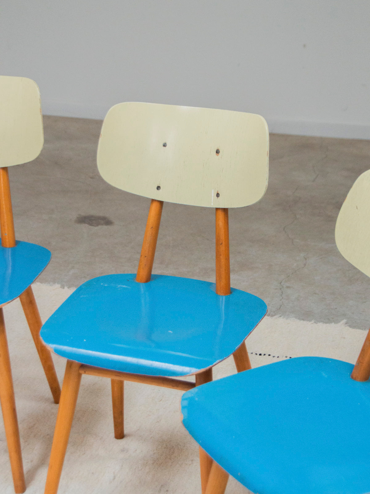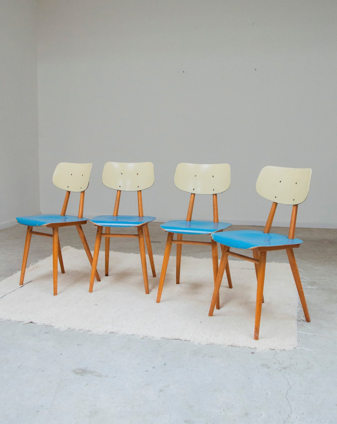 Découvrez ce lot de quatre chaises Thonet en bois clair au look rétro, reposant sur des pieds compas qui apportent légèreté et équilibre. Leur assise peinte en bleu et leurs dossiers arrondis beige créent un contraste raffiné, idéal pour une salle à manger intimiste ou un coin café. Proportions compactes et assises accueillantes assurent une présence conviviale et graphique. Quelques manques et usures.