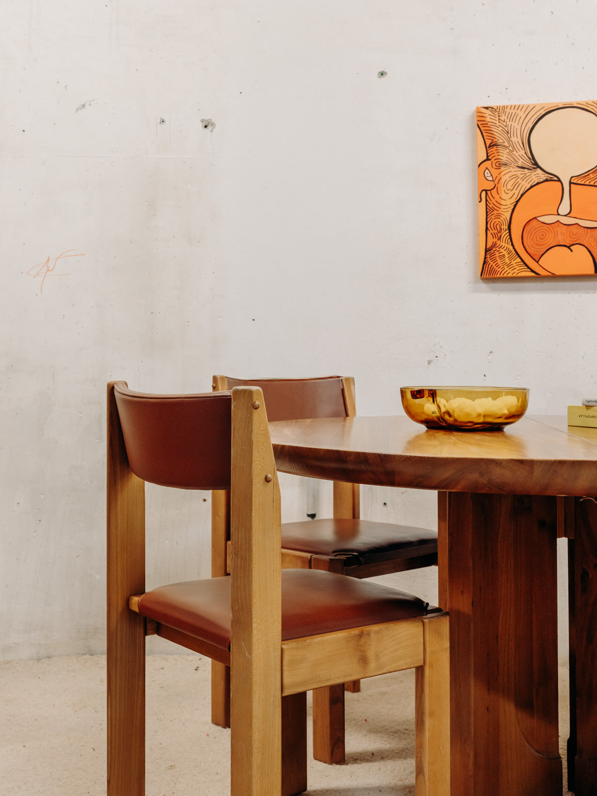 Invitez cette série de quatre chaises signées Luigi Gorgoni pour Roche Bobois, où la structure en bois clair rencontre une assise et un dossier en skai marron pour un équilibre élégant. Leur silhouette légère et leurs proportions réfléchies s'adaptent autour d'une table de repas ou comme assises ponctuelles, offrant confort et présence sans alourdir l'espace. Portées par l'esthétique des années 80, elles apportent une chaleur rétro contemporaine idéale pour un intérieur sobre et accueillant.