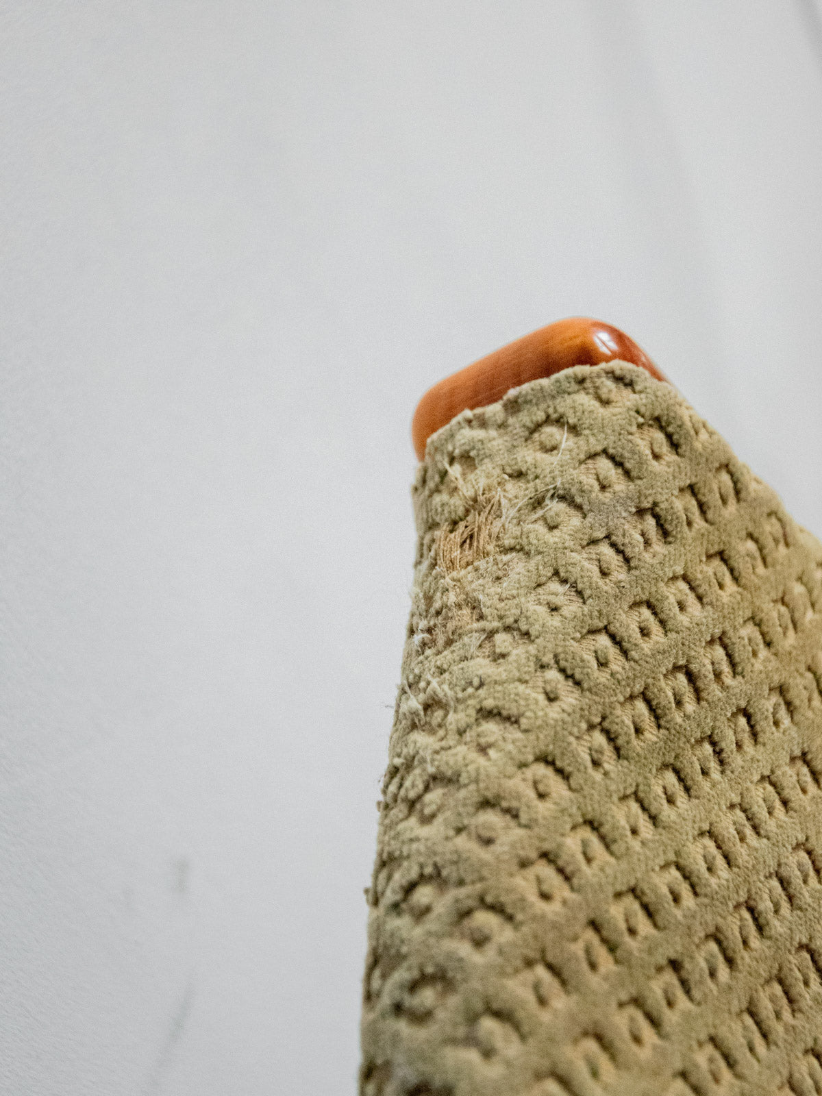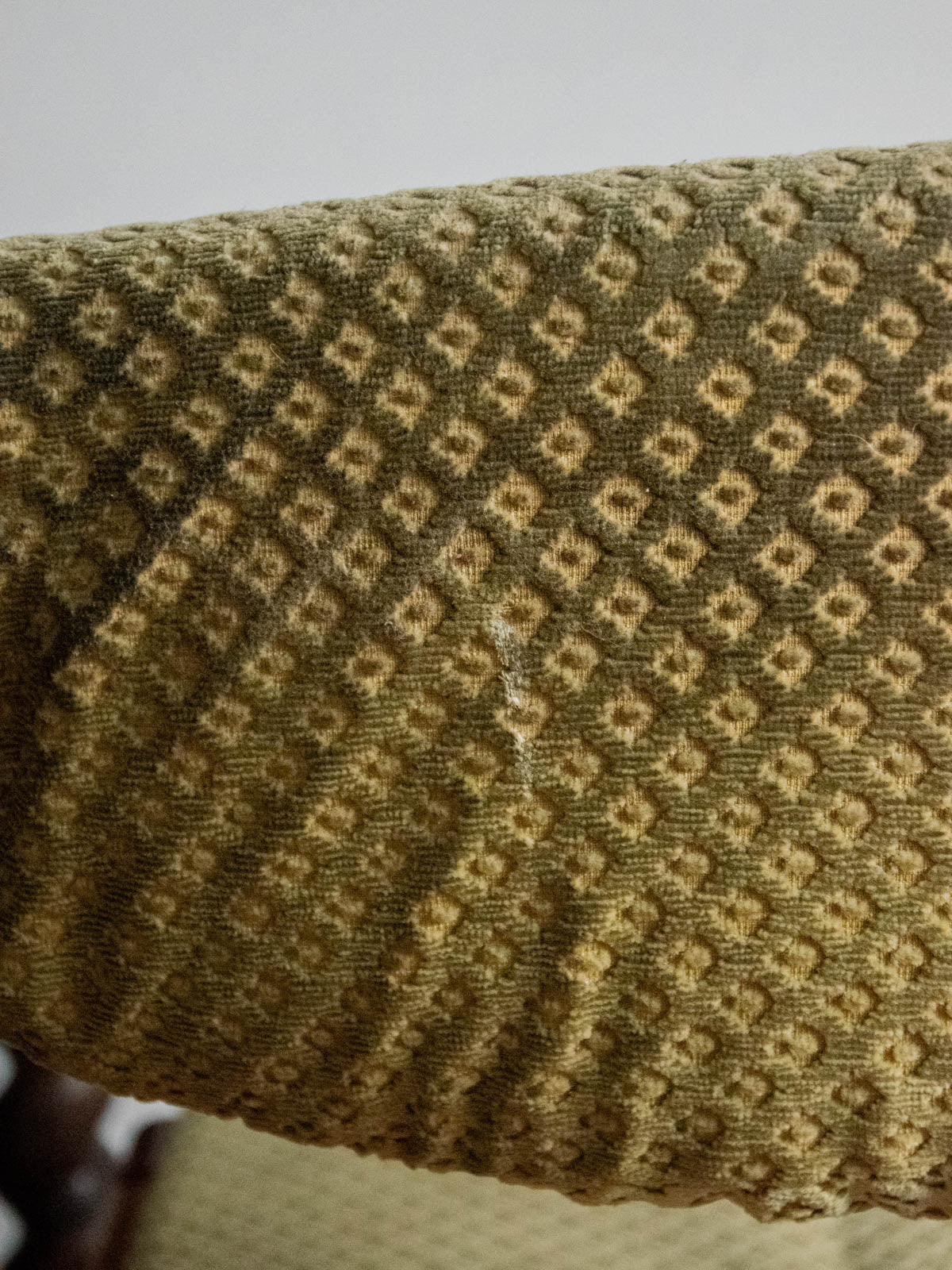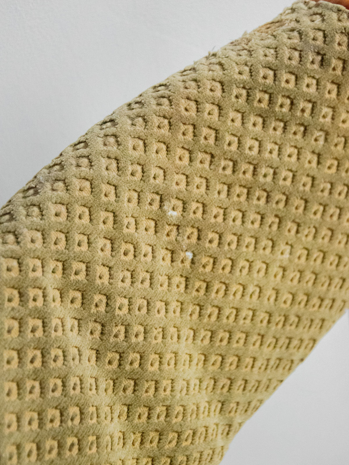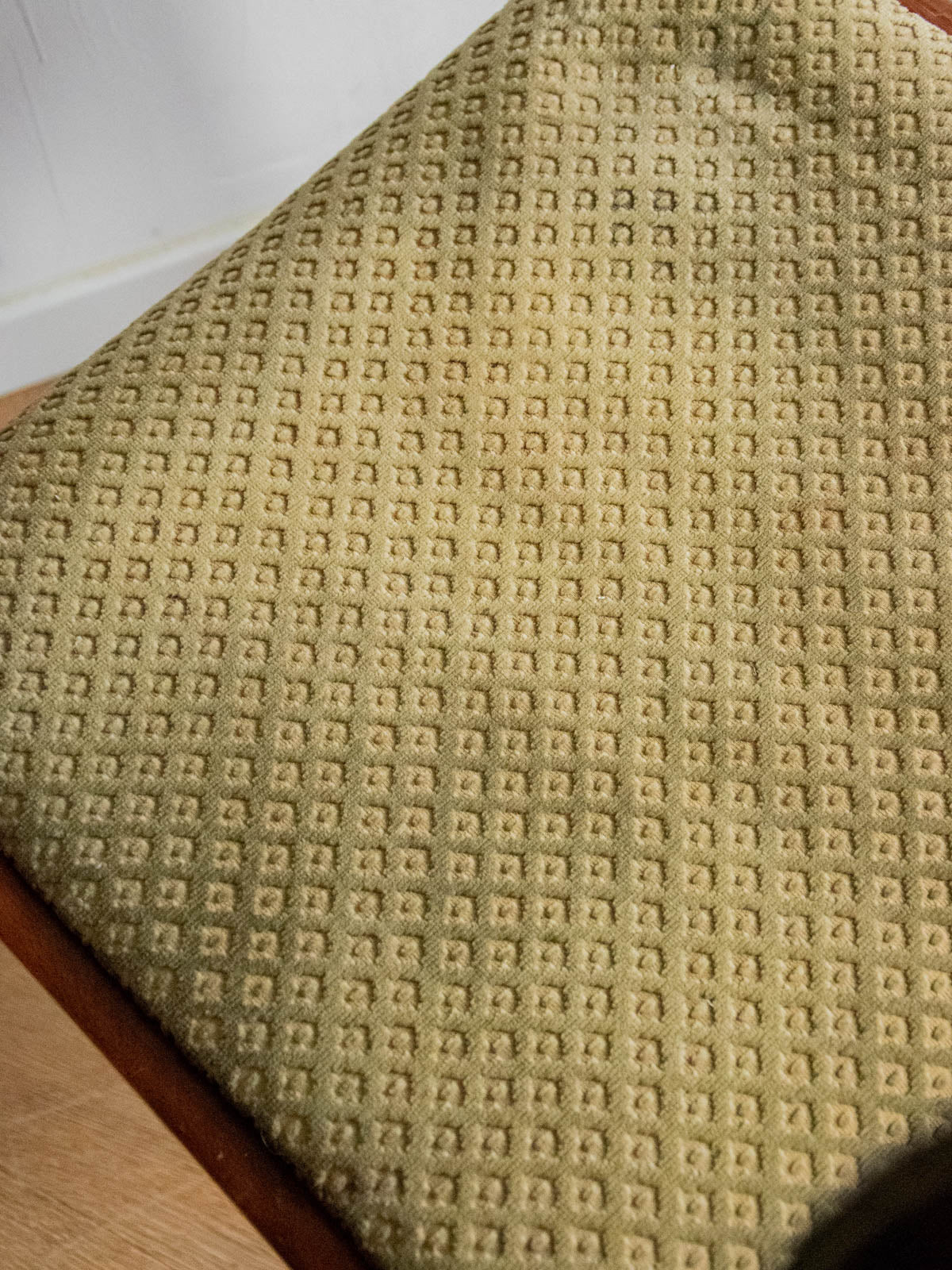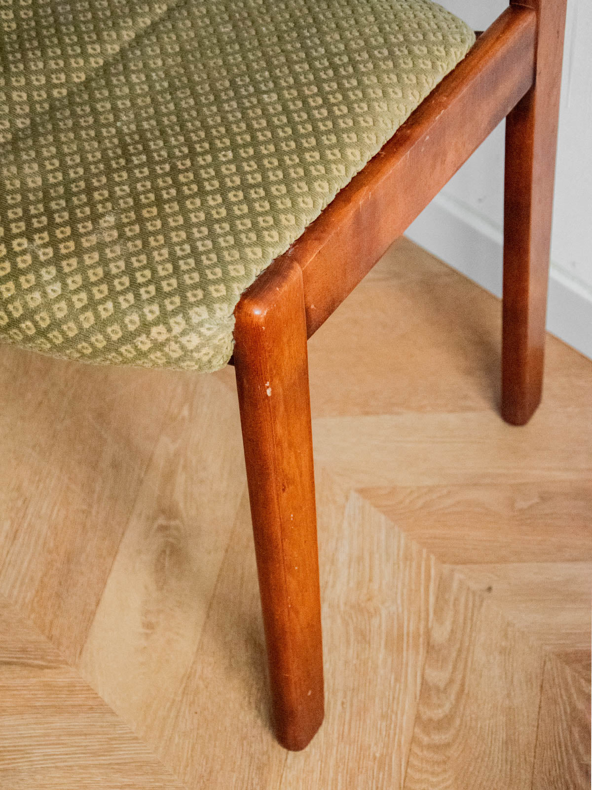 Choose these wooden chairs with their understated, contemporary style, upholstered in a faded khaki and beige patterned fabric that adds a naturally aged touch to your interior. Their wooden frame ensures a stable seat, and their carefully considered proportions offer comfort and elegance, ideal around a dining table or as extra seating in an office or entryway. Sold in pairs, they create a soft and sophisticated atmosphere, blending discreet modernity with understated charm. Minor wear is visible. Sold individually; two quantities are available.