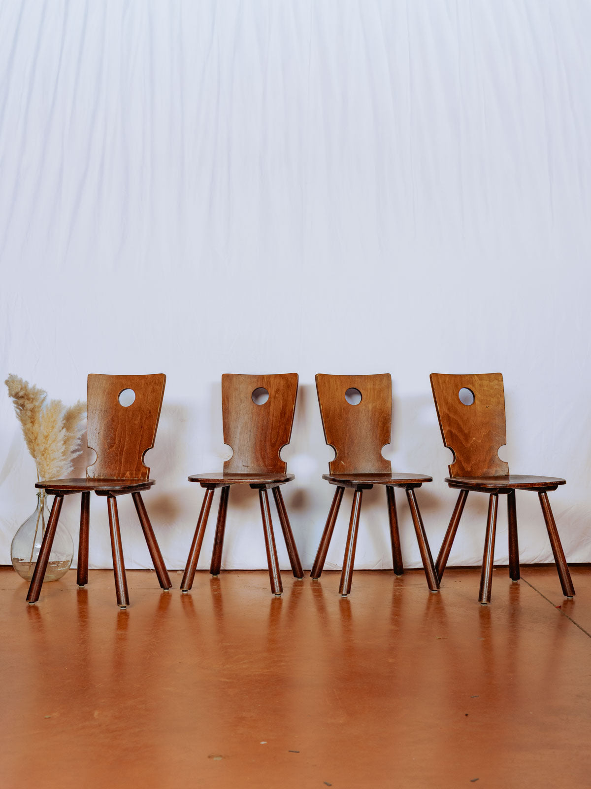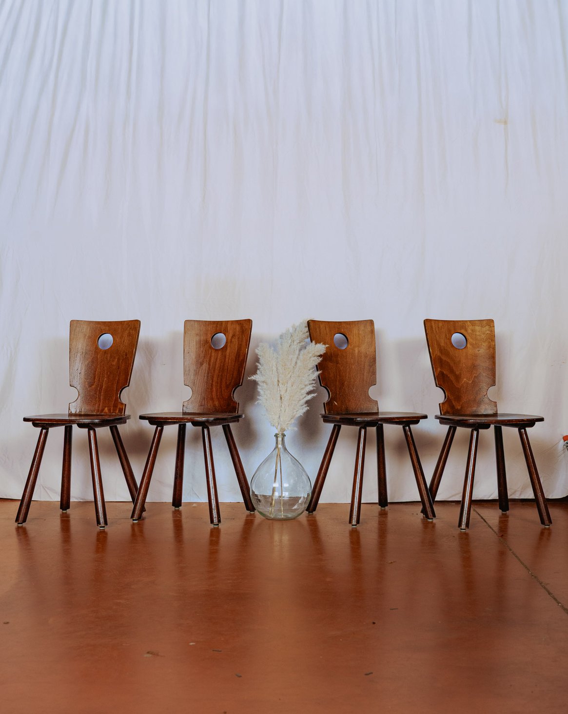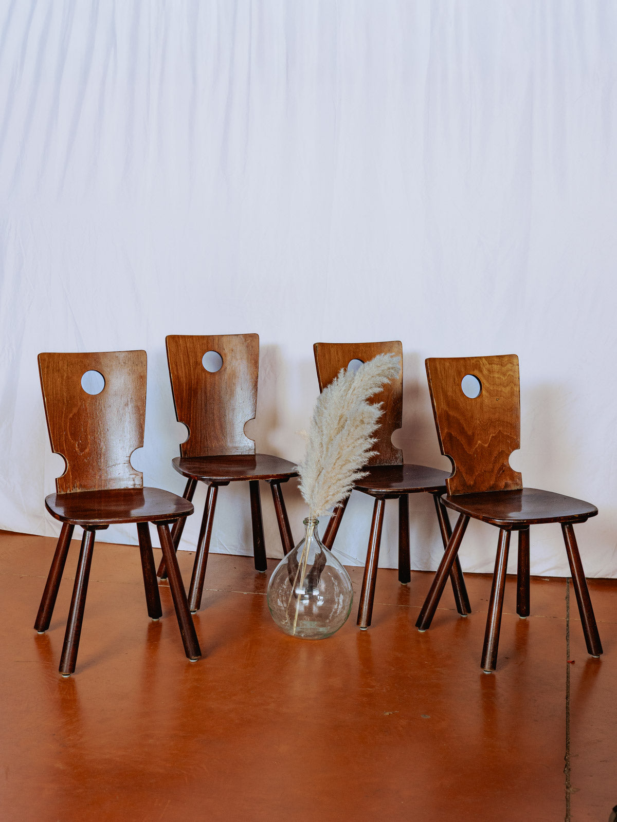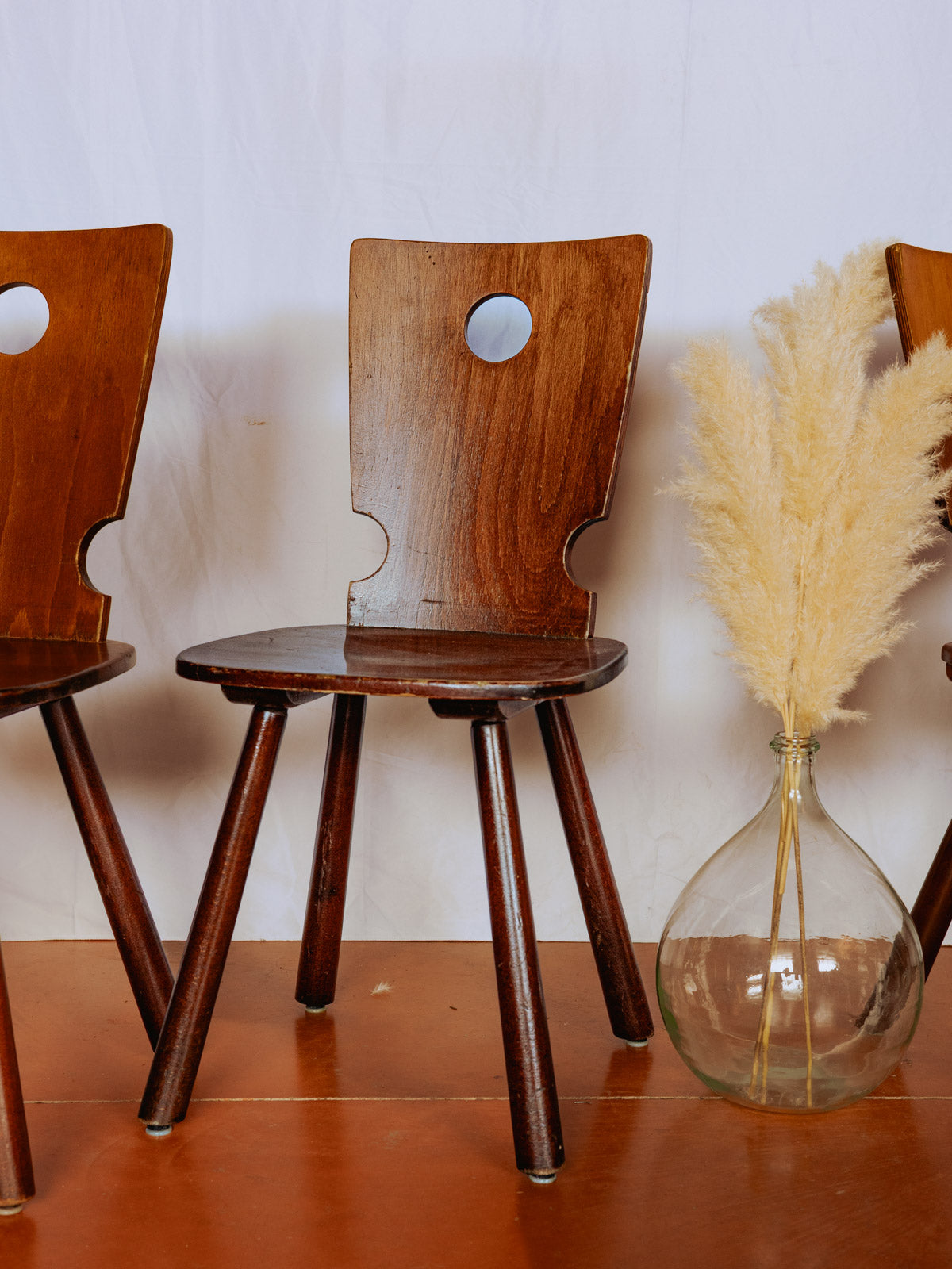 Choose these dark-stained wooden chairs, with their simple yet warm style, whose solid backrest, openwork with a central circle and two lower semi-circles, provides a graphic signature and practical hanging option; sturdy and well-proportioned, they are suitable for a dining room, cafe, or contemporary dining nook, and are sold in pairs with 10 pairs available. Some signs of wear.
