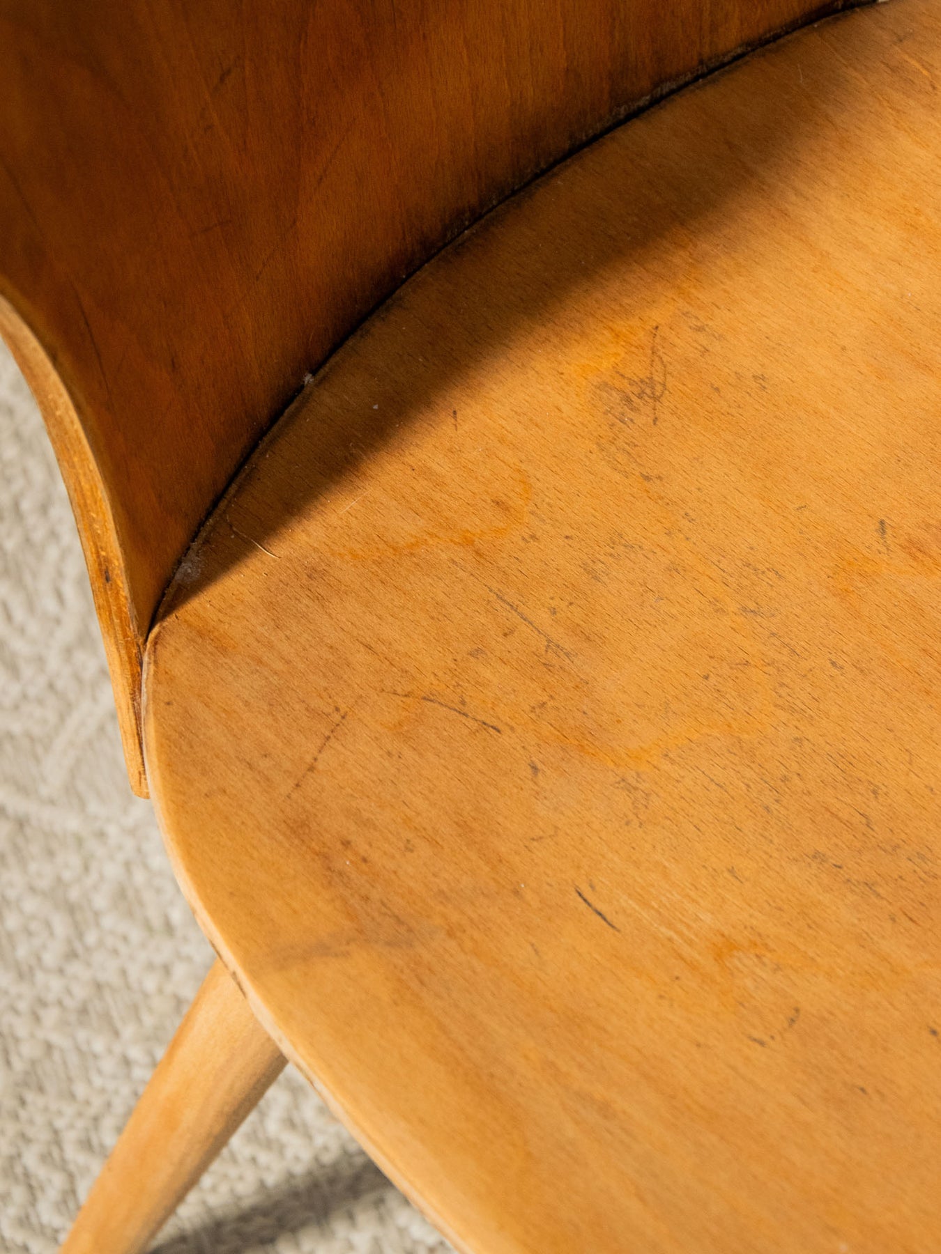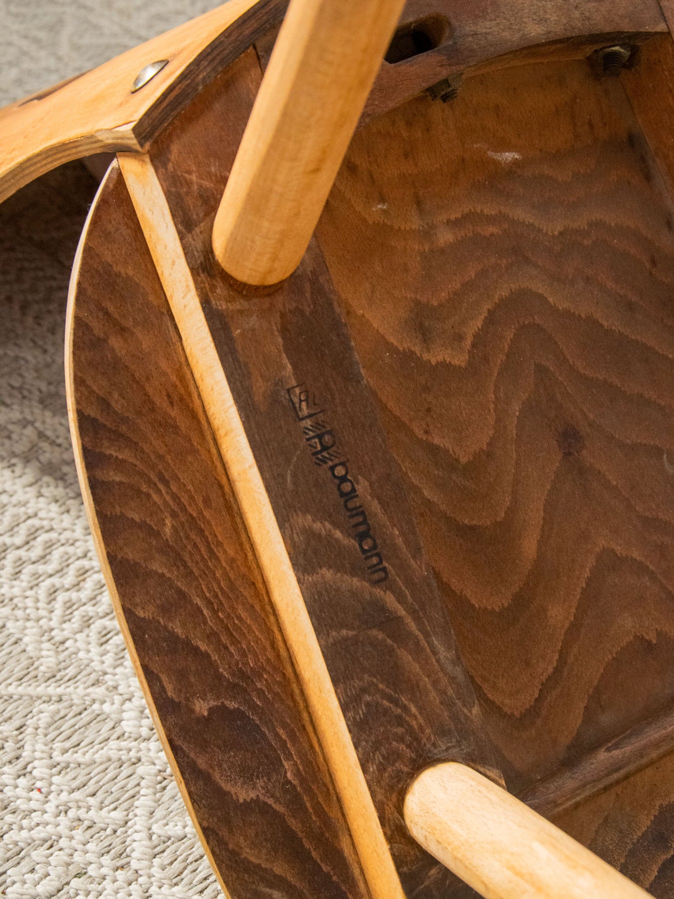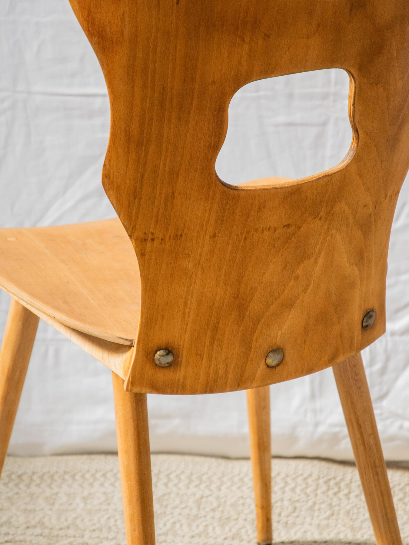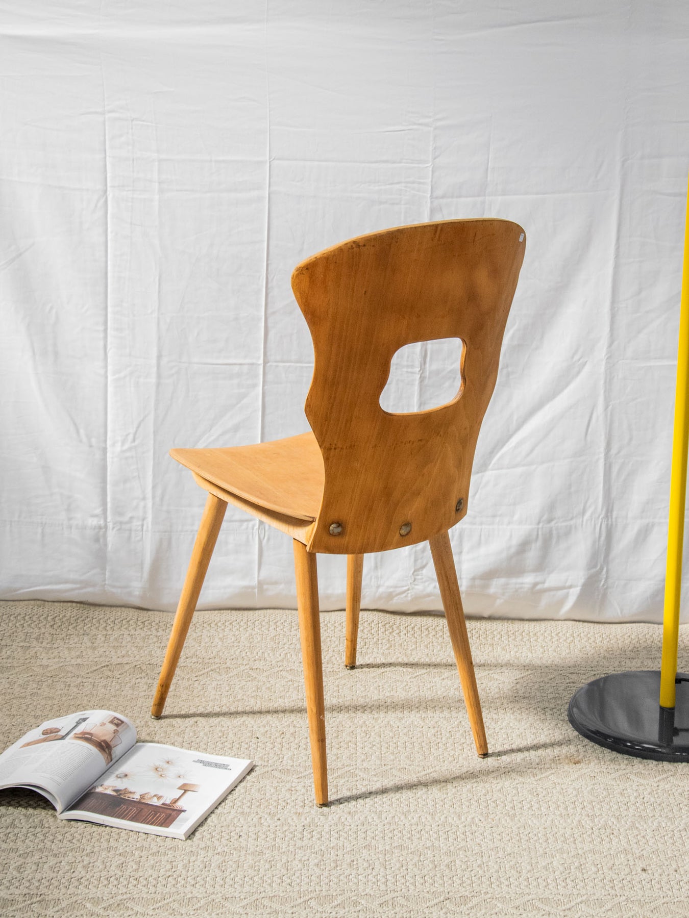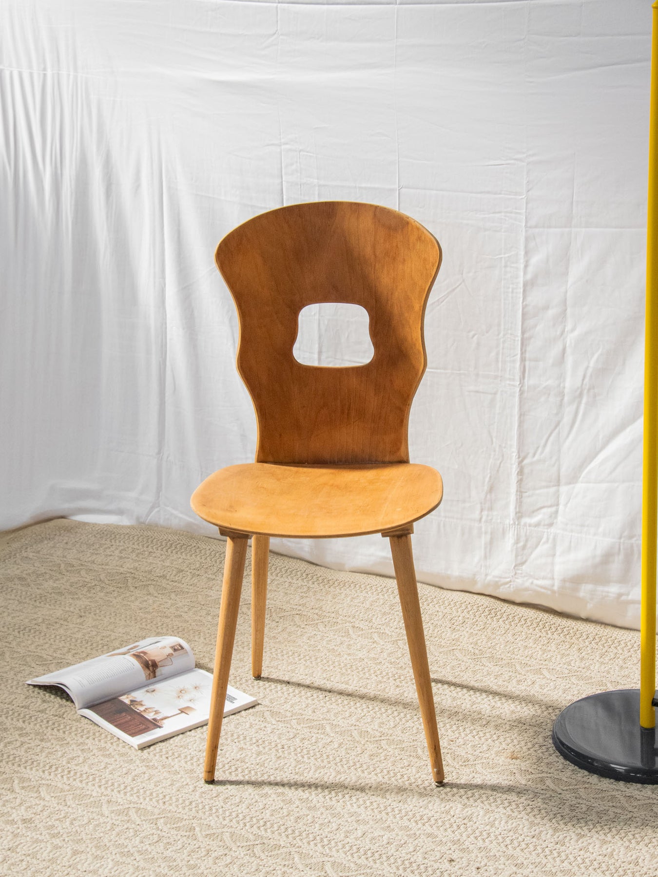 Discover the Baumann light wood chair, a staple of the brutalist style. Its bold cutout in the back and compass legs bring a contemporary touch to a sleek design. Carefully crafted, this piece combines comfort and aesthetics, making it the perfect addition to your modern living space. Both functional and artistic, it will appeal to lovers of unique and refined furniture.