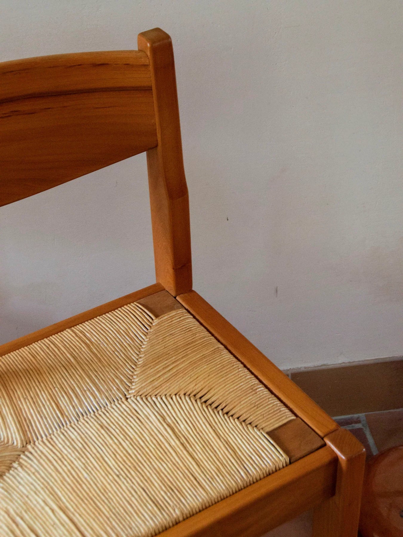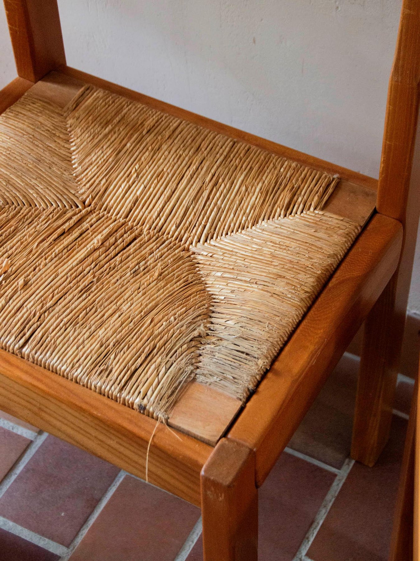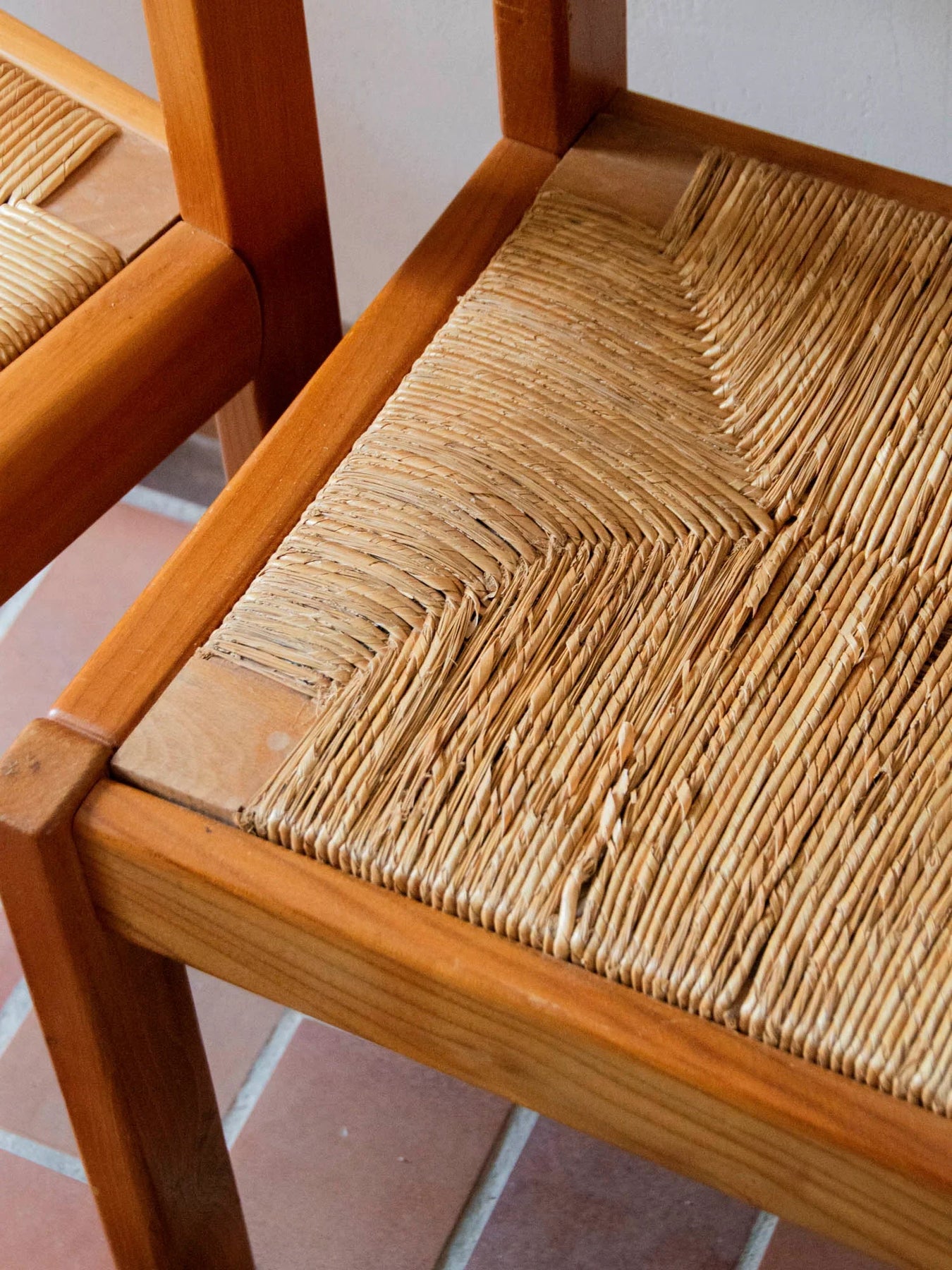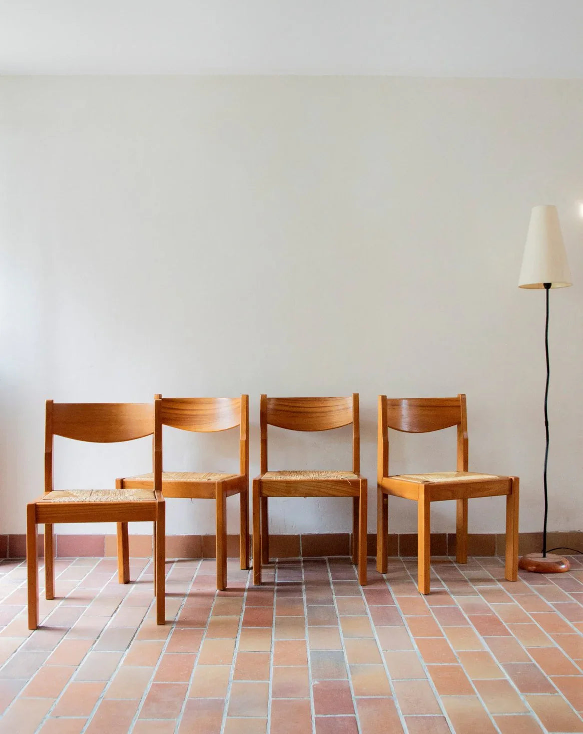 Discover this elegant set of four chairs with straw seats, produced by Maison Regain. Their clean design, subtly combined with a rustic touch, is inspired by the iconic creations of Charlotte Perriand and Luigi Gorgoni for Roche Bobois. Perfect for bringing a neo-rustic ambiance to your interior, these chairs display signs of wear on the seats, attesting to their rich history. The straw seats add a warm touch while offering exceptional comfort.