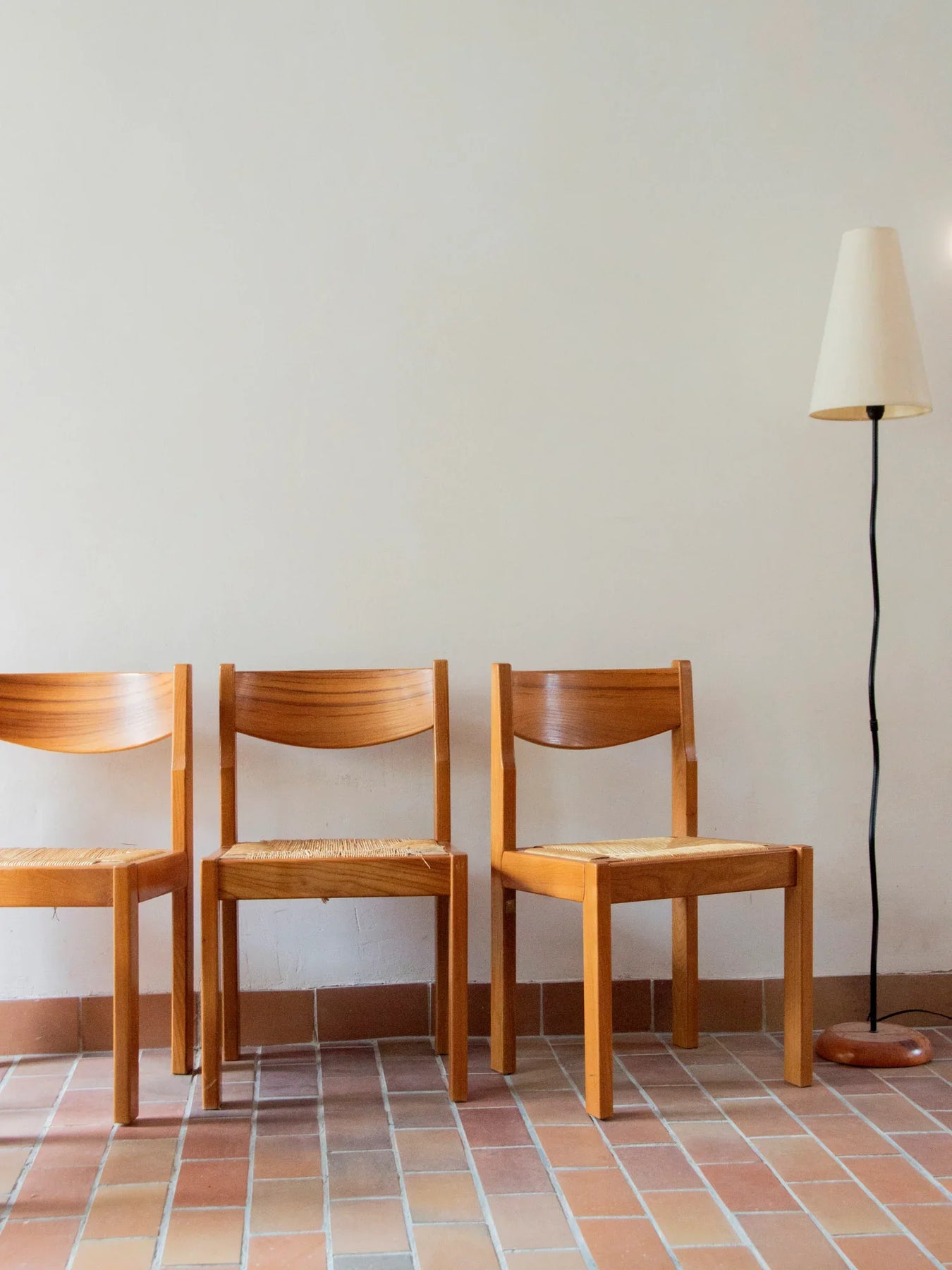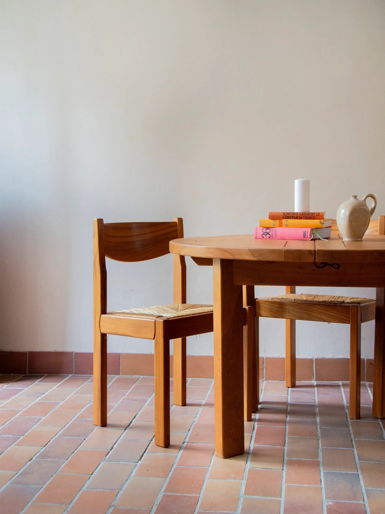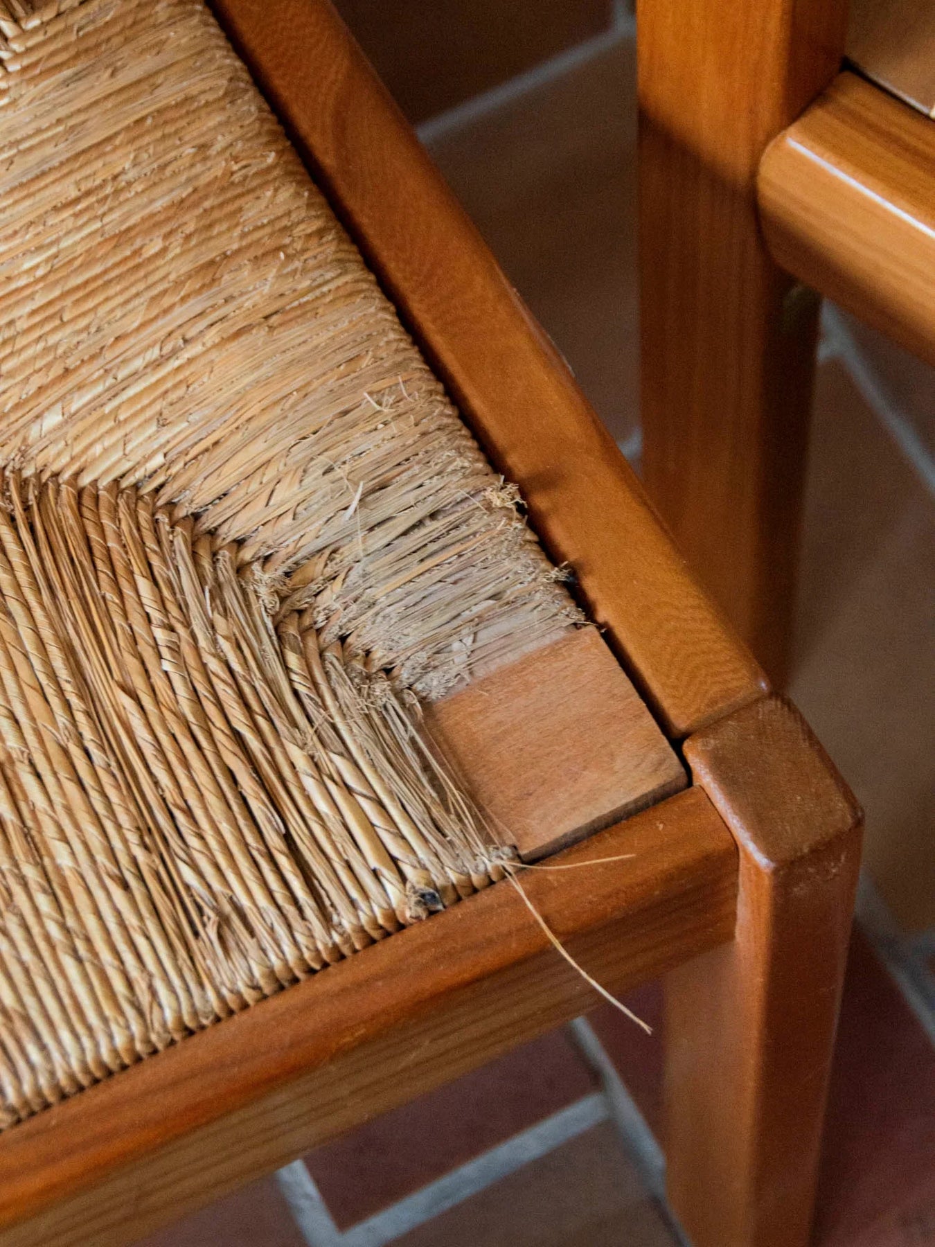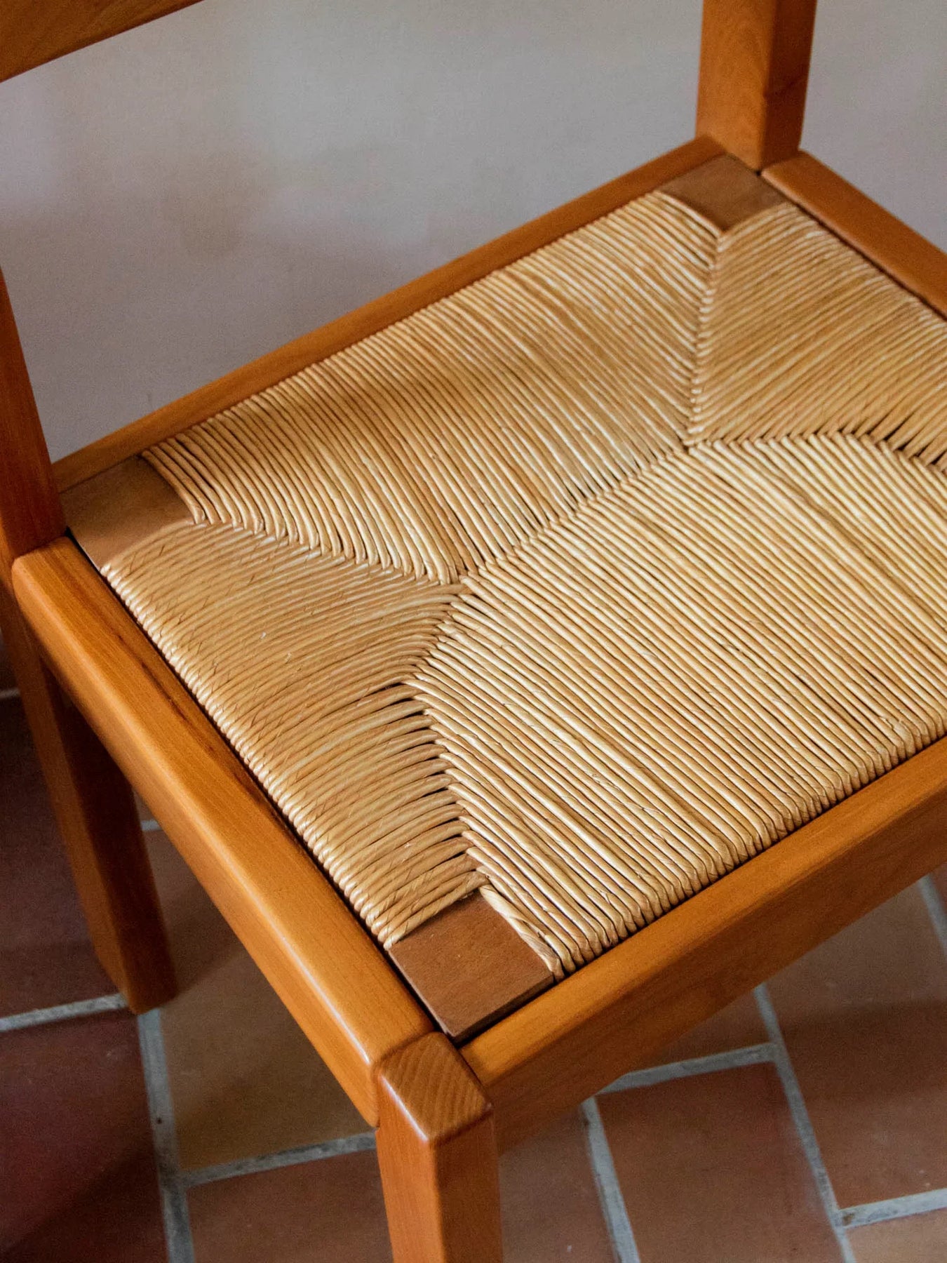 Discover this elegant set of four chairs with straw seats, produced by Maison Regain. Their clean design, subtly combined with a rustic touch, is inspired by the iconic creations of Charlotte Perriand and Luigi Gorgoni for Roche Bobois. Perfect for bringing a neo-rustic ambiance to your interior, these chairs display signs of wear on the seats, attesting to their rich history. The straw seats add a warm touch while offering exceptional comfort.