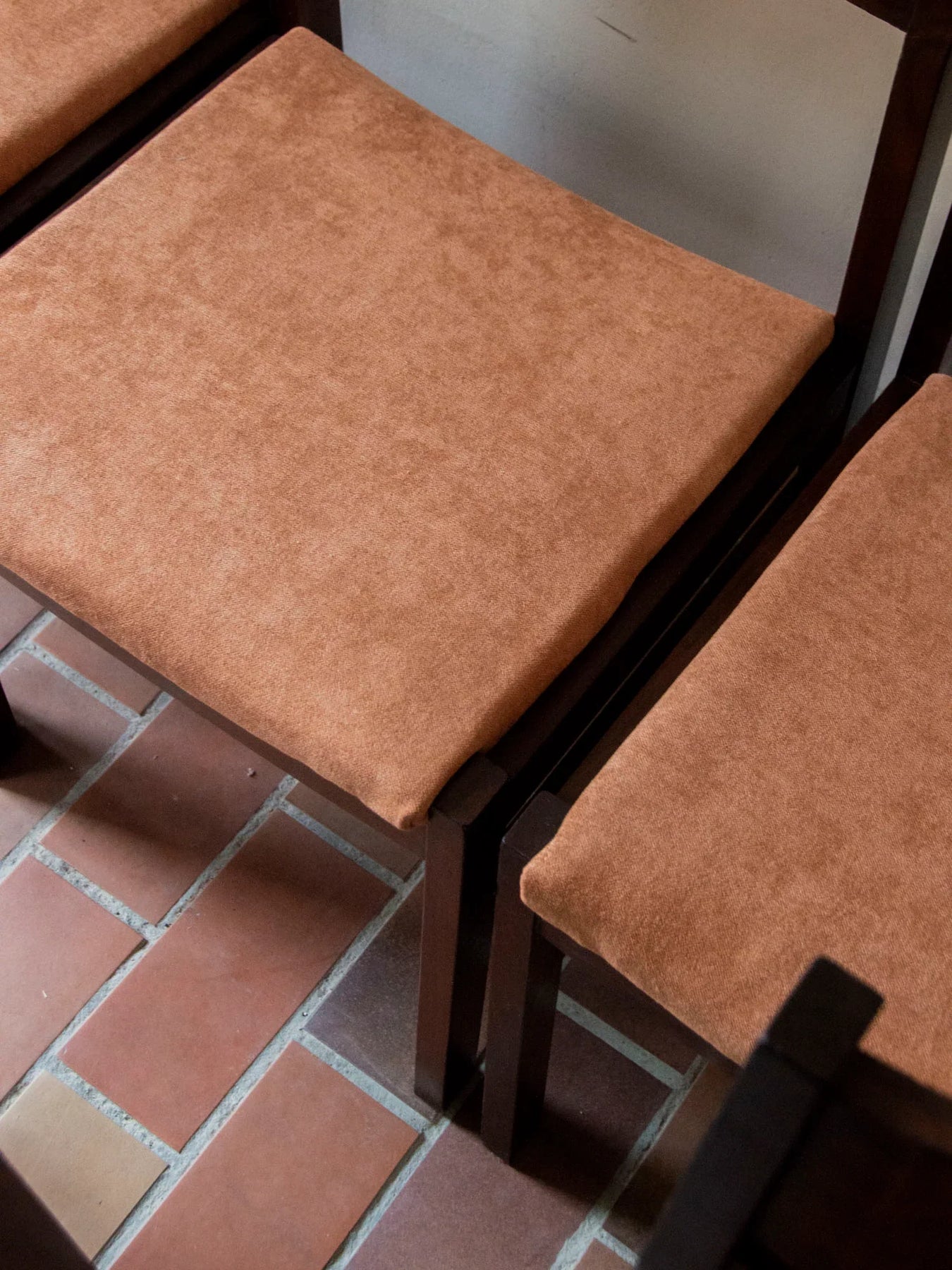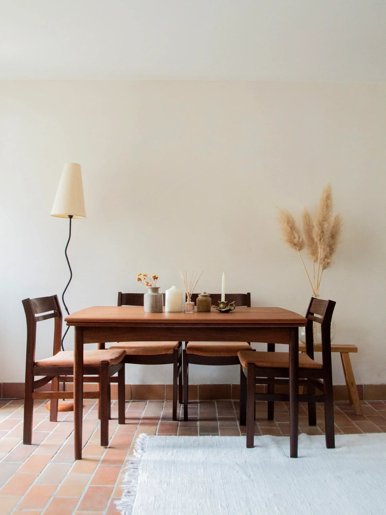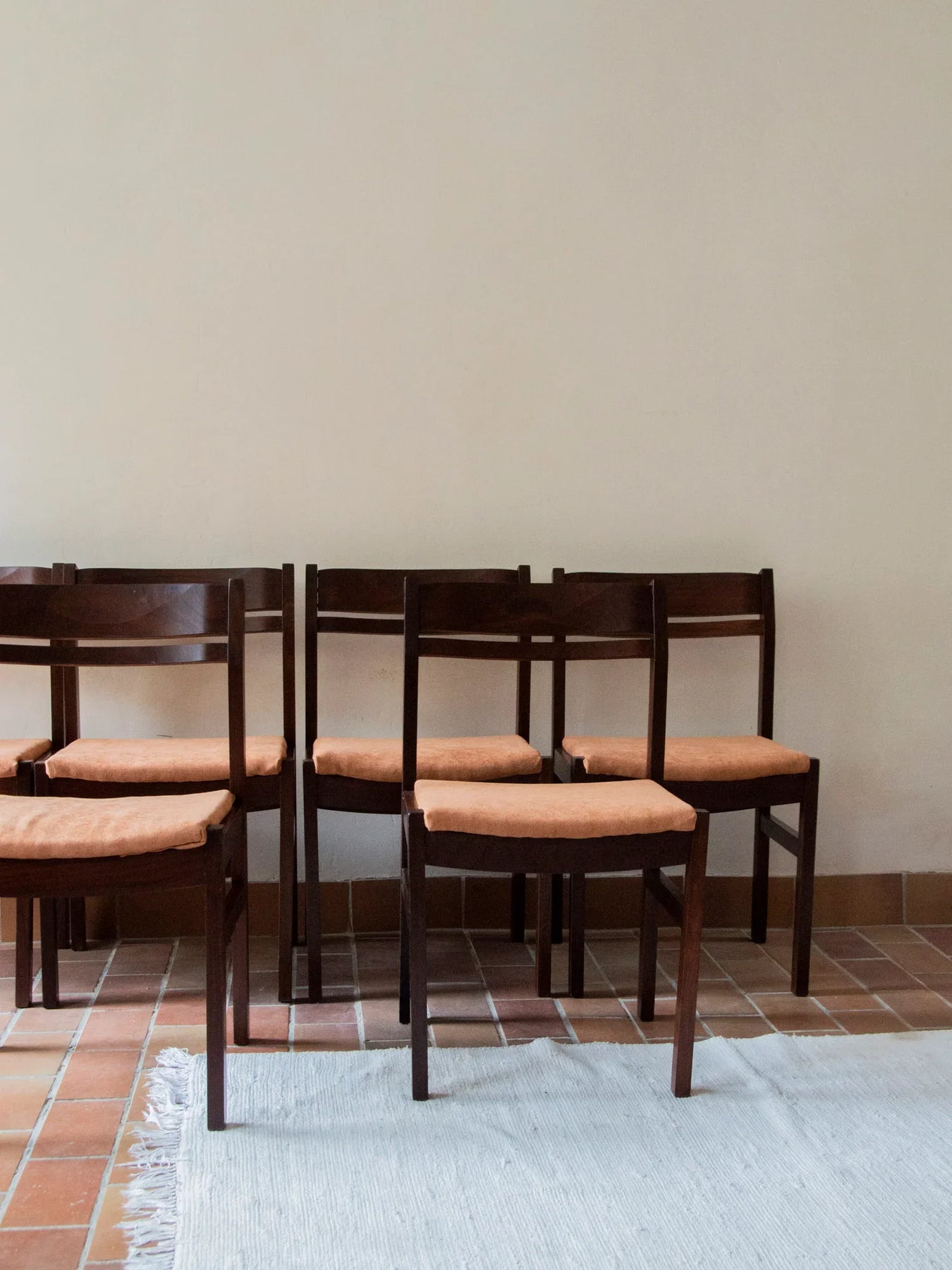 Add a touch of retro charm to your home with this set of six vintage solid wood chairs, beautifully upholstered in peach-colored velvet. Their understated yet elegant design draws inspiration from the iconic lines of renowned manufacturers like Baumann, Lübke, and Dyrlund, making them ideal for a mid-century style. Sturdily built and comfortable, these chairs adapt easily to a dining room or contemporary space, while also blending seamlessly with more antique pieces. In excellent overall condition, their frames are stable, and the freshly reupholstered seats ensure optimal comfort.