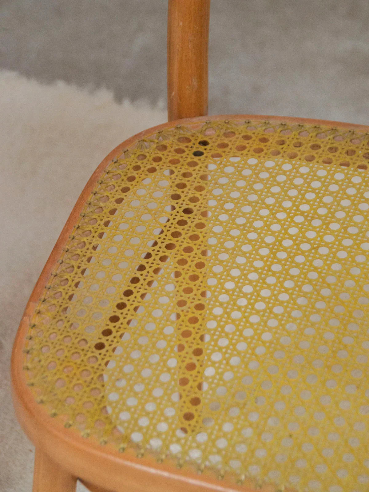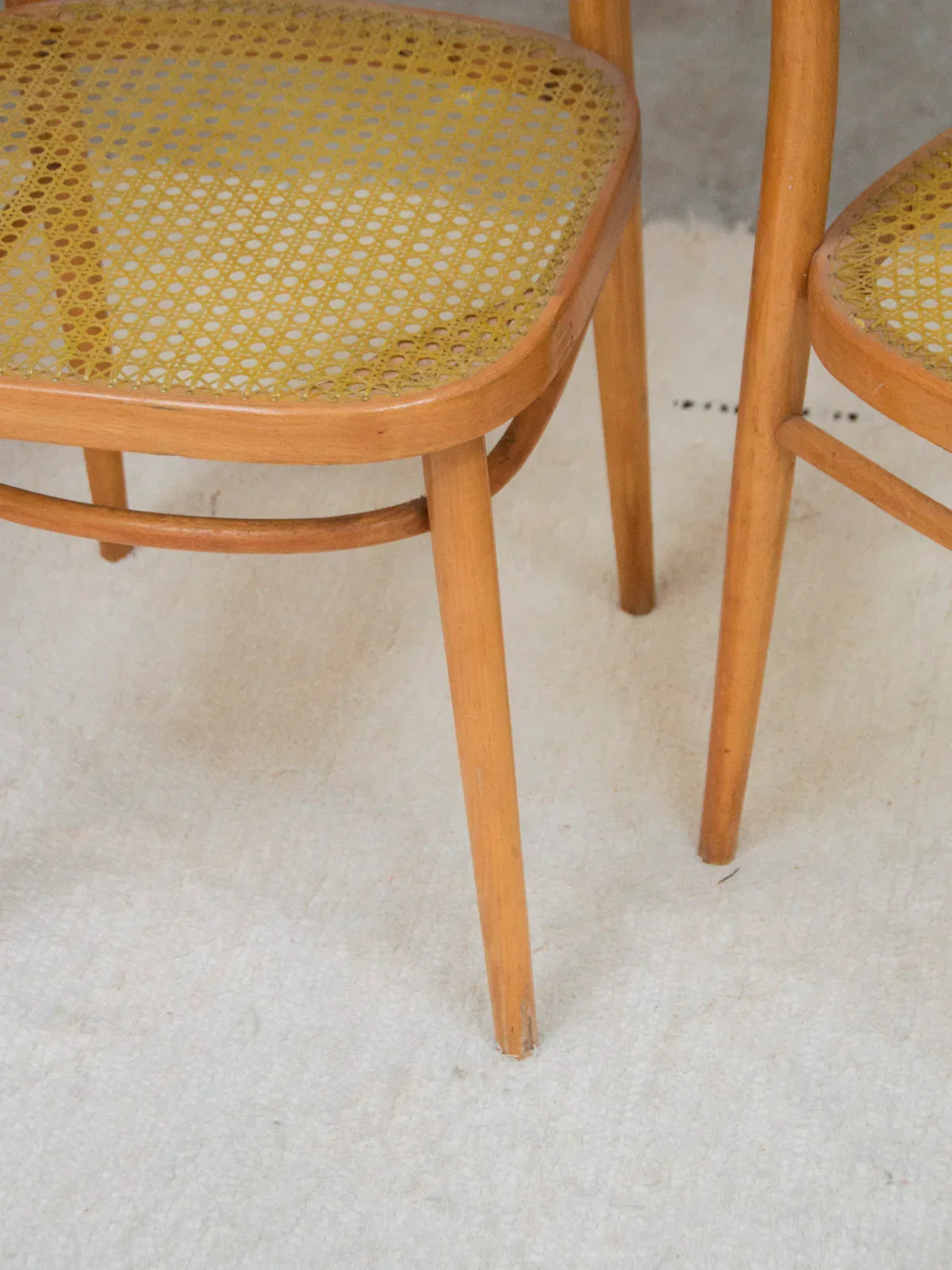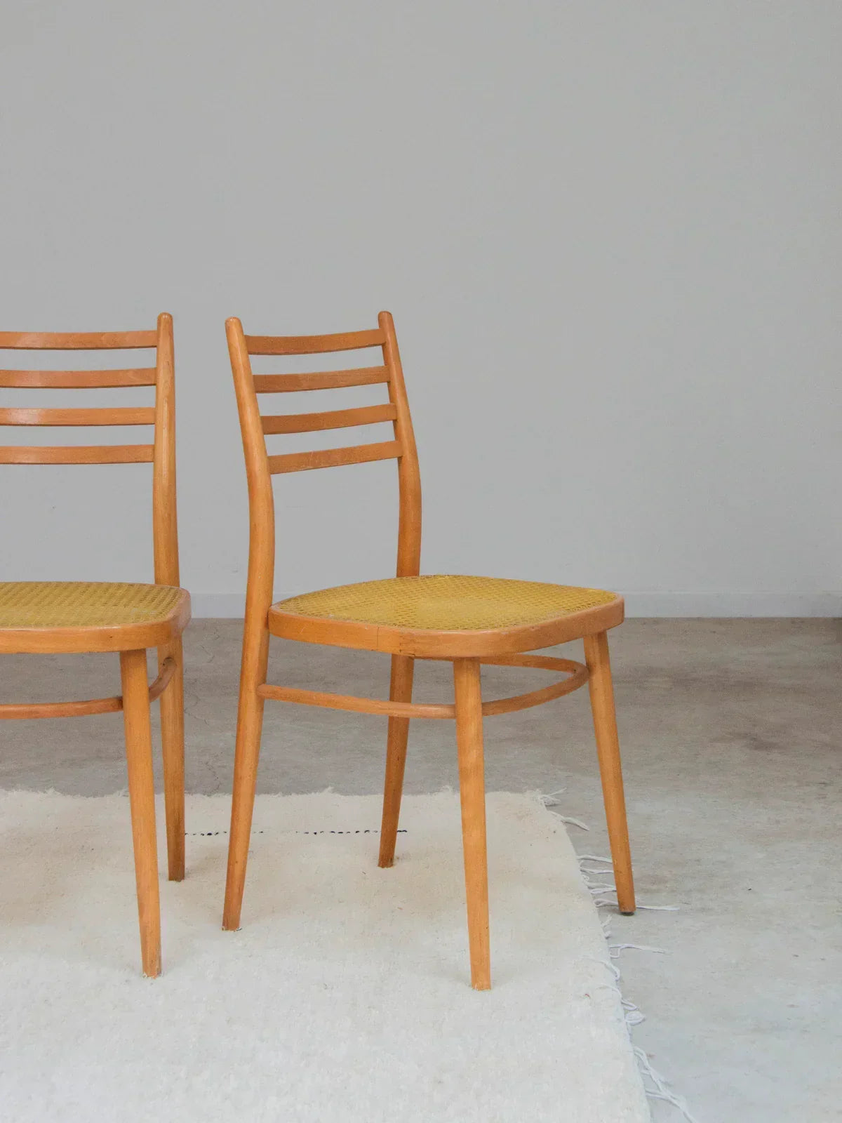 Choose this pair of light wood chairs with a clean design, combining a lightweight frame with graphic backrest bars for discreet support. The yellow cane seats add a warm and contemporary touch, ideal for a bright dining room or a cozy coffee corner. Their compact size makes them easy to arrange in a row or slide under a narrow table, convenient if you want several (4 pairs available for sale). Signs of wear vary between chairs.