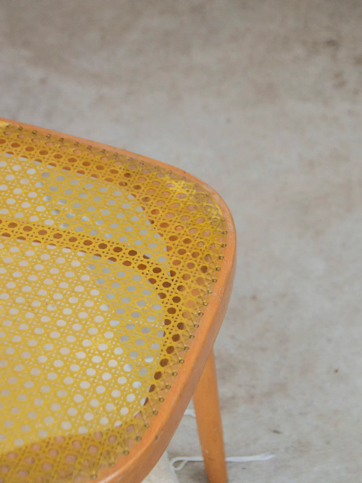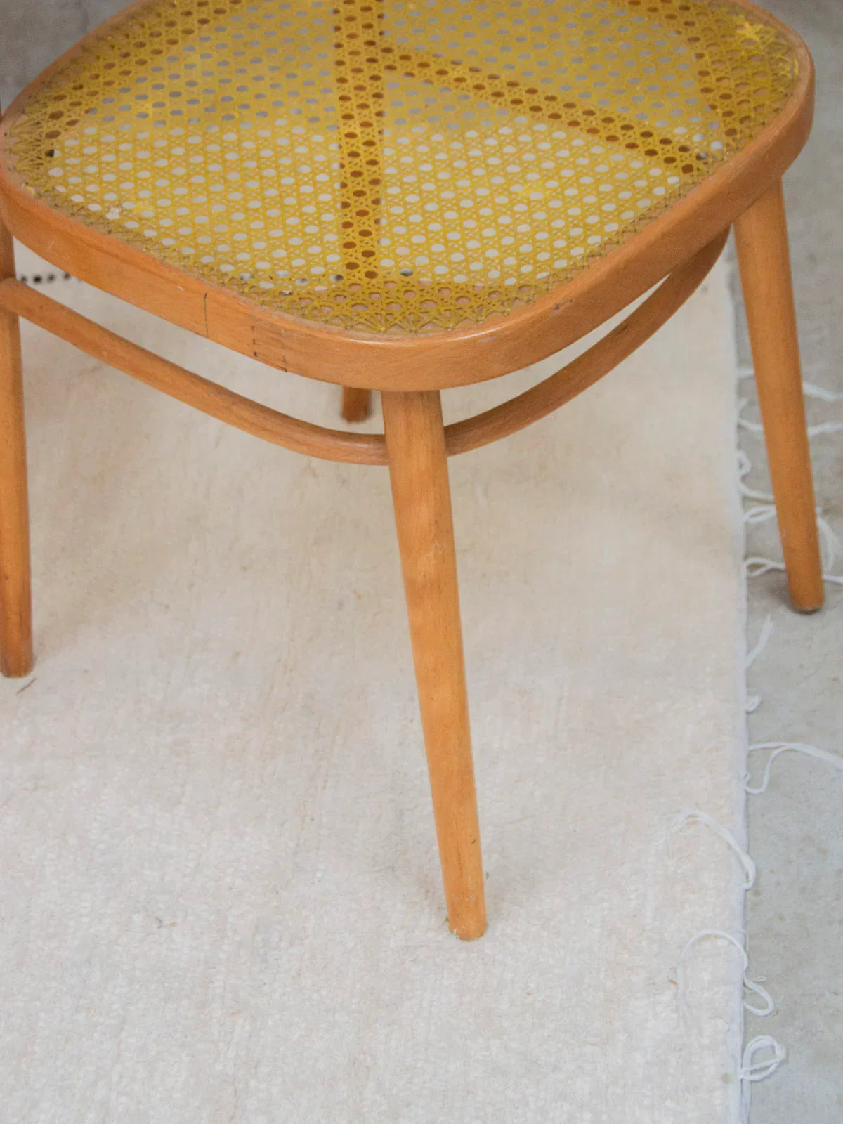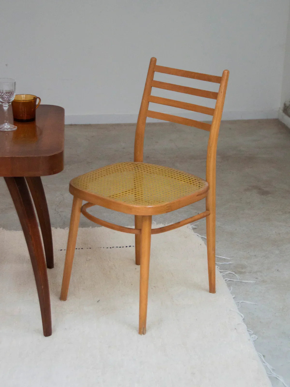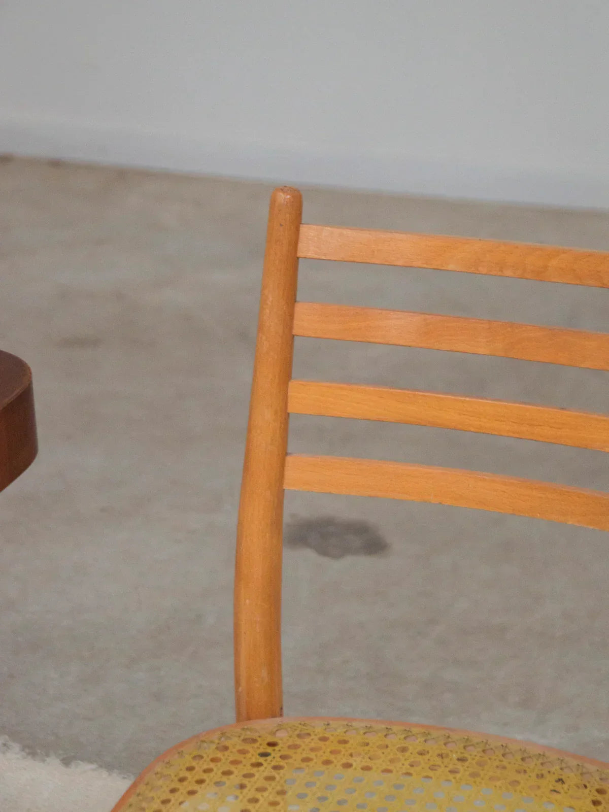 Choose this pair of light wood chairs with a clean design, combining a lightweight frame with graphic backrest bars for discreet support. The yellow cane seats add a warm and contemporary touch, ideal for a bright dining room or a cozy coffee corner. Their compact size makes them easy to arrange in a row or slide under a narrow table, convenient if you want several (4 pairs available for sale). Signs of wear vary between chairs.