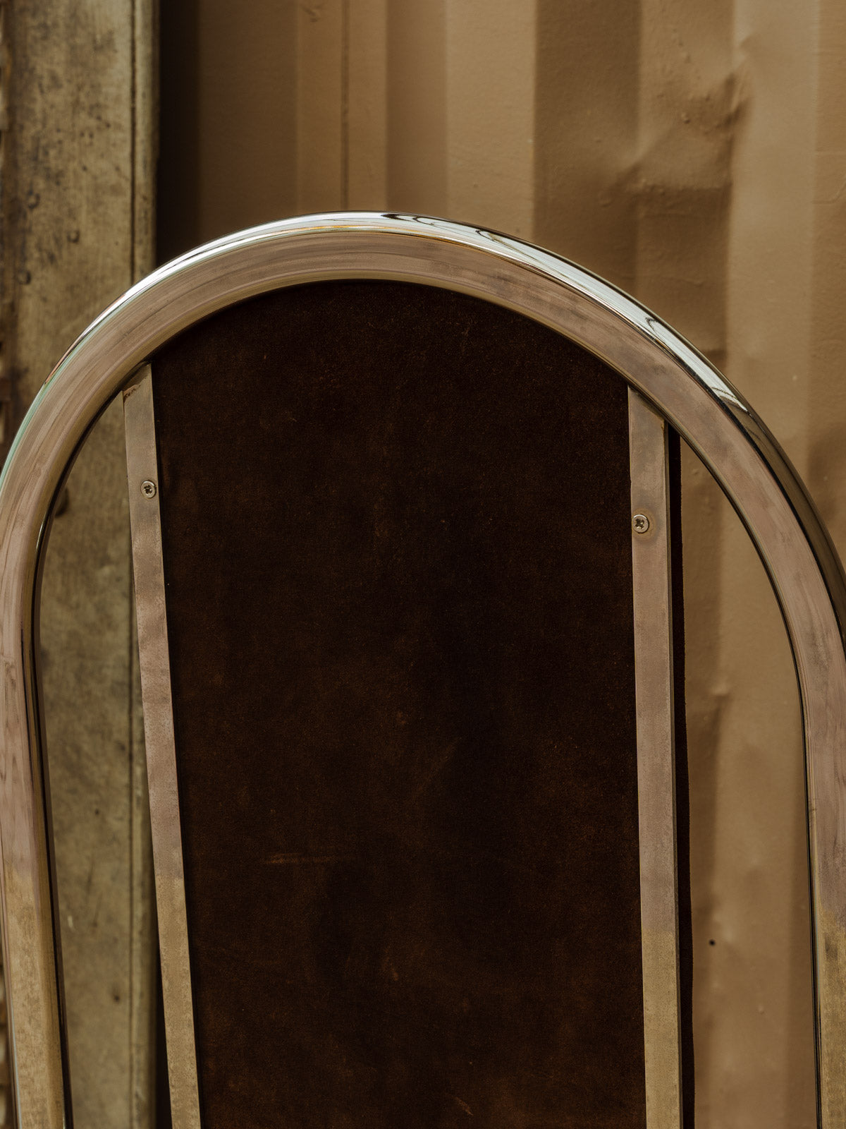 Embrace these vintage-style chrome chairs, upholstered in warm brown velvet for an elegant and contemporary silhouette. The padded seat and back offer natural comfort and proportions perfectly suited to a dining room or home office, while the silver metal frame adds a graphic and luminous touch. They blend seamlessly into a simple and inviting décor. Some signs of wear. Sold in pairs, two chairs available.