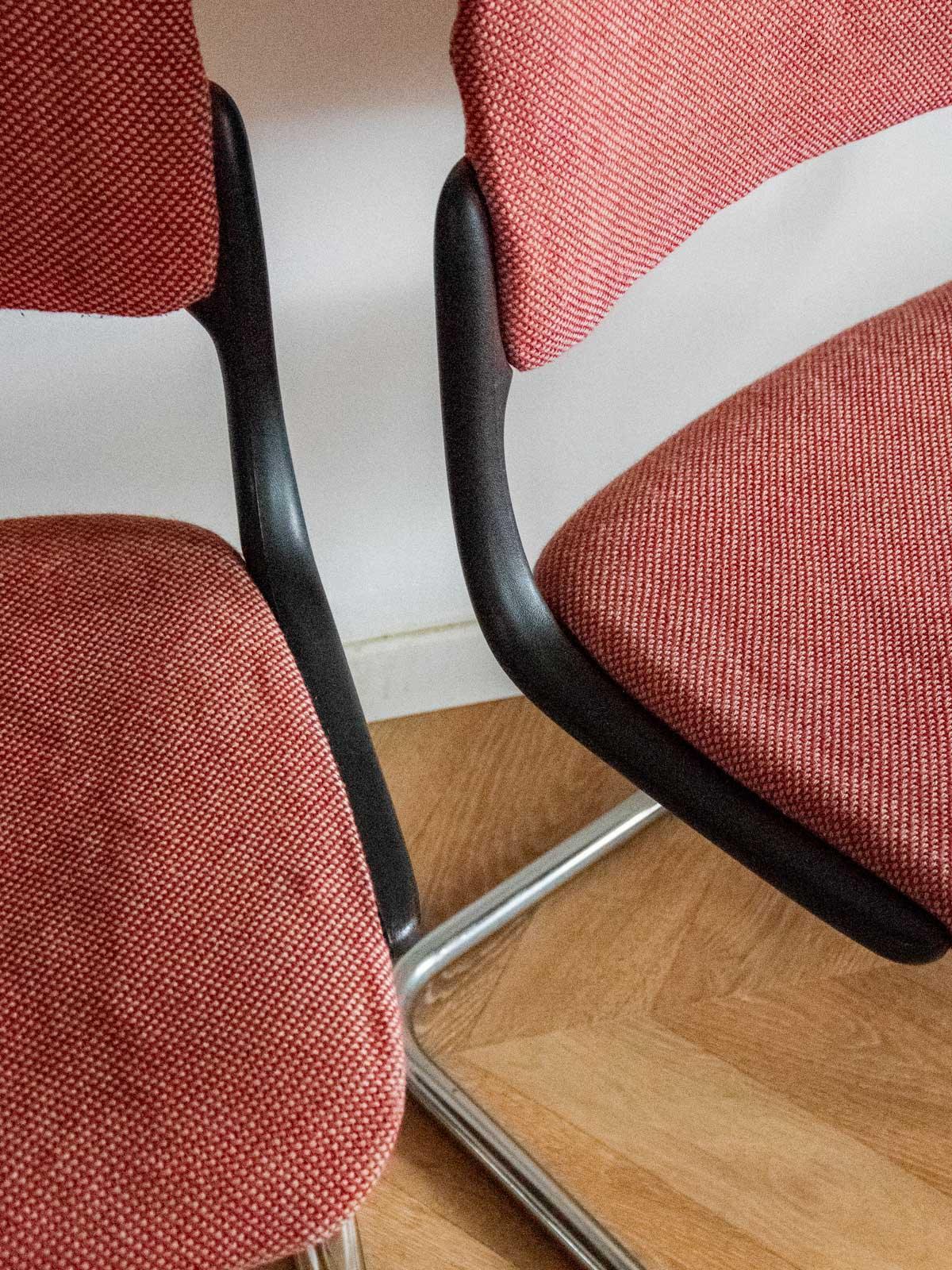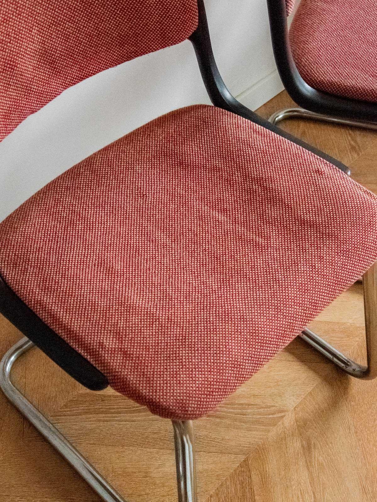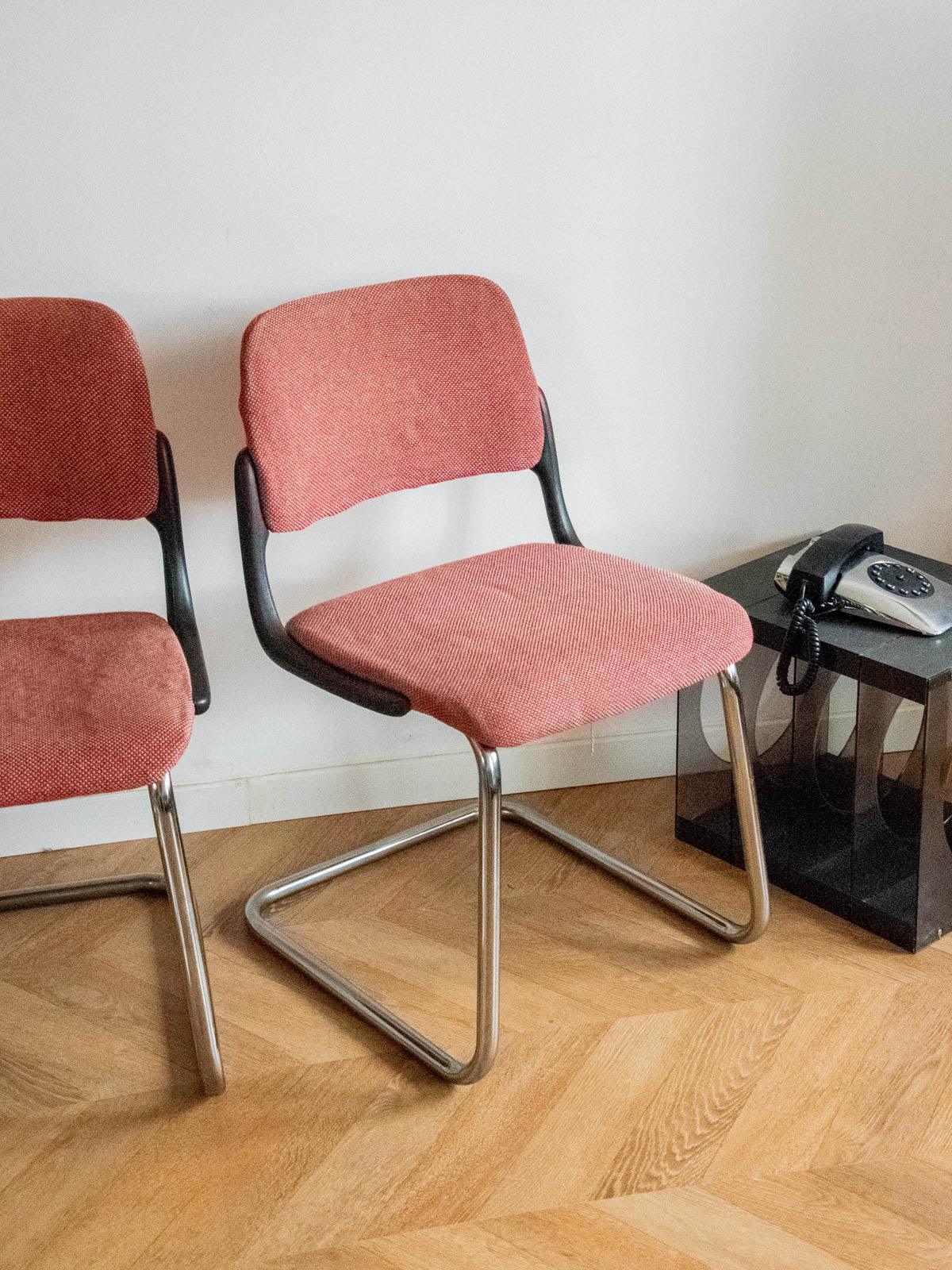 Embrace this pair of contemporary chairs upholstered in their original terracotta rose fabric and supported by chrome tubular legs. Their comfortable seats and compact proportions make them ideal around a dining table, in an office, or in a reading nook, adding a touch of presence without being obtrusive. The slender silhouette and the interplay between the warmth of the velvet and the gleam of the chrome create a warm and inviting retro-chic atmosphere in your home.