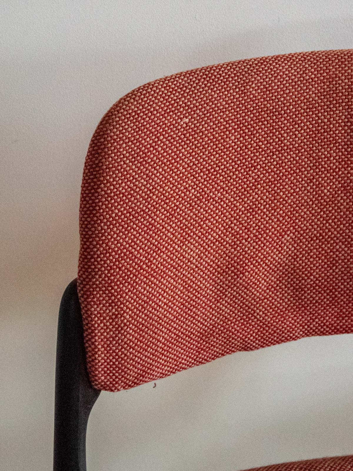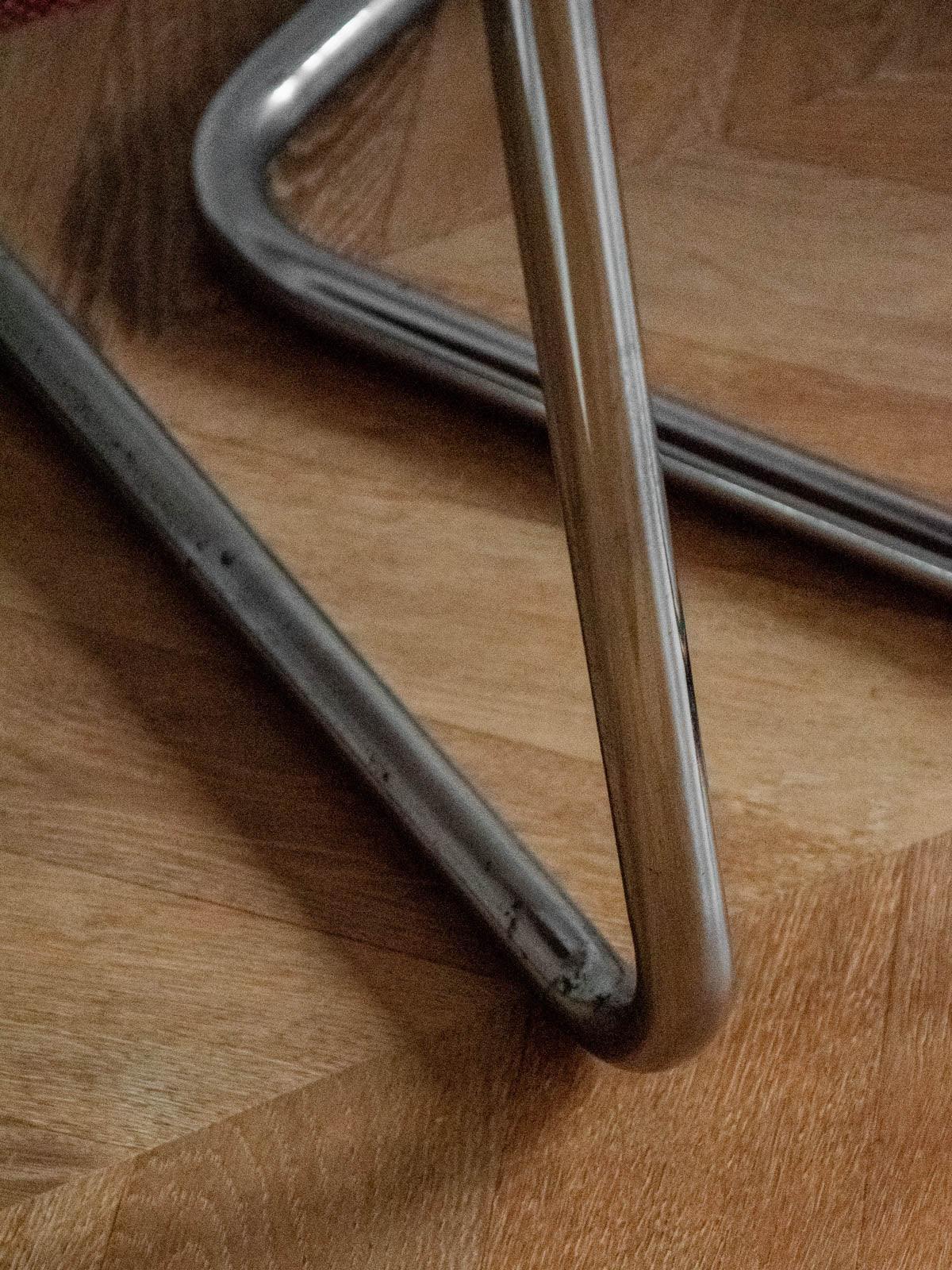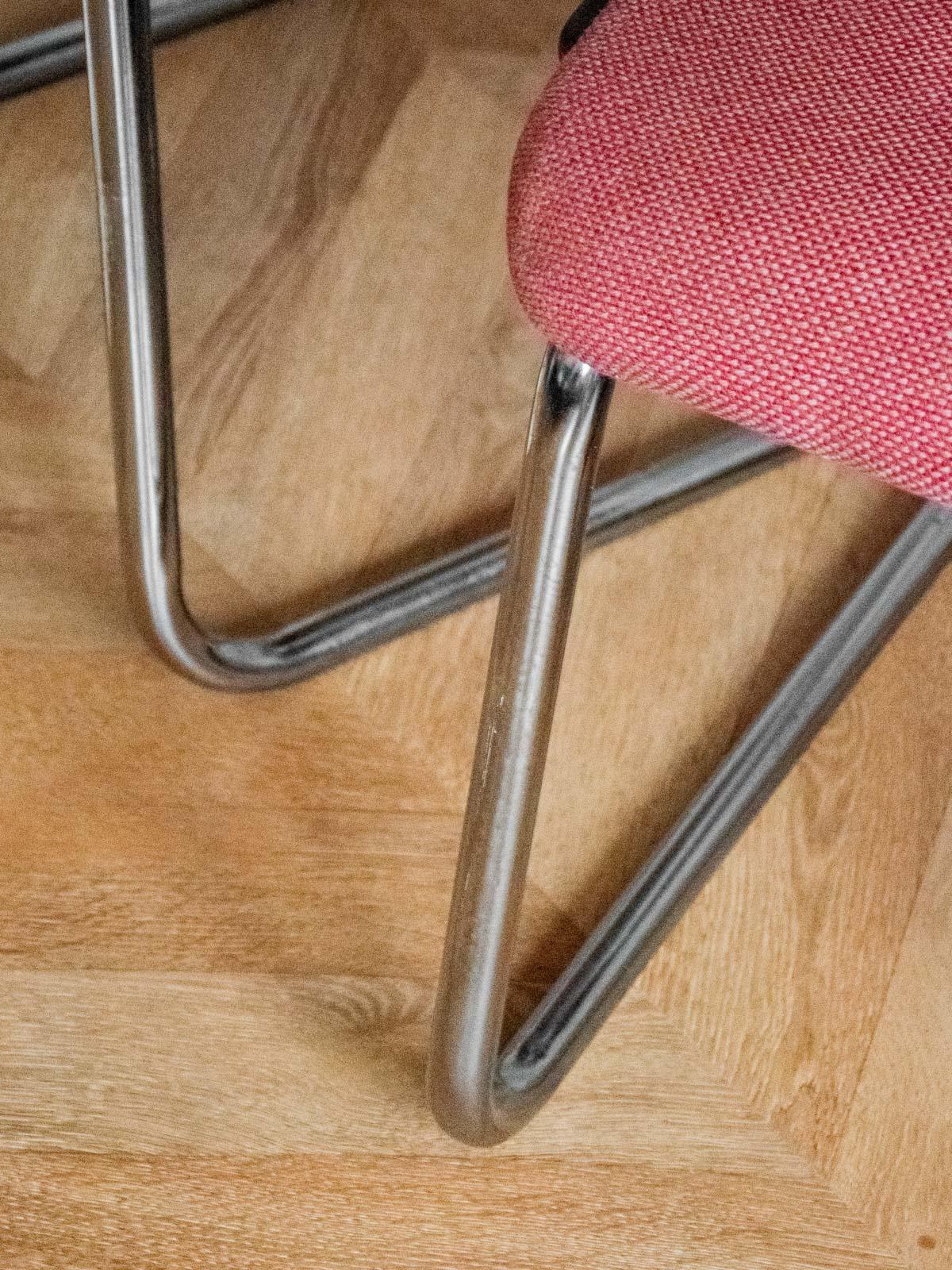 Embrace this pair of contemporary chairs upholstered in their original terracotta rose fabric and supported by chrome tubular legs. Their comfortable seats and compact proportions make them ideal around a dining table, in an office, or in a reading nook, adding a touch of presence without being obtrusive. The slender silhouette and the interplay between the warmth of the velvet and the gleam of the chrome create a warm and inviting retro-chic atmosphere in your home.