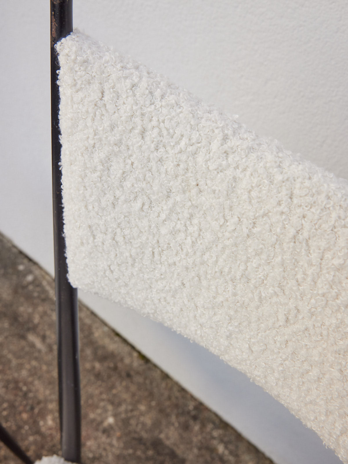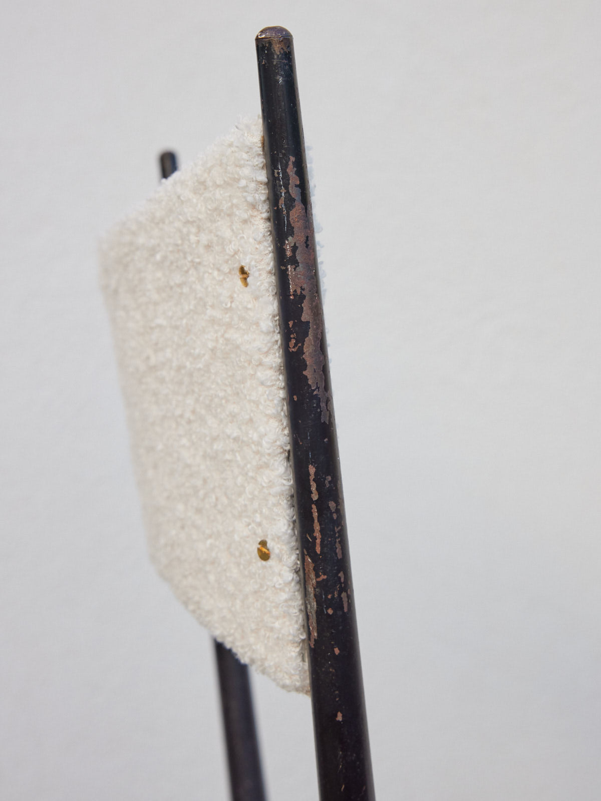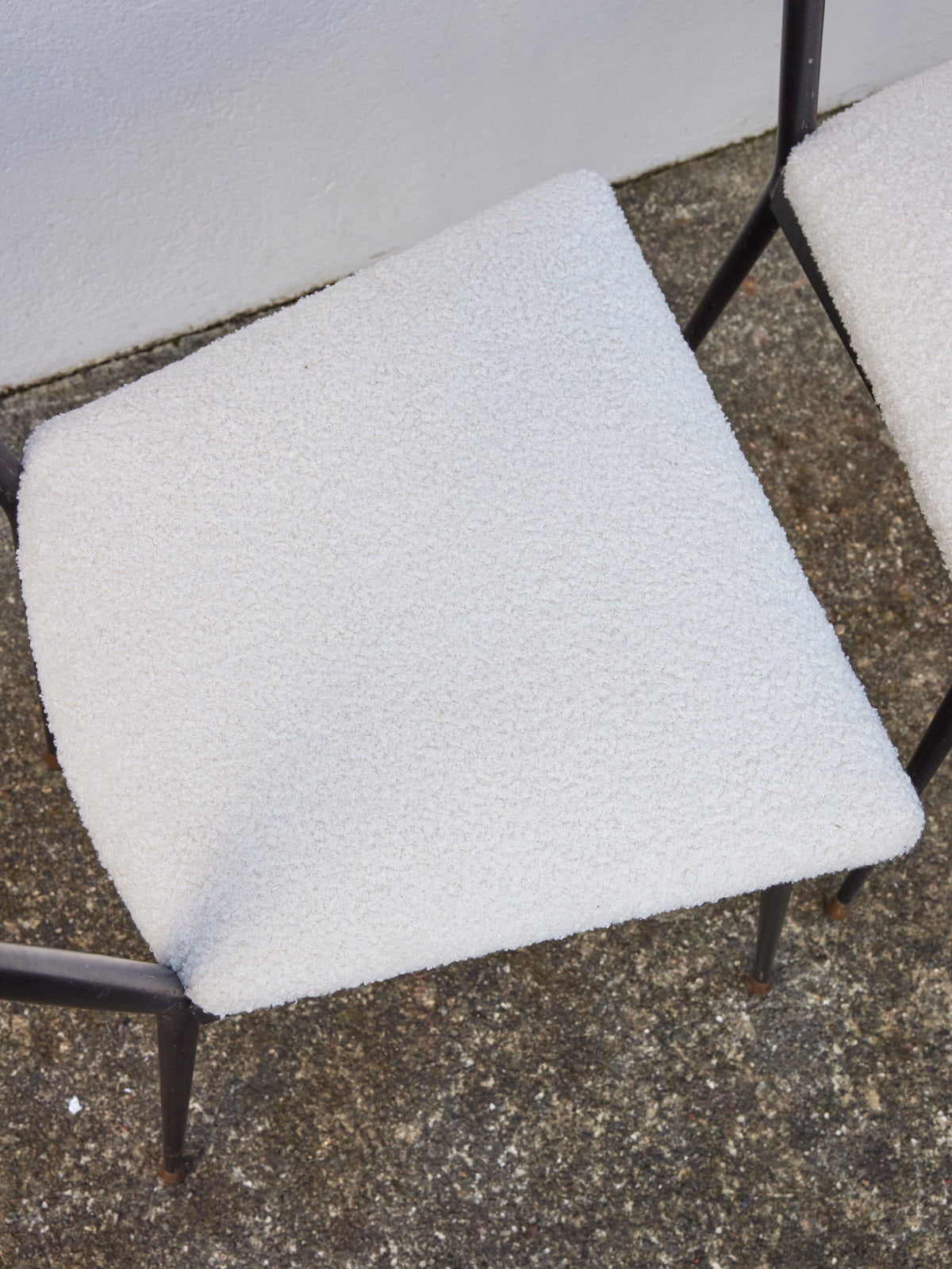 Embrace this pair of early 1960s chairs, reupholstered in a velvety bouclé fabric that brings a soft, warm texture to any room. Their metal frame ensures a light silhouette and stable seating, while their balanced proportions make them equally at home in a dining room, office nook, or living room. Inspired by the style of Colette Gueden and crafted by Achille Decommère, they embody a reinvented retro elegance.