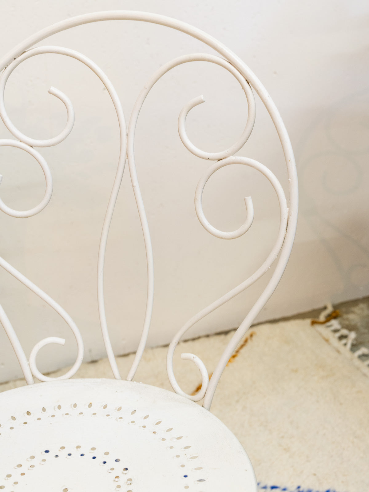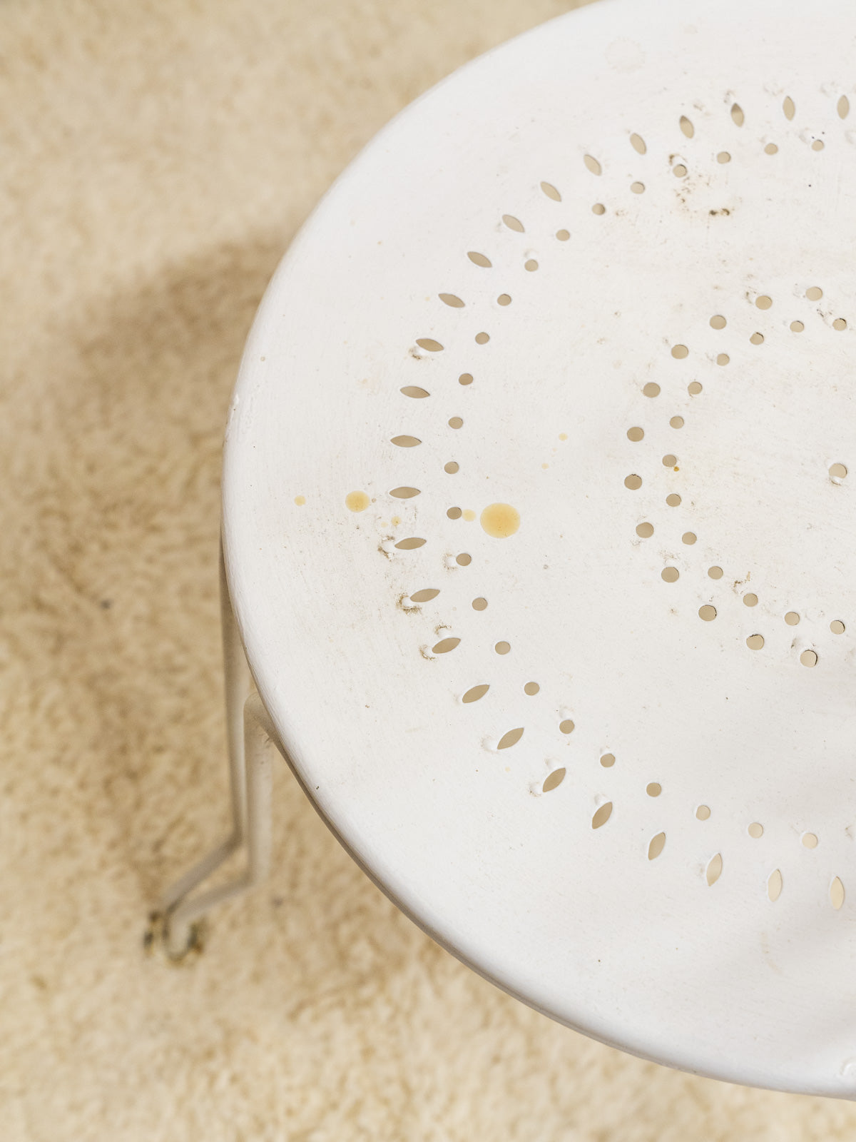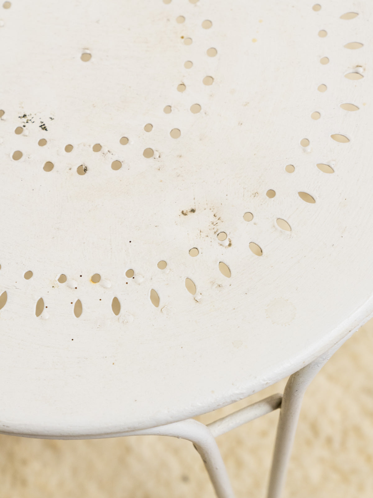 These two white metal chairs with their openwork design and perforated seats play delicately with the light. Their metal frame provides stable and comfortable seating for a dining area, patio, or workspace. The clean, graphic silhouette blends seamlessly into both contemporary interiors and inviting outdoor spaces, adding a touch of refined elegance. Some signs of age are present.