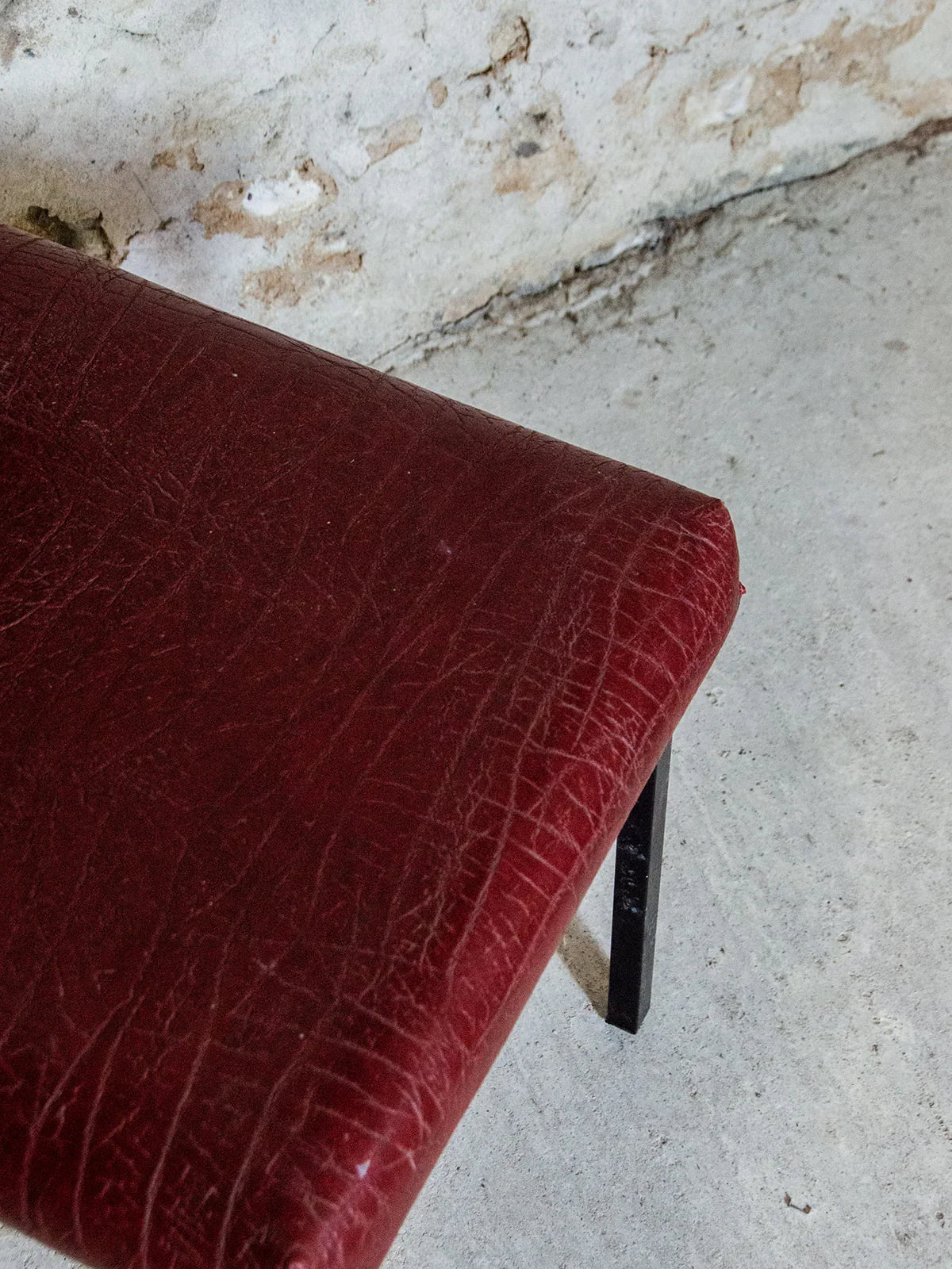 Bring a retro touch to your home with this vintage-look chair, combining black metal and red crocodile-effect vinyl. Sturdy and comfortable, it fits perfectly into an industrial or vintage setting. Its seat and backrest are in excellent condition, without any snags or defects. The metal frame shows some signs of age, which add to its authenticity. A piece full of character to enhance your decor. Sold individually, four quantities are available!