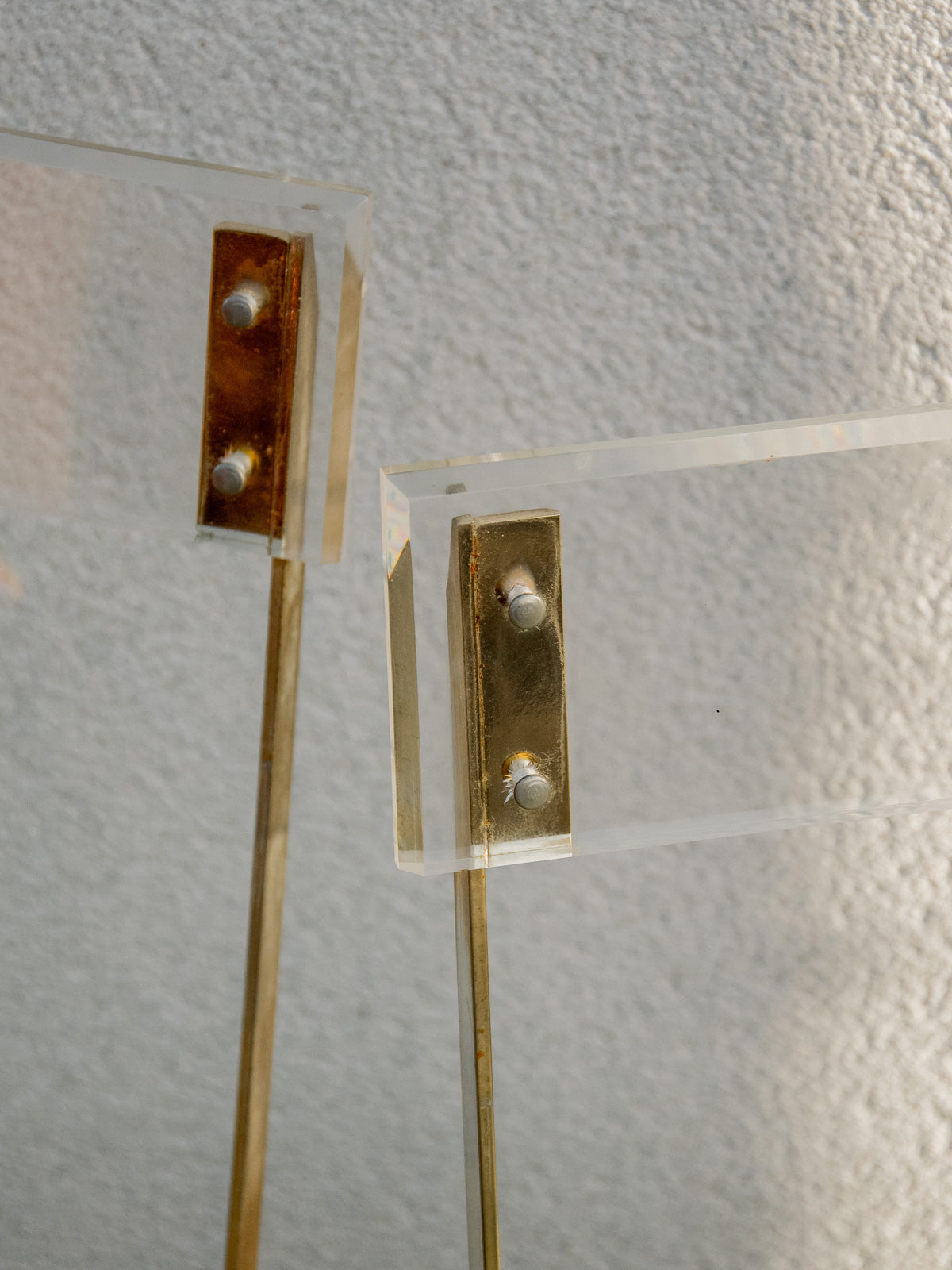 Embrace this pair of folding chairs attributed to Yonel Lobovici, whose thick plexiglass frame and brass structure create a look that is both airy and structured. The transparent profile and clean lines offer a visually light feel, while the clever folding mechanism makes storage and everyday use easy. Perfect for adding a touch of refined vintage style to a dining area or office. Some minor signs of wear, a patina of age.